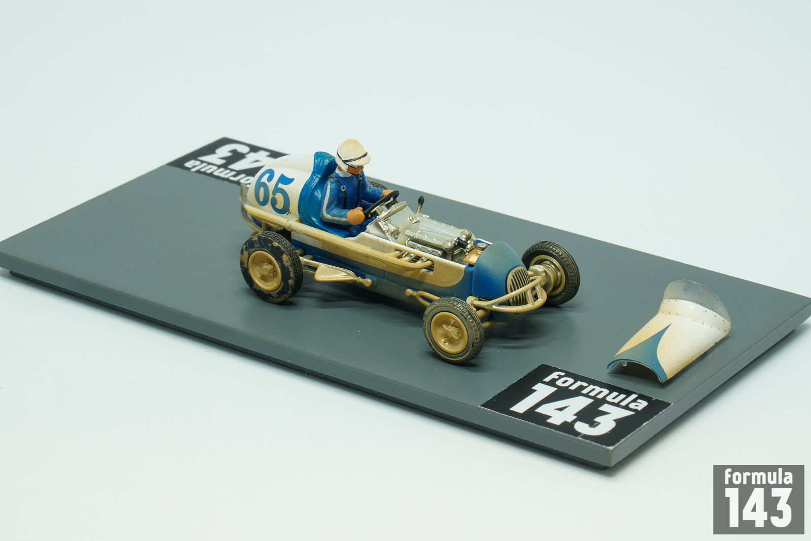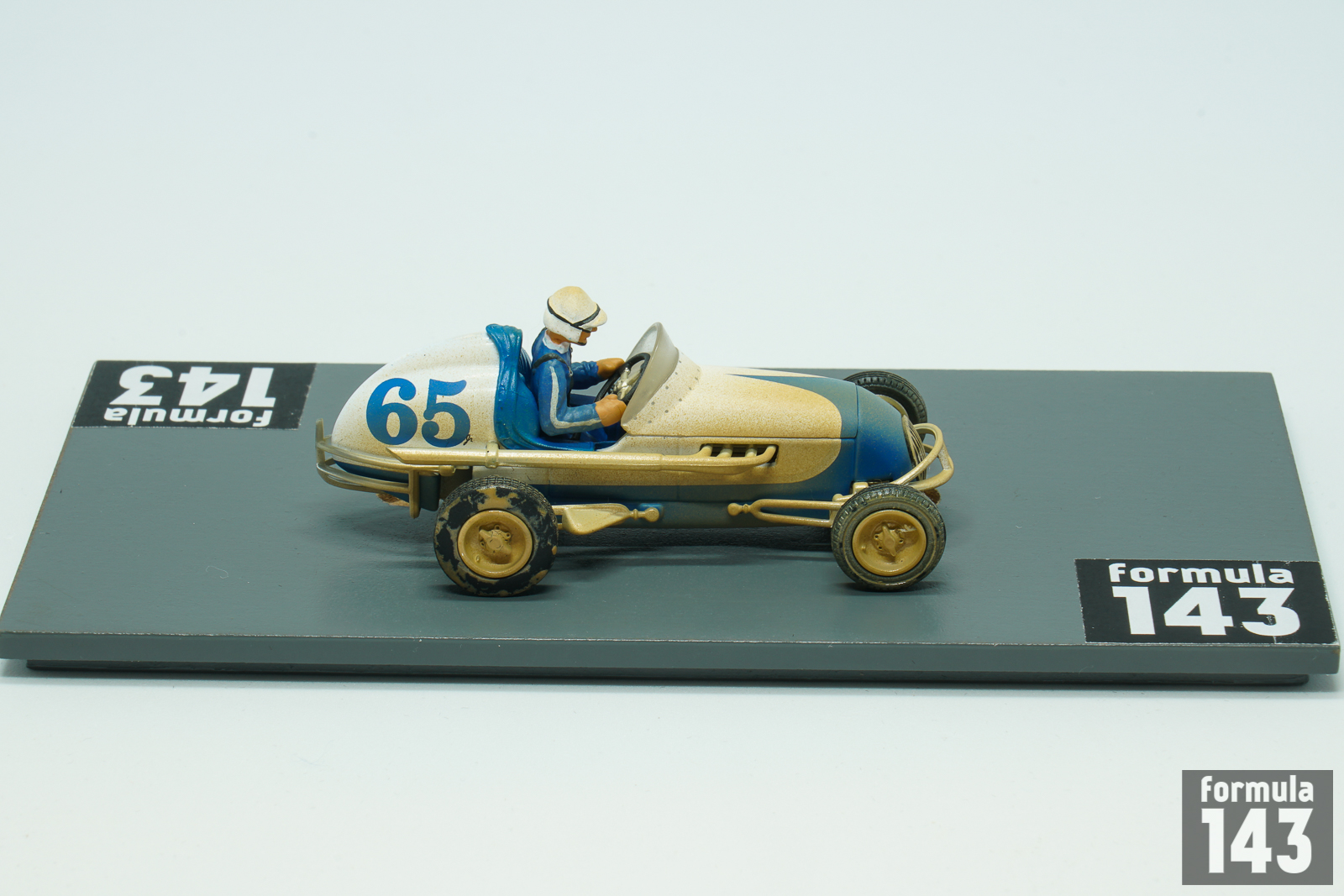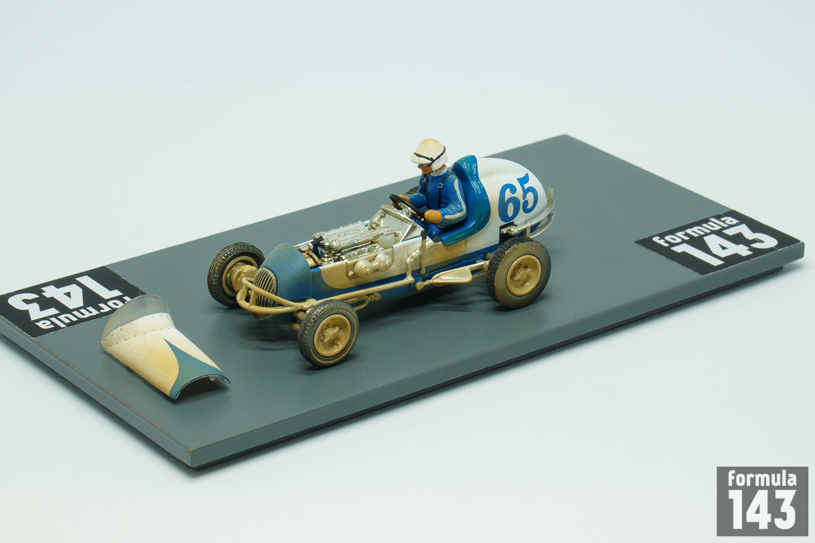 Danny Oakes was born in 1911 in Santa Barbara, California. He began racing in stock cars in 1932, switching to midgets in 1936. Oakes won first post-war Turkey Night Grand Prix at Gilmore Stadium in 1945. In 1947 he won the AAA Pacific Coast Midget Championship and twelve years later repeated the feat under the banner of USAC 1959 Pacific Coast Midget Championship. In the 1950 Turkey Night Grand Prix in his Kurtis Kraft – Offy midget #65 entered by Fullerton Racing Team, Oaks retired in the 25-miles semifinal. However, he was 3rd at Gilmore midget race of January 1st. Oaks continued racing midgets for 25 years until the 60s. After the sanction of the National Midget Championship went from AAA to USAC in 1956, Oaks won three midget events in the USAC National Midget Championship (Detroit and Gailsburg in 1956 and Gardena in 1957). In the 1950s Oaks tried his skills and luck in the big cars as well. He has 6 starts in the AAA National Championship in 1952-1954 with 11th at Springfield in 1954 as his best finish. Oakes failed to qualify for Indy-500 in his three attempts in 1952-54. In 1952 Oakes was entered in Indy-500 with Meyer – Offy and also he stood by as a relief driver for Alberto Ascari in Ferrari. Oaks recalled in one of his late interview in Speedsport Magazine: “I bet I drove 1,300 laps at Indianapolis, but never made the race. One year I was get $500 for being Ascari’s co-driver. I showed up, they disappeared and Ferrari still owes me 500 bucks”. Oakes usually drove in his blue and white jacket, as GMP reproduced it in the scale model.