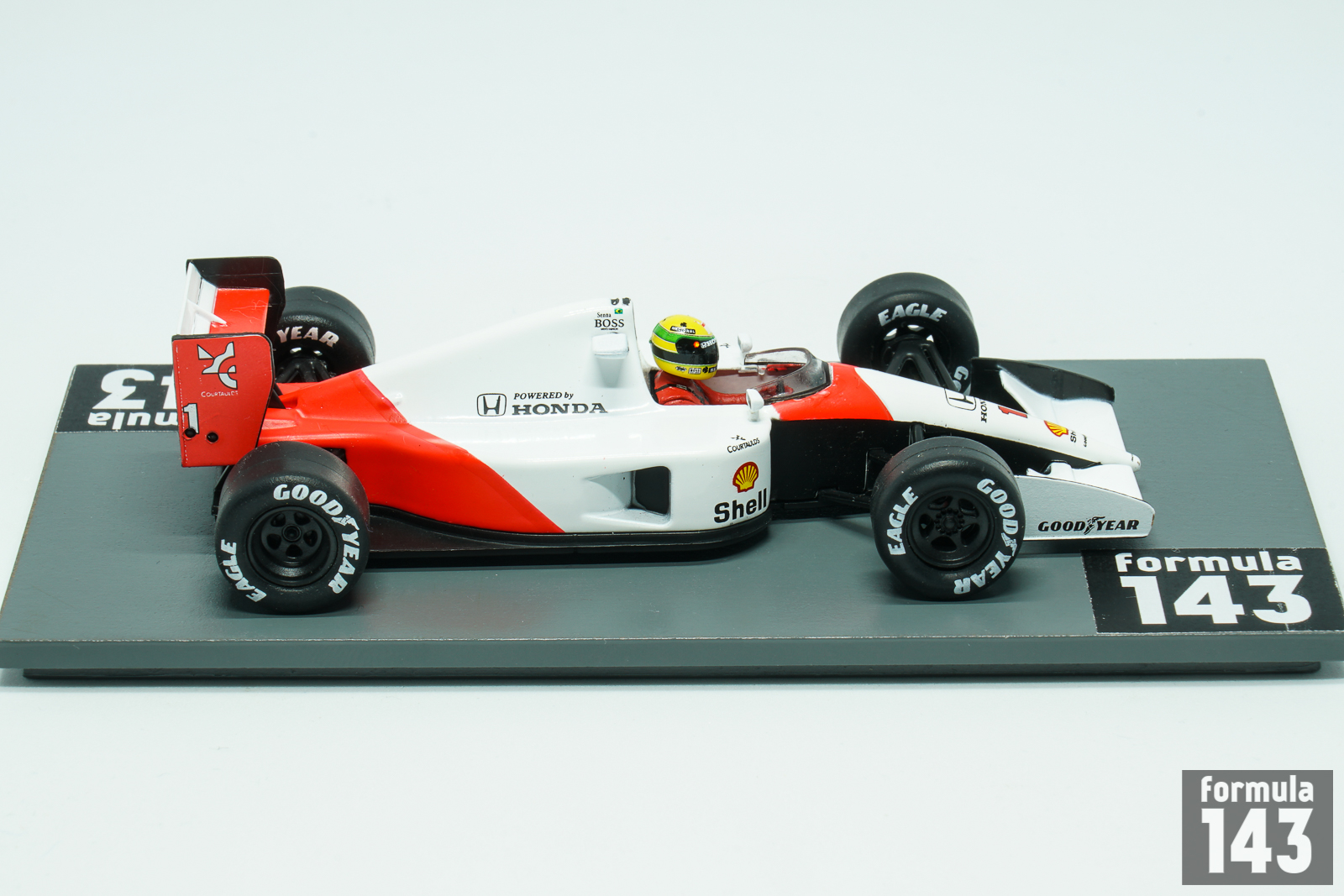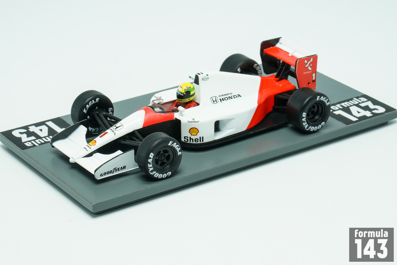 The 1991 season dominator, MP4/6, designed by Neil Oatley, was the first McLaren powered by Honda V12 engine which was capable of 725 bhp. Other new feature of the car was a manual “H” pattern gearbox. A semi-automated transmission was tested during the season, but was considered as not good enough to be used in the race. In 1991 season the MP4/6 in hands of Ayrton Senna won 7 Grand Prix on the road to his third World Drivers’ Championship title. In the modified ‘B’ specification the MP4/6 was used in the first two Grand Prix of 1992 – in South Africa and Mexico. Senna finished 3rd at Kyalami and retired at Mexico City. The car was then replaced with the 1992 car, the MP4/7A.