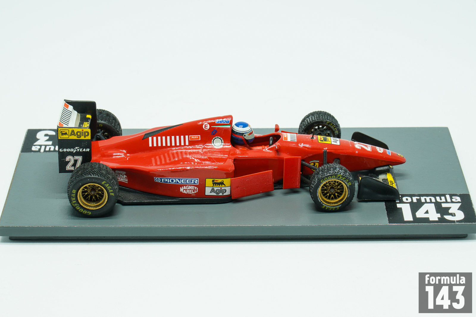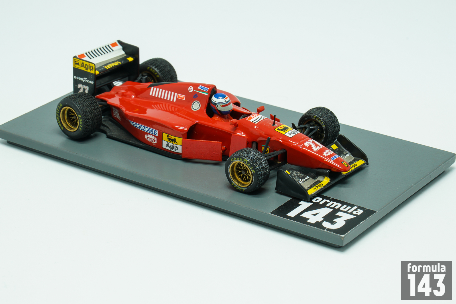 The Ferrari 412 T1 was designed by John Barnard and Gustav Brunner for the 1994 F1 season. It was powered by a 3.5 litre V12 engine. In the name of the new car, the 4 stood for the number of valves per cylinder while the 12 was for the number of cylinders and the T referred to the transverse gearbox with its six normal gears and one reverse. The Ferrari 412T1 was used during the first part of the season, until it was replaced by the 412T1B due to the extensive changes that were made during the season. The Type 41 engine was replaced by the Type 43 in qualifying as of the San Marino GP, and in races as of the German GP in Hockenheim, then already in the 412T1B. The Type 43 engine was a complete new design, done by Claudio Lombardi and Osamu Goto, featuring a wider V-angle between the cylinder banks and a shorter stroke. The car was driven by Jean Alesi and Gerhard Berger, throughout the season, except during the Pacific and San Marino GPs, where Nicola Larini replaced the injured Alesi. The French driver scored 4 podiums with second place in the British Grand Prix as his best finish. Jean was placed 5th in the championship standing with 24 points. Gerhard Berger has performed much better. The Austrian won the German Grand Prix (the only victory for Ferrari in 1994), and scored 3 second and 2 third places. He finished the championship on the 3rd place in the drivers’ table with 41 points. See also the model of 412T1 of Berger from the Ferrari F1 Collection.