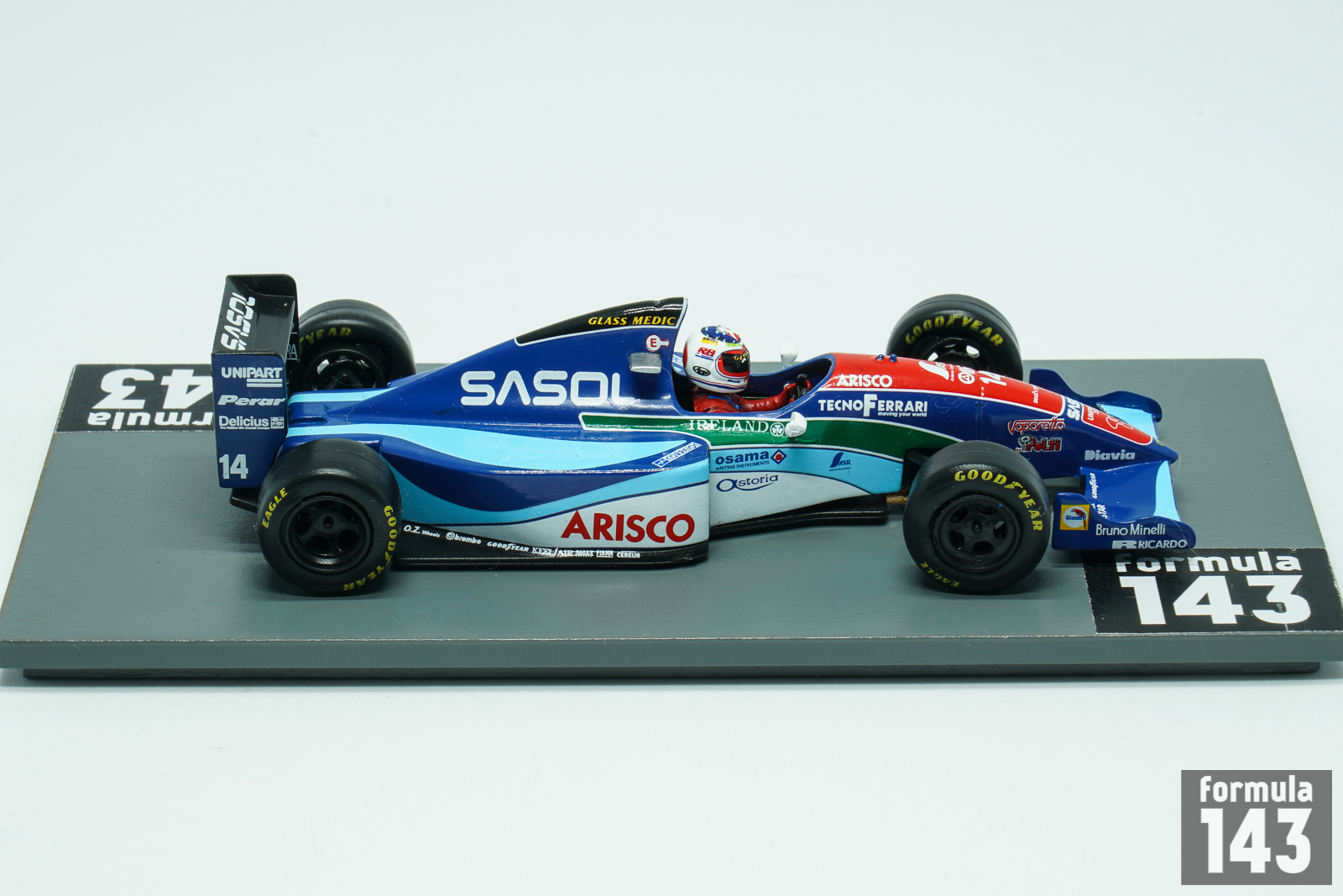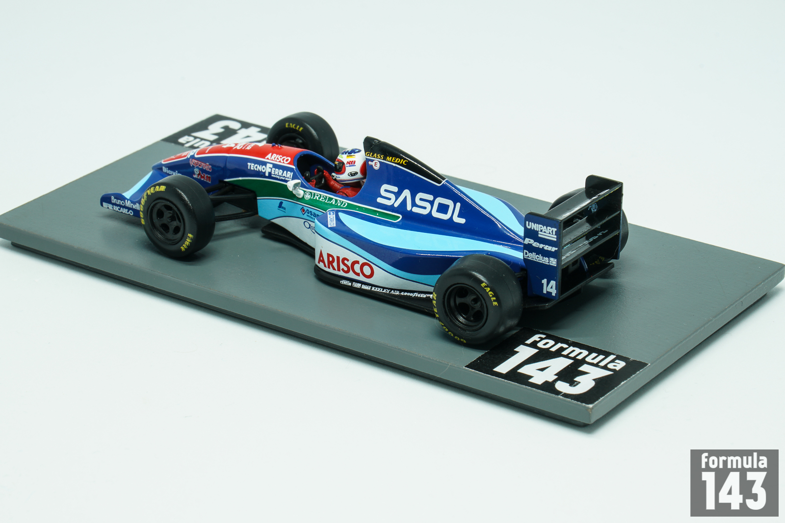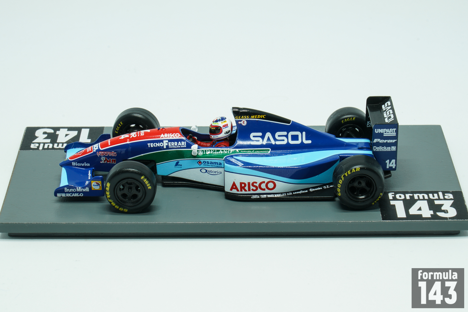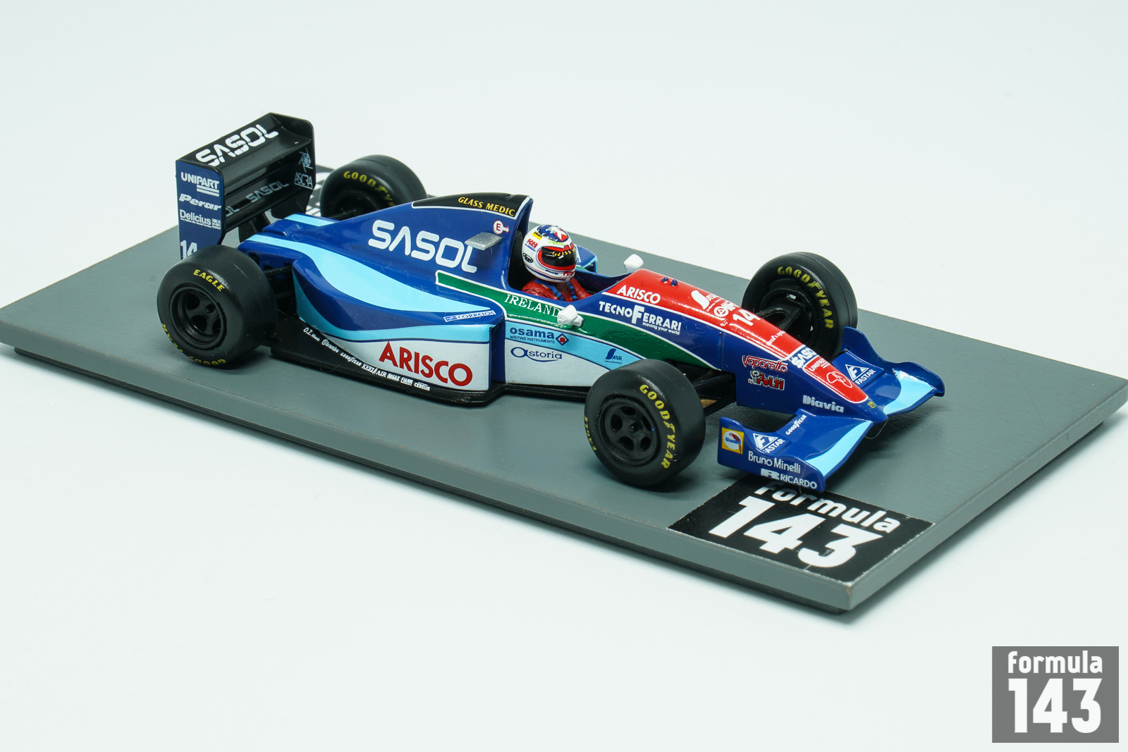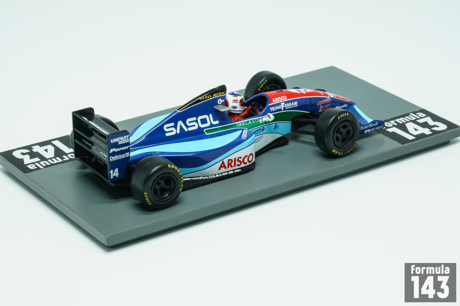 The car designed by Gary Anderson and powered by Hart V10 engine, was driven in the 1994 season by Rubens Barrichello and Eddie Irvine. Rubinho, who drove for Jordan for the second season, started the season with impressive 4th place in Brazil and 3rd in the pacific Grand Prix held at TI Circuit in Aida, Japan. Then he was crashed in a violent accident during Friday practice of San Marino Grand Prix, hitting the wall at the Variante Bassa and flipping the car. Later in the season, he took pole position at the Belgian Grand Prix (became the youngest driver to secure pole position at that time), led some laps at Estoril and scored three 4-place finishes in the last 5 rounds of the season. See also the 194 model of Eddie Irvine by Onyx.