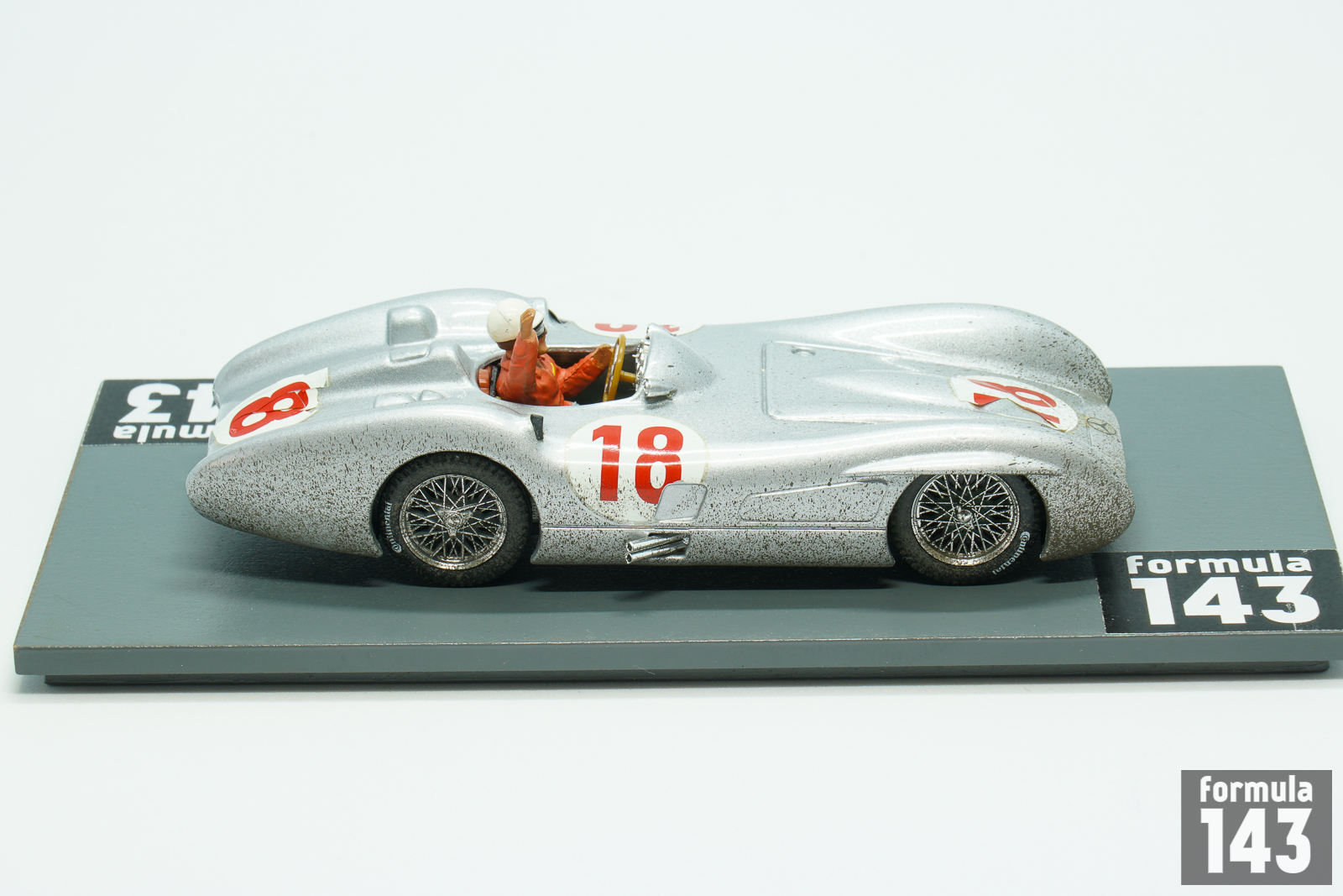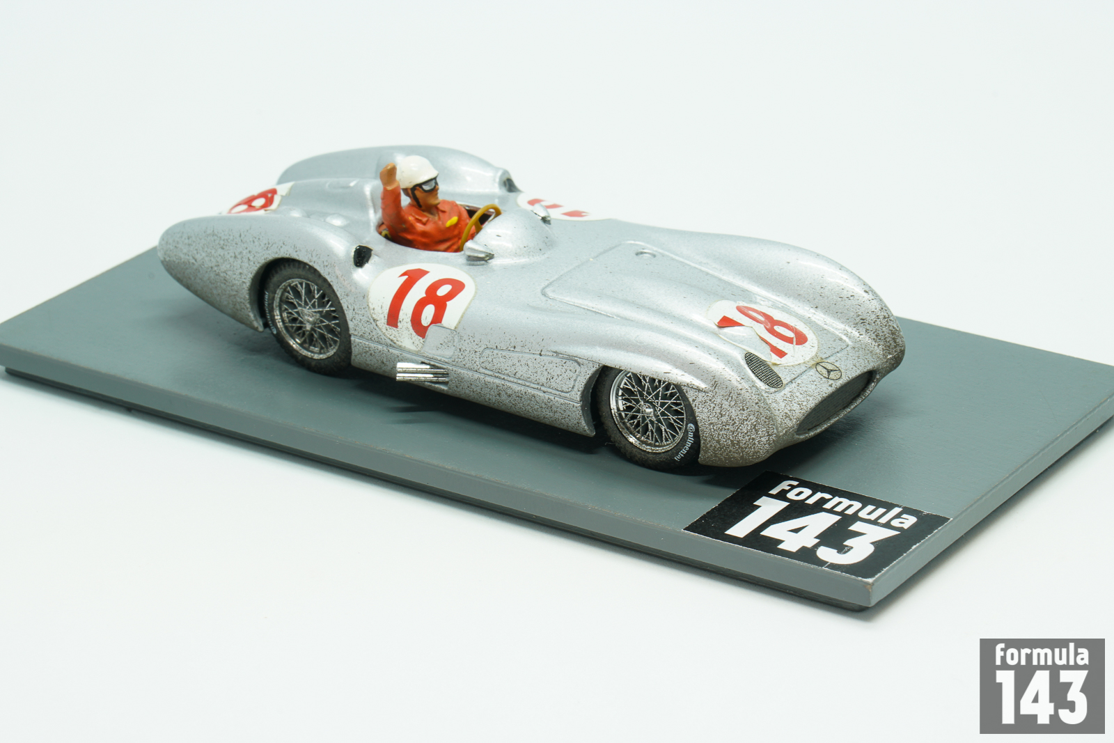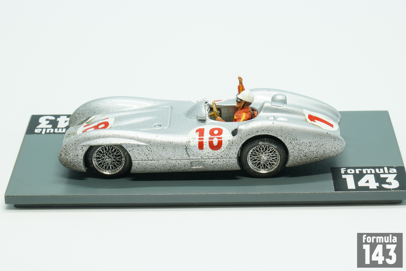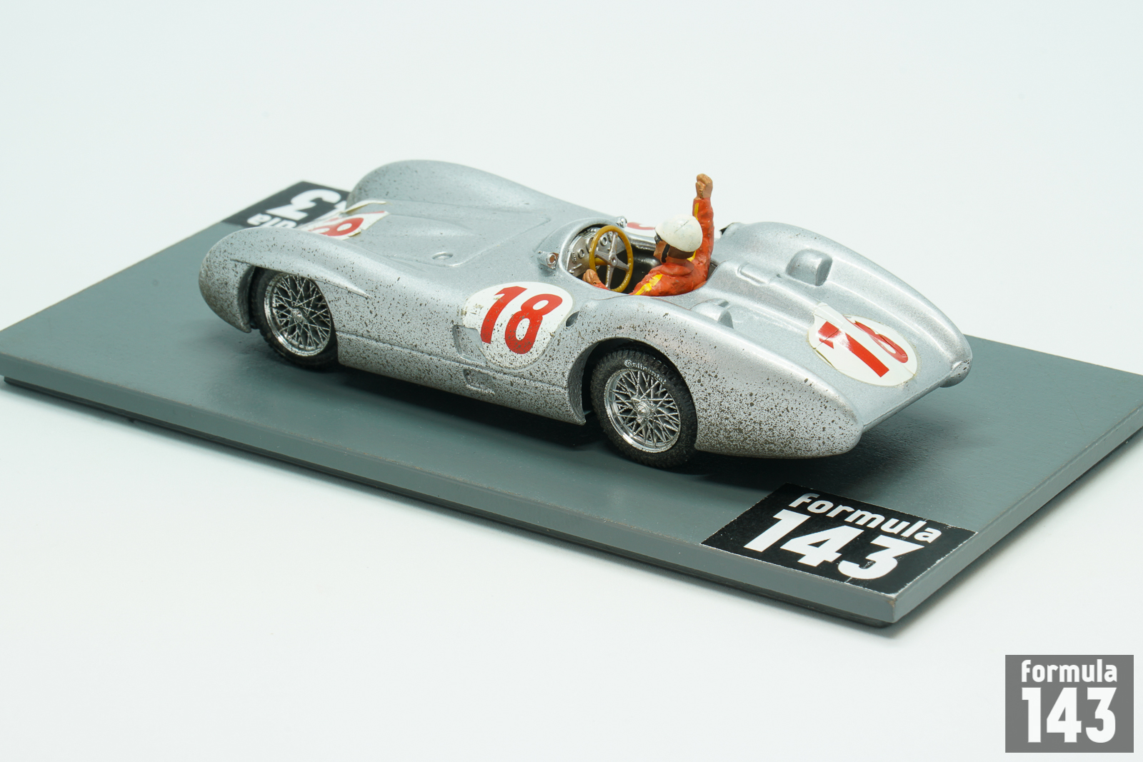 In 1954 Mercedes-Benz came back to Grand Prix racing for the first time since the Second World War. The return was as triumphant as it was short – after easy winning of the 1954 and 1955 World Championships, Daimler-Benz has left the F1 scene for a long time. In 1955 Juan Manuel Fangio won 4 races driving the W196, including season closing Italian Grand Prix. This scale model from Brumm’s Autostory edition represents Fangio’s dirt-stained winning car from Monza after the finish of the race.