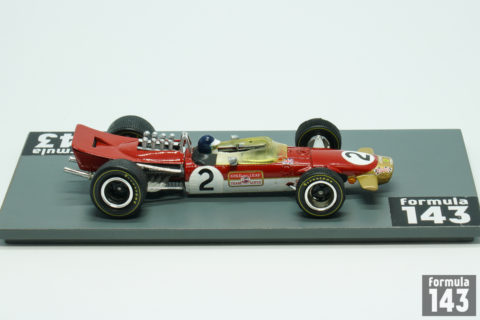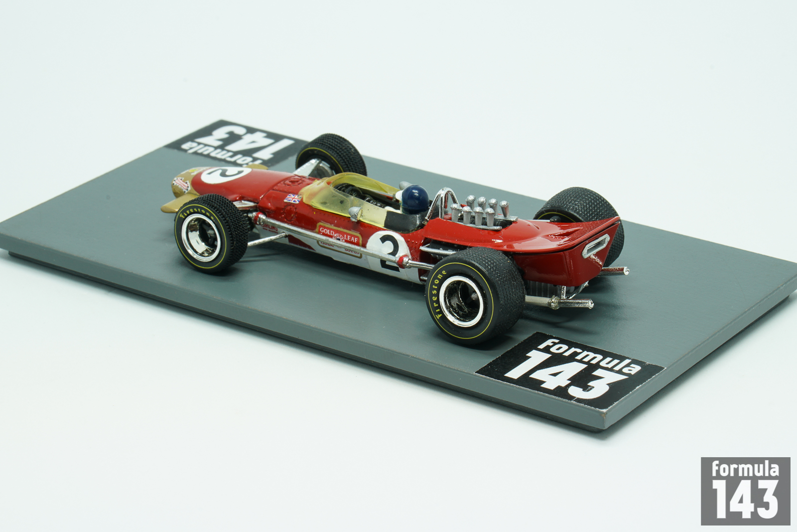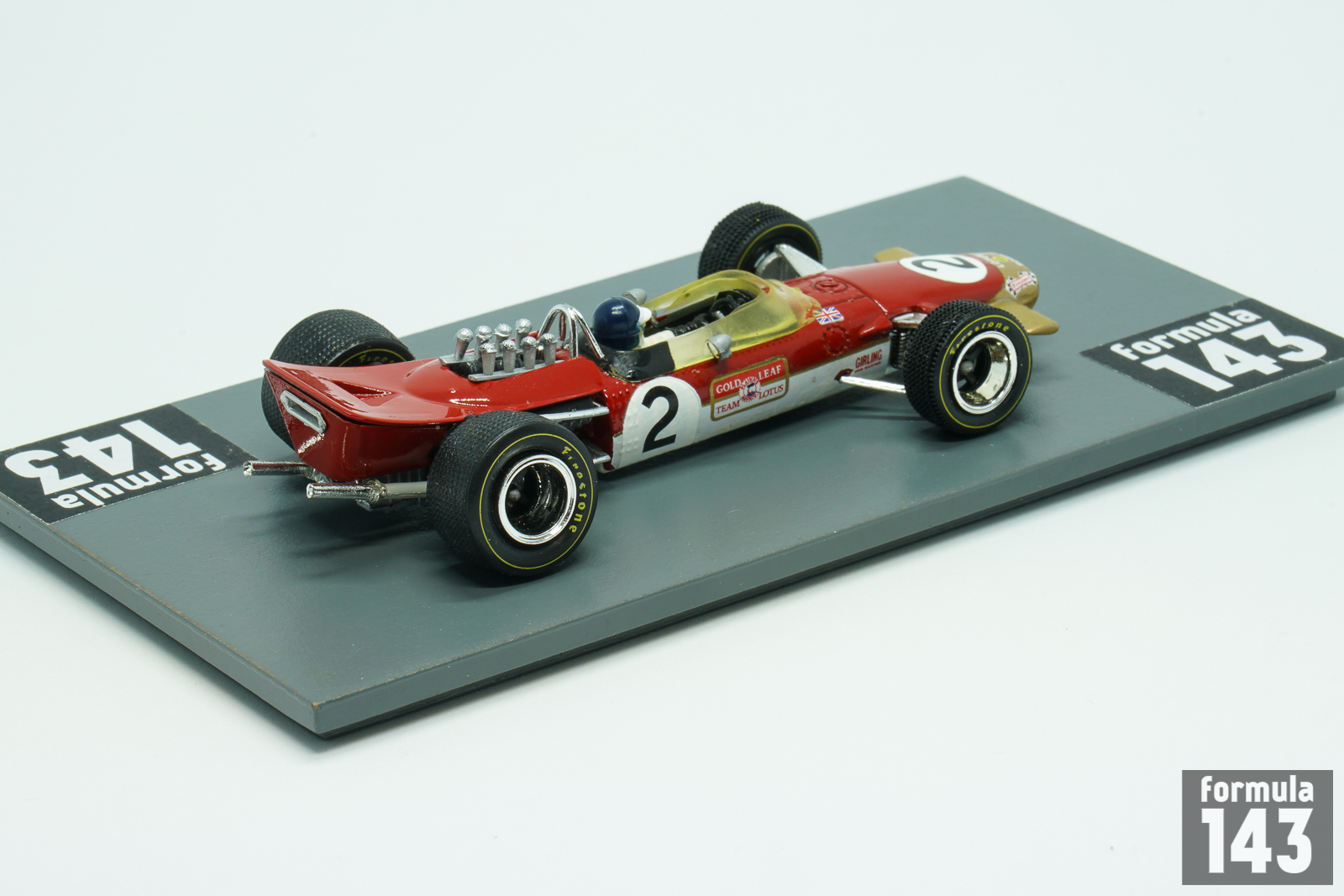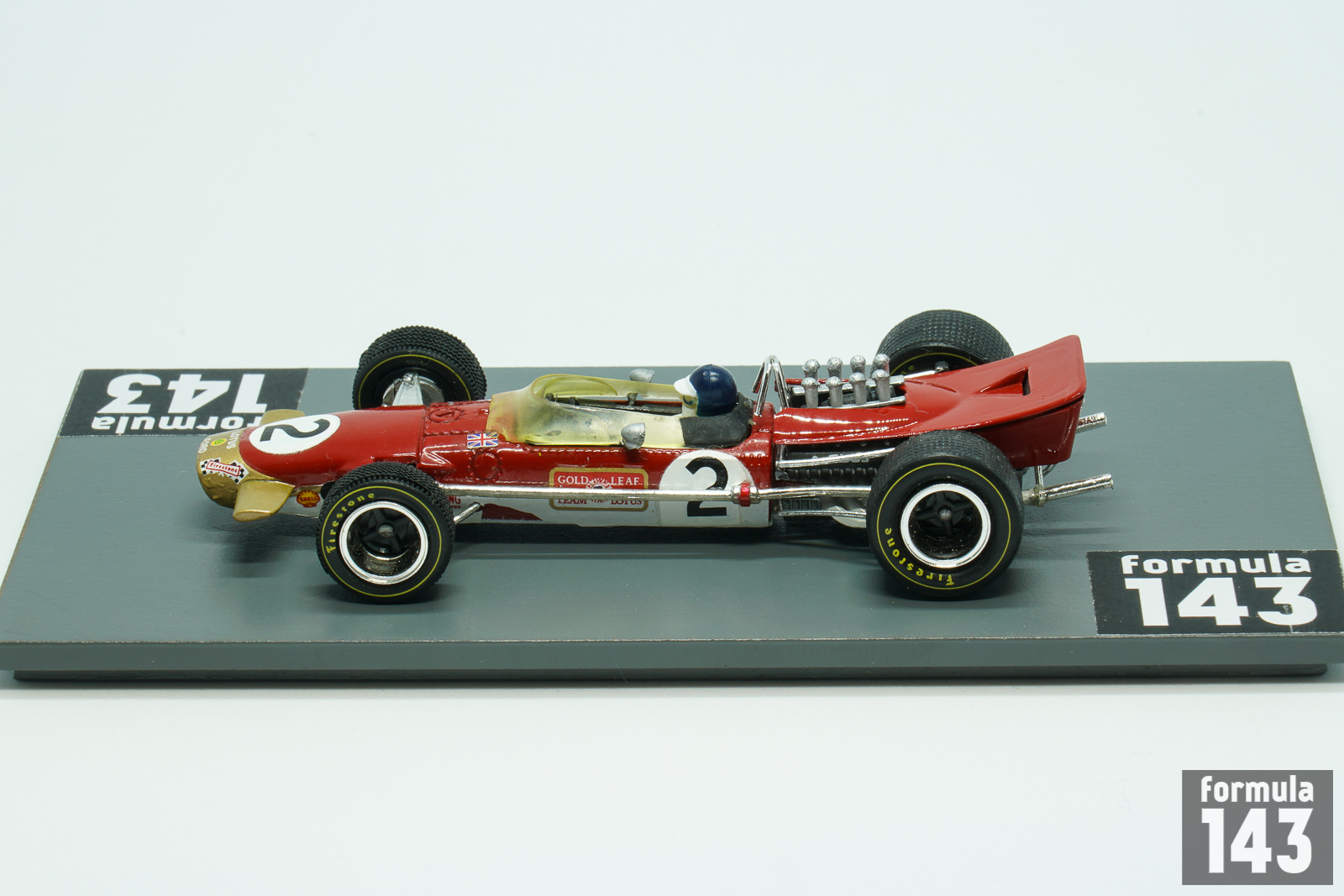 Lotus 49 was introduced by Colin Chapman for the first 3-litre Formula season in 1967. New FIA regulations left many of the independent teams like Lotus and Cooper without an engine. Solving this problem Chapman organized very productive Ford – Cosworth partnership by joining abilities of his old friends Mike Costin and Keith Duckworth, the founders of the Cosworth engine tuning company, with financial backing from Ford. Using a Ford four cylinder as a base, the Cosworth team first developed a 16-valve 1600 cc FVA engine for Formula 2. It would form the basis for the three-litre V8 readied for the 1967 season. The 49 was an advanced design in Formula 1 because of its chassis configuration. The specially-designed engine became a stress-bearing structural member bolted to the monocoque at one end and the suspension and gearbox at the other. Since then, virtually all Formula 1 cars have been built this way. 49B was the specification of Lotus 49 for the 1968 season. Lotus team started the season with Jim Clark and Graham Hill, but after Clark was killed at Hockenheim in a non-championship Formula Two event at the beginning of the season, Hill became the favorite of the season. Clark’s seat in the team was taken by debutant Jackie Oliver. The British driver spent a controversial season in the team. He was far behind Hill, and was able to achieve only one podium finishing 3rd in the last round, in Mexico. 1968 was the first year when FIA permitted the full sponsorship of Formula One teams, and Team Lotus became the first works team to follow this with Graham Hill’s Lotus 49B entered in the Red, Gold and White colors of Imperial Tobacco’s Gold Leaf brand. Other innovation of the season was the introduction of wings. Lotus was the first team to use wings, which were introduced at the 1968 Monaco Grand Prix. The B specifications introduced a wedge shape and a front wing. Later that season Lotus introduced airfoil wings bolted directly to the suspension and supported by slender struts. The wings were mounted several feet above the chassis of the car for effective use in clean air, however after several breakages which led to dangerous accidents, the high wings were banned and Lotus was forced to mount the wings directly to the bodywork.