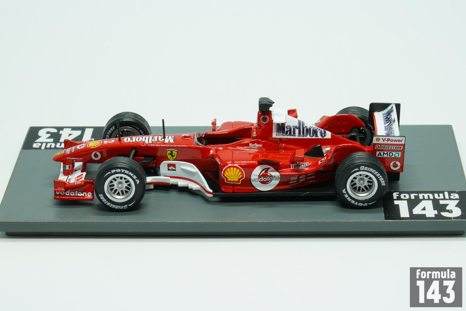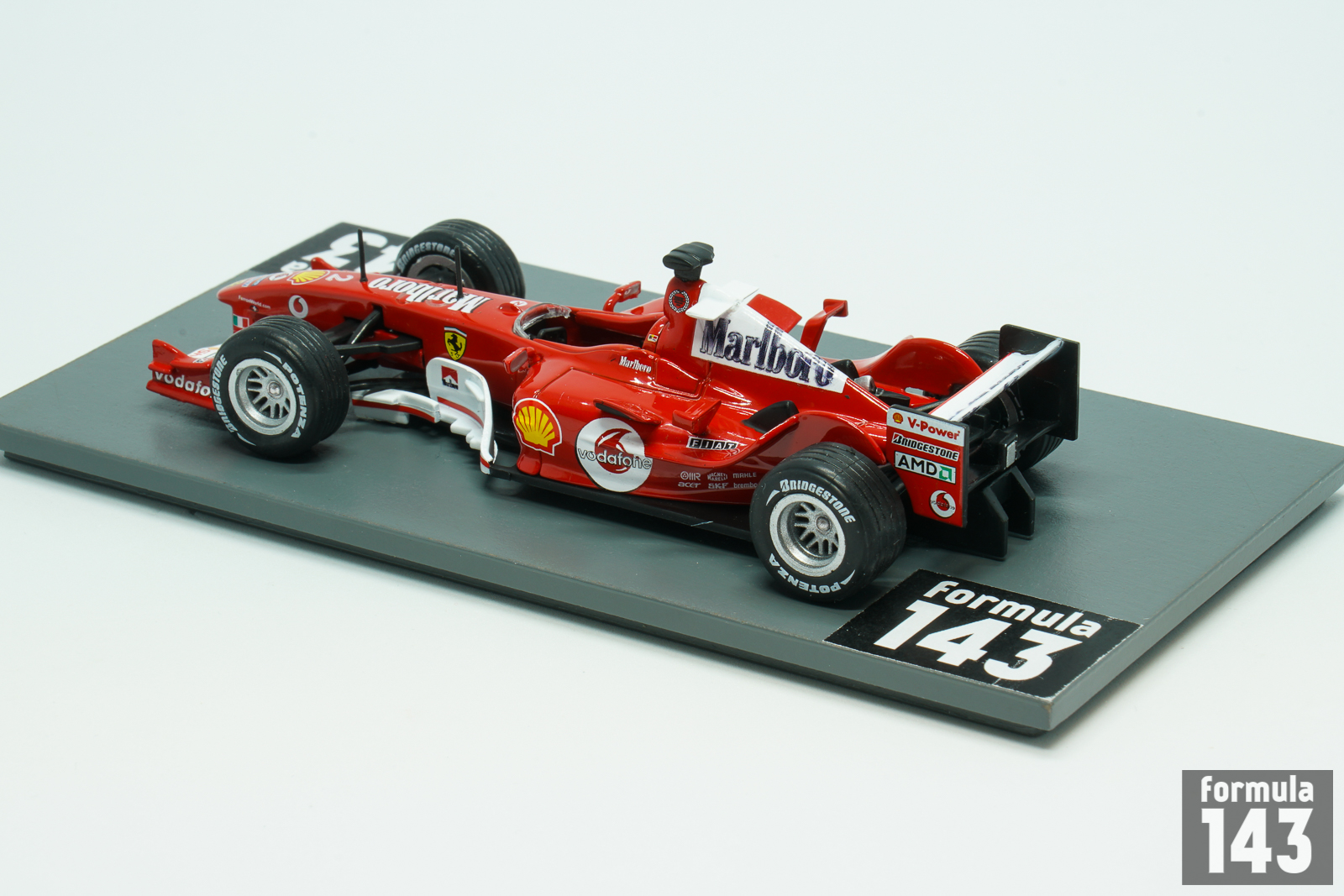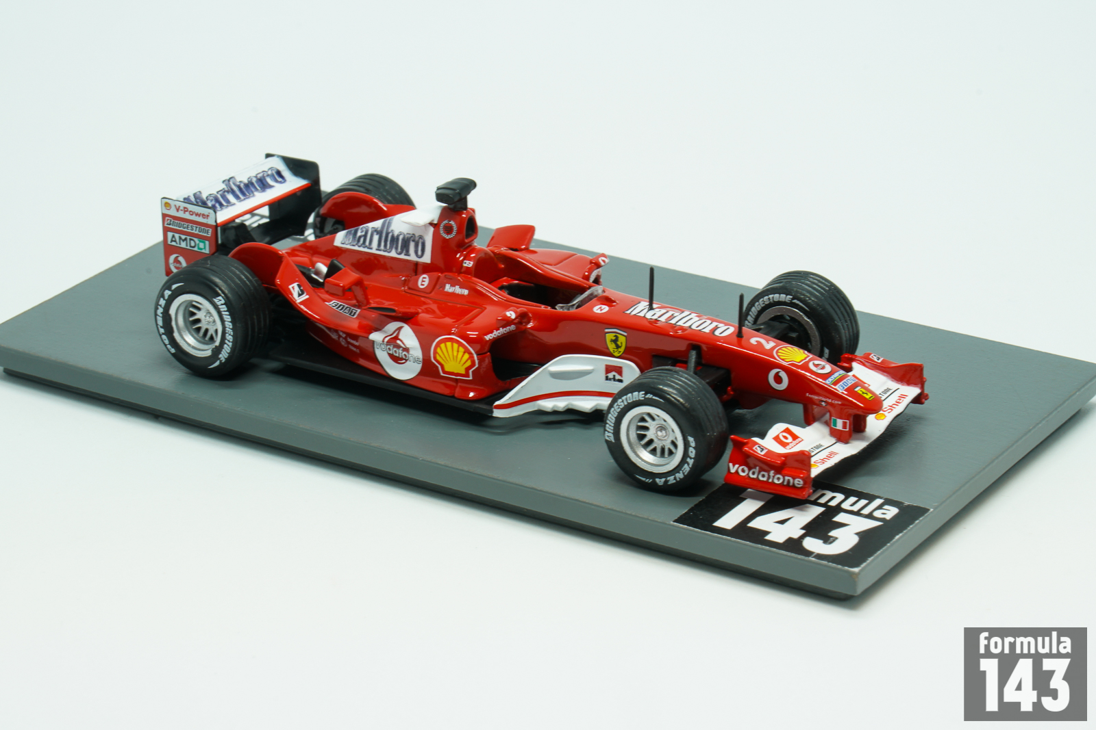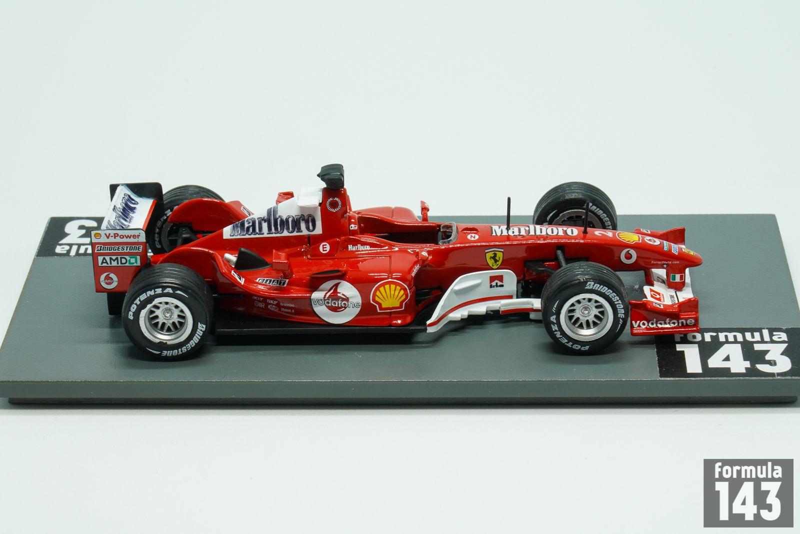 The Ferrari F2004 was one of the most successful Ferrari F1 cars of all time. In the 2004 F1 season it won 15 out of 18 races, while not dropping below the 3rd place even in those races which it did not win. The chassis was designed by Rory Byrne, Aldo Costa and John Iley with Paolo Martinelli leading the engine design. Ross Brawn played a vital role in leading the production of the car as the team’s Technical Director. The new 053 engine was very powerful developing 900 – 1000 hp, and very reliable at the same time due to new rule stipulated that it had to last an entire race weekend. However, this applies to the entire car as a whole. During the season, Ferraris only retired twice, and that was due to collisions, not technical problems. The chassis was also new in it design. The center of gravity of the F2004 was lower than in previous model, and all the elements (bodywork, radiators, exhaust, rear of the car) were redesigned to further improve the airflow. Ferrari was the dominating force that season winning the team’s 6th straight Constructors’ Championship and 5th straight Drivers’ Championship for Michael Schumacher, his 7th, and final, world drivers’ title in 2004. Michael Schumacher won a single-season record of 13 races. Rubens Barrichello won twice with 12 podium finishes in other races, and was placed 2nd in the final drivers’ standings – far behind Schumacher but far ahead of anyone else. This scale model is from Formula 1 Auto. See also Schumacher’s car from Collection Ferrari F1 Collection by Fabbri.
