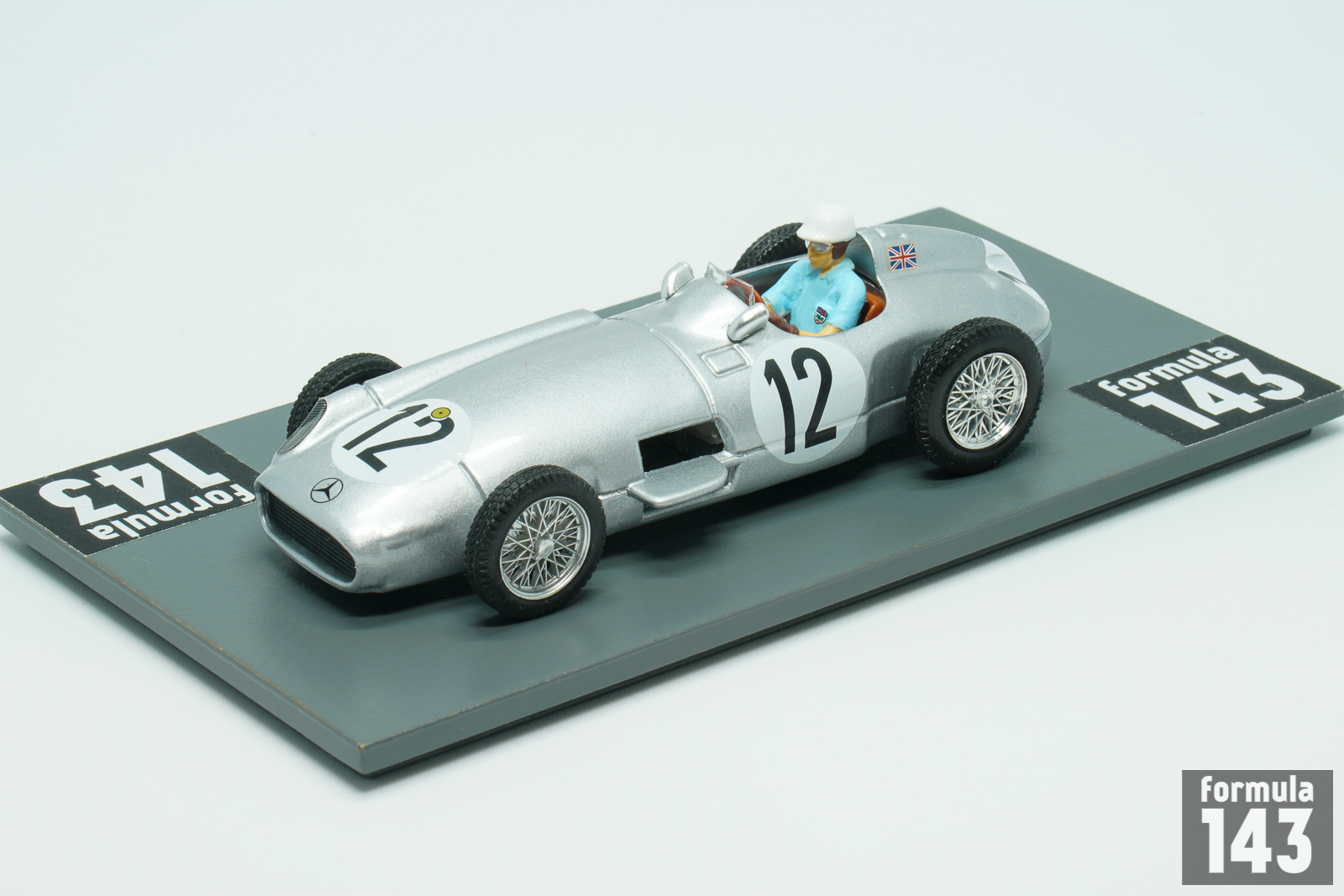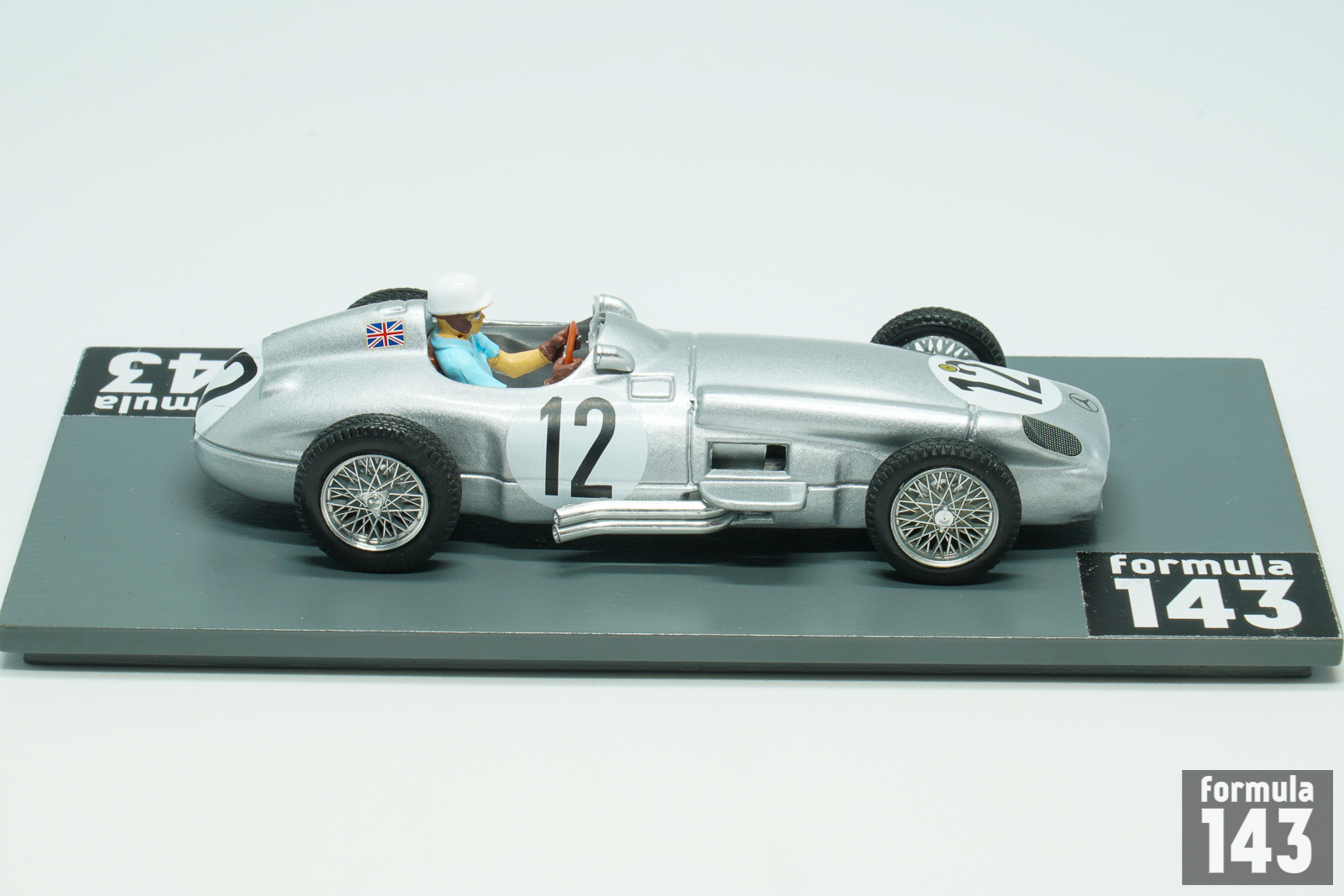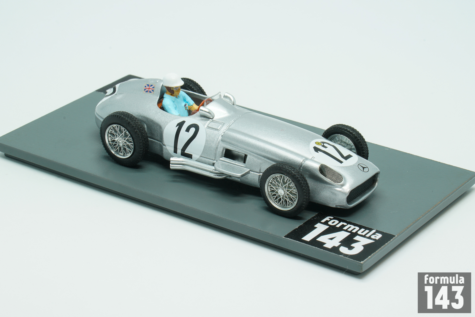 In the 1955 season Mercedes-Benz team signed Stirling Moss to drive the silver arrows alongside Juan Manuel Fangio. Argentinian Maestro still was the indisputable leader of the team, and won three out four first World Championship rounds, while Moss took two second-place finishes at Belgian and Dutch Grand Prix. Moss’s first World Championship victory was in the 1955 British Grand Prix at Aintree, penultimate round of the Championship, a race he was also the first British driver to win. The scale model was issued by Brumm in Moss’ commemorative “722” series that reproduce the cars he piloted. The race number 722 made famous by its victory at the 1955 Mille Miglia.