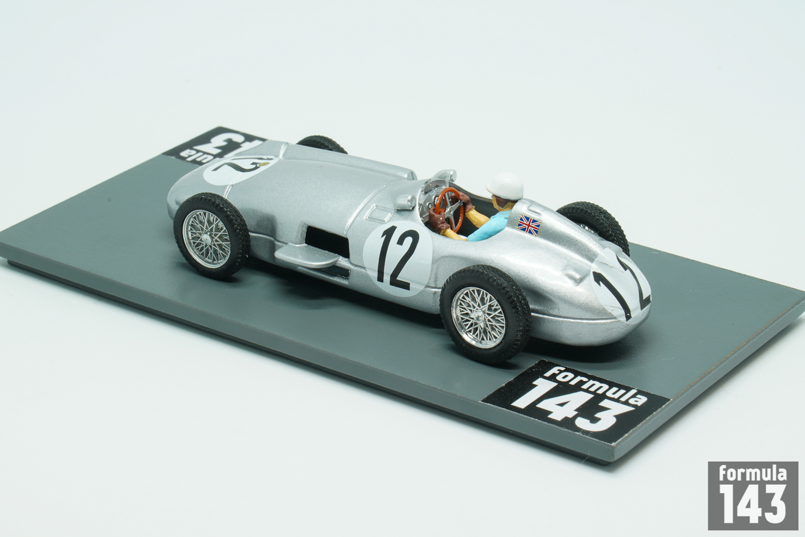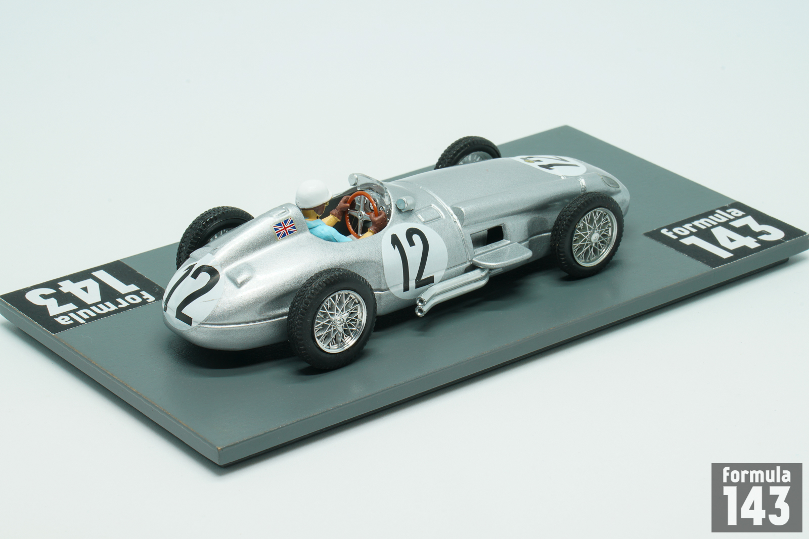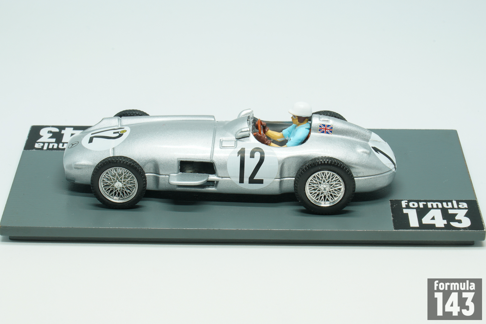 In the 1955 season Mercedes-Benz team signed Stirling Moss to drive the silver arrows alongside Juan Manuel Fangio. Argentinian Maestro still was the indisputable leader of the team, and won three out four first World Championship rounds, while Moss took two second-place finishes at Belgian and Dutch Grand Prix. Moss’s first World Championship victory was in the 1955 British Grand Prix at Aintree, penultimate round of the Championship, a race he was also the first British driver to win. The scale model was issued by Brumm in Moss’ commemorative “722” series that reproduce the cars he piloted. The race number 722 made famous by its victory at the 1955 Mille Miglia.