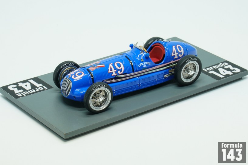 The history of Maserati in American open wheel racing goes back to 1937 when Wibur Shaw, who took part in the Vanderbilt Cup race, was astonished by the Italian cars. He told to his friend Mike Boyle: “If I had a car like that, I’d win the next 500-mile race in it.” Boyle agreed with Maserati factory, but due to misunderstanding the Italians first sent a 6CM voiturette to America, too small for Indy-500. Finally, in 1939 Boyle bought 3.0-liter 8CTF which cost him $15,000, several times than usual American-built Indy special. The car was in production in 1938 and was powered by 8-Cylinder 2991 cc 350 hp engine. The 8CTF renamed as Boyle Special became a part of Indianapolis history when Shaw won the 1939 Indianapolis 500 and again in 1940. Following Boyl’s success, American / French ex-Grand Prix female driver Lucy O’Reilly Schell entered her two recently acquired Maseratis in the 1940 Indianapolis 500 for French pilots Rene Le Begue and Rene Dreyfus. Both raced for Schell’s Ecurie Bleue in Europe, but were unfamiliar with the Brickyard and with the American racing rules. Le Begue qualified chassis 3030 in thirty-first position, while Dreyfus did not qualify in the second car (chassis 3031). On race day, it was decided for the two drivers to split time in the car, and each drove two stints of approximately 50 laps (125 miles) apiece. Le Begue started the race and ran approximately laps 1–50 and laps 101–150. Dreyfus piloted the car for laps 51–100 and from 151 to the finish. The pair brought the car home in 10th place, flagged 8 laps down. Following the race the cars were sold to Lou Moore, who rebranded them as the Elgin Piston Pin Specials and entered in the 1941 Indianapolis 500. The scale model was produced by Replicarz in its exclusive 1:43 Indy series.