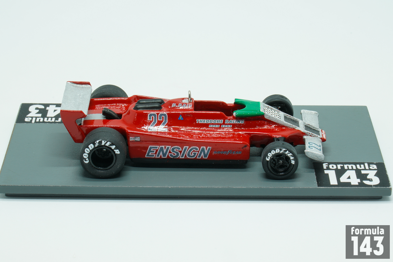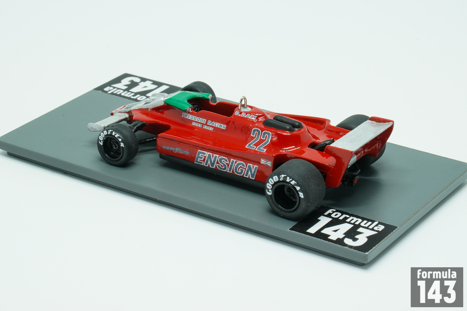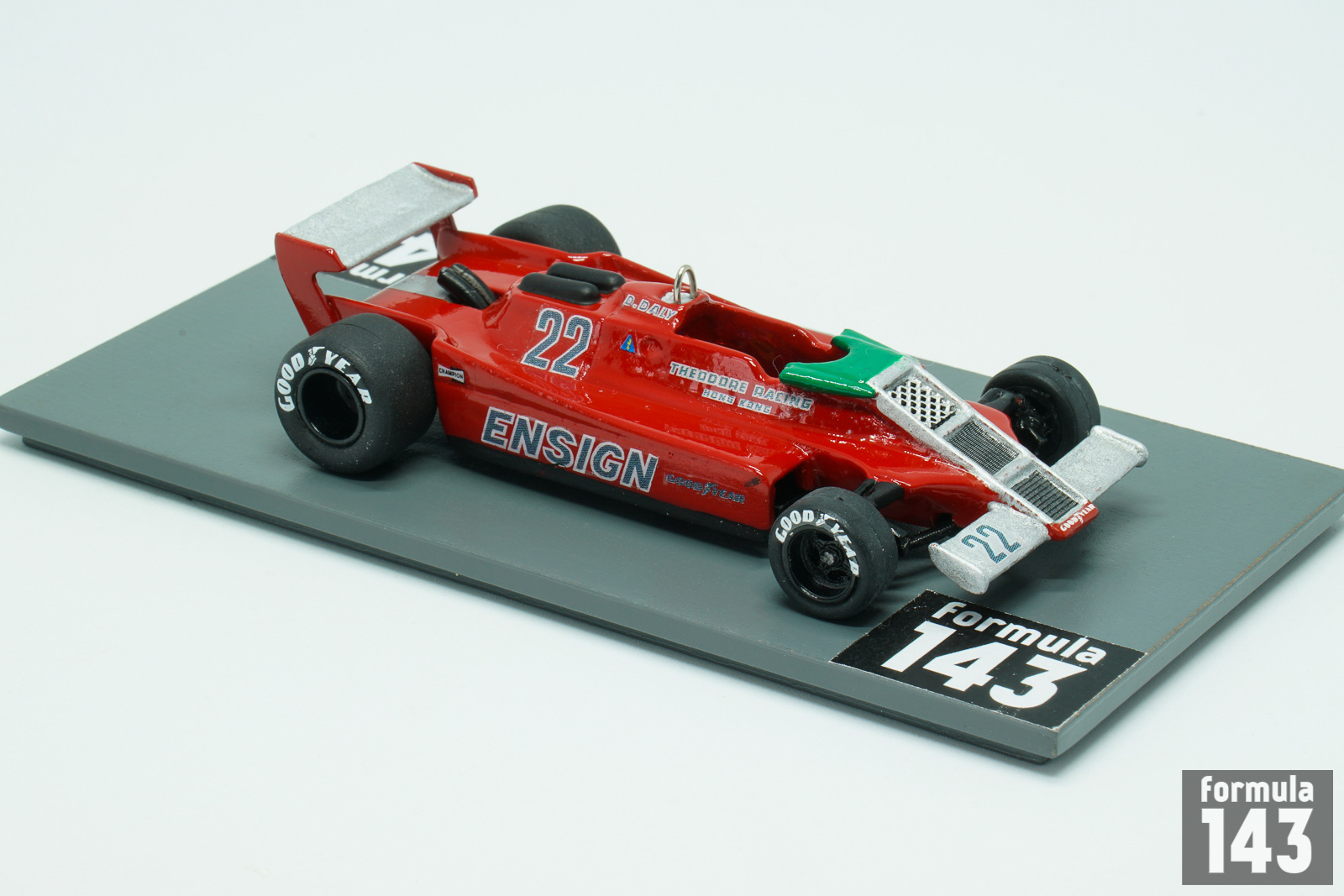 The N179 was the first all-new car Ensign car since the introduction of N175 in the 1975 season. Mo Nunn turned again to Dave Baldwin for the design of the car. The N179 followed ground-effect aerodynamic technology which Team Lotus introduced during the 1977 season. Most of the design for the N179 was conventional and built around the Cosworth DFV engine and Hewland gearbox. During the opening two rounds of the year, Derek Daly drove a modified N177. At the South African Grand Prix, he switched to the new N179, but failed to qualify. In order to make room for the tunnels, the radiators were moved to the front of the car, making the N179 one of the ugliest car of the period. This decision proved to be an inefficient design, and Ensign returned to conventional radiators after the South African Grand Prix. During the rest of the season, Daly, Patrick Gaillard, and Marc Surer managed to qualify the car for just a few Grand Prix events. This scale model representing Daly’s car from South African race, is made by CP Model. See also the model of the same car in the version of Spark.