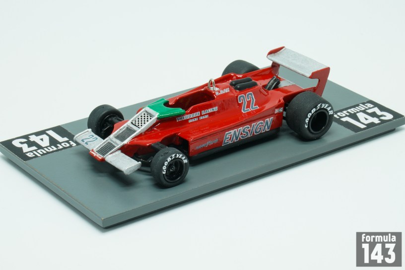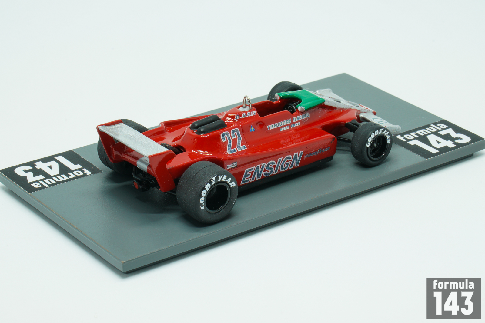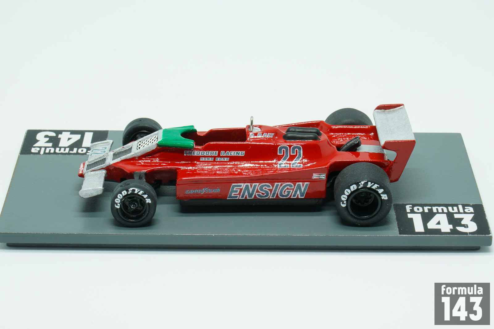 The N179 was the first all-new car Ensign car since the introduction of N175 in the 1975 season. Mo Nunn turned again to Dave Baldwin for the design of the car. The N179 followed ground-effect aerodynamic technology which Team Lotus introduced during the 1977 season. Most of the design for the N179 was conventional and built around the Cosworth DFV engine and Hewland gearbox. During the opening two rounds of the year, Derek Daly drove a modified N177. At the South African Grand Prix, he switched to the new N179, but failed to qualify. In order to make room for the tunnels, the radiators were moved to the front of the car, making the N179 one of the ugliest car of the period. This decision proved to be an inefficient design, and Ensign returned to conventional radiators after the South African Grand Prix. During the rest of the season, Daly, Patrick Gaillard, and Marc Surer managed to qualify the car for just a few Grand Prix events. This scale model representing Daly’s car from South African race, is made by CP Model. See also the model of the same car in the version of Spark.