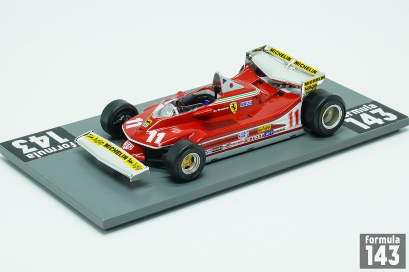 Ferrari 312 series was one of the most successful and famous Grand Prix cars from Maranello. Initially designed by Mauro Forghieri for 1975 season, it raced in various versions from 1975 until 1980 and won 27 races out of 90. The 312T4 version was built for 1979 season with major improvements in the field of aerodynamics in order to follow ground effect design introduced by Colin Chapman’s Lotus in 1978. The car was fast enough to match any rival and very reliable. Jody Scheckter and Gilles Villeneuve won 3 races each and took 1st and 2nd positions respectively in the Drivers’ Championship. The version of the car used in Monaco featured a specially commissioned pair of front and rear wings, both designed to interact more effectively with the bodywork at lower speeds, improving downforce and agility. The car’s wheelbase was also ajustable, moving the front wheel axle line in an attempt to make the car more nimble through the low speed corners. See also Villeneuve’s cars from the same Ferrari F1 Collection and by Minichamps.