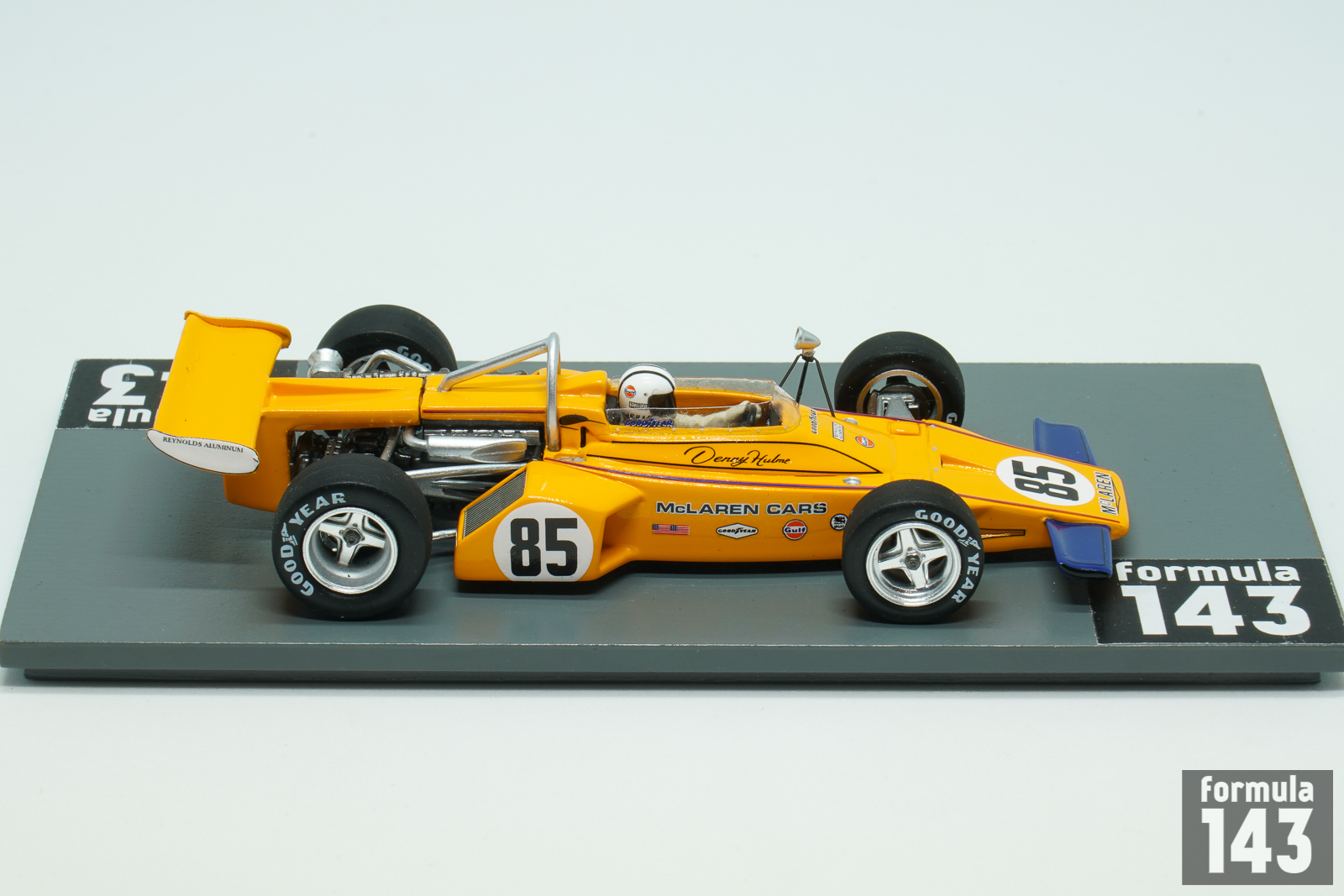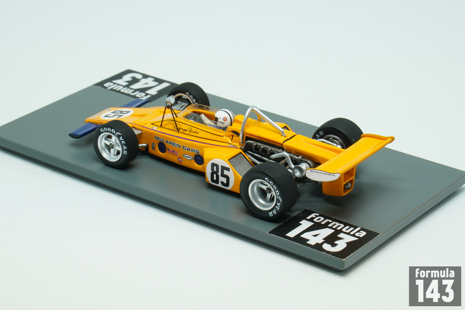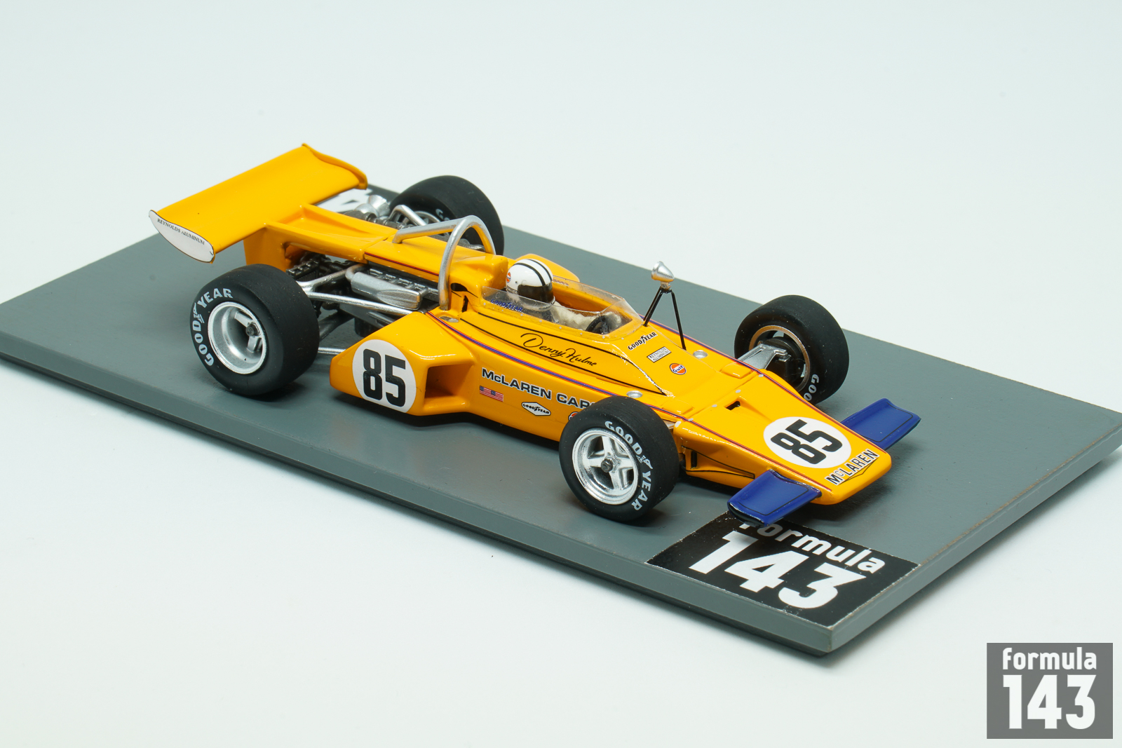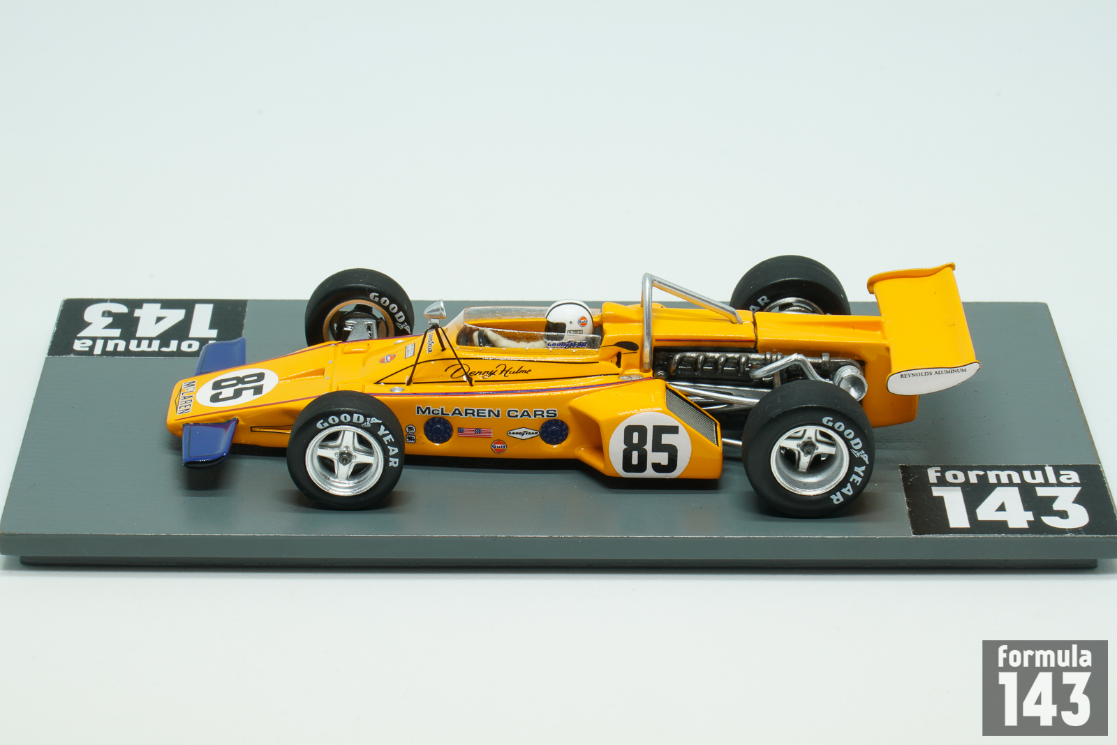 McLaren first ran a works team at Indianapolis in 1970 with the M15, which also appeared in the other big 500-mile events at Ontario and Pocono. For the 1971 season Gordon Coppuck designed the all-new M16 (or M16A as later versions caused it to be known) borrowed its wedge shape from the Lotus 72 which had proved so successful in Grand Prix racing in 1970. Coppuck felt that the sleek shape would ideal for Indycar racing, and he was to be proved right. The car was unveiled at the Colnbrook factory in January 1971, some four months before action got underway at Indianapolis. As was standard in those days, it used a 2.6-litre Offenhauser engine, mounted in a supporting frame. The engine was mated to a Hewland gearbox with three speeds instead of the two usually favoured at Indy, the idea being to provide better acceleration out of pit stops. Works drivers Denny Hulme and Peter Revson gave the car its first testing miles at Ontario Motor Speedway, before Roger Penske took over and ran with Mark Donohue at Phoenix and Indianapolis. Penske had abandoned plans to run a Lola and had instead become McLaren’s first Indycar customer entrant. In the qualification for Indianapolis 500 new M16 cars proved to be very fast. Revson ultimately took pole at a record speed, with Donohue earning second place and Hulme – never a fan of ovals – in fourth. With three cars at the front, a debut win for the M16A seemed assured. But the race proved somewhat disappointing, with Revson managing only a low-key second behind the Colt of Al Unser, Donohue stopping with gearbox problems, and Hulme spinning early on before having engine trouble. Nevertheless, McLaren had made its mark and M16-series cars had won three of the six 500-mile races held since their debut – in 1972, 1974 and 1976.