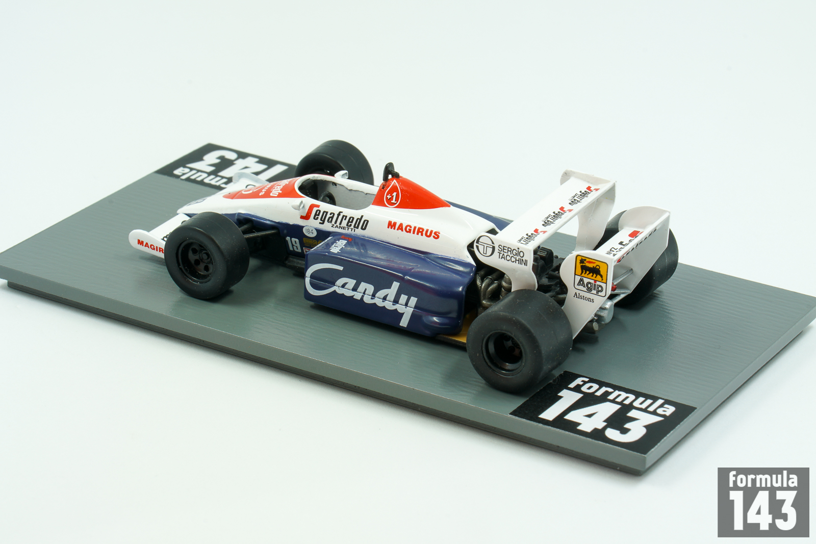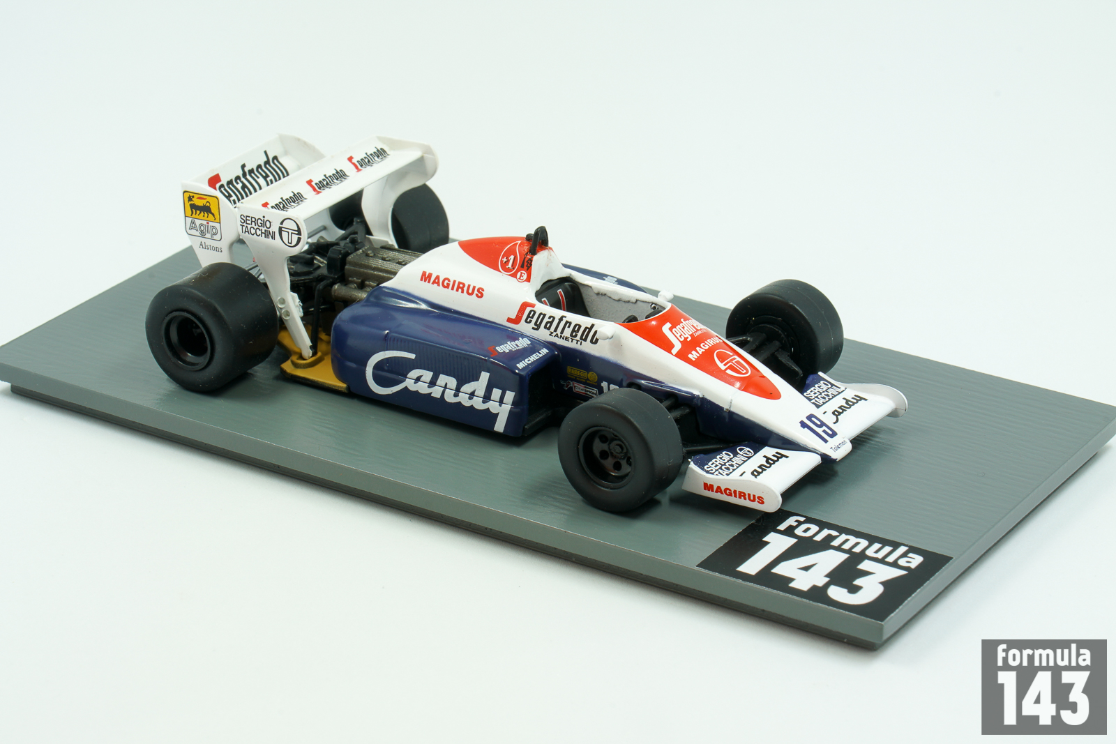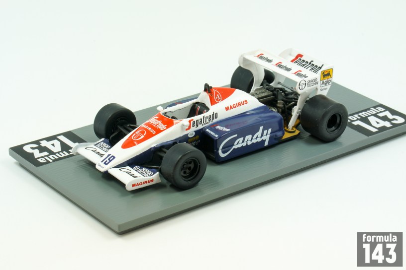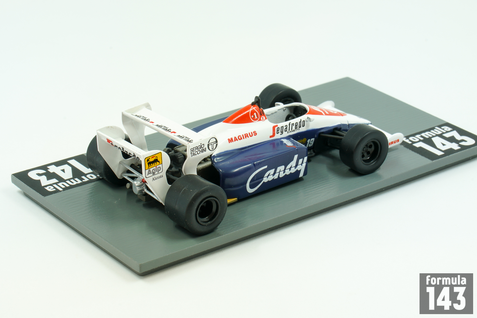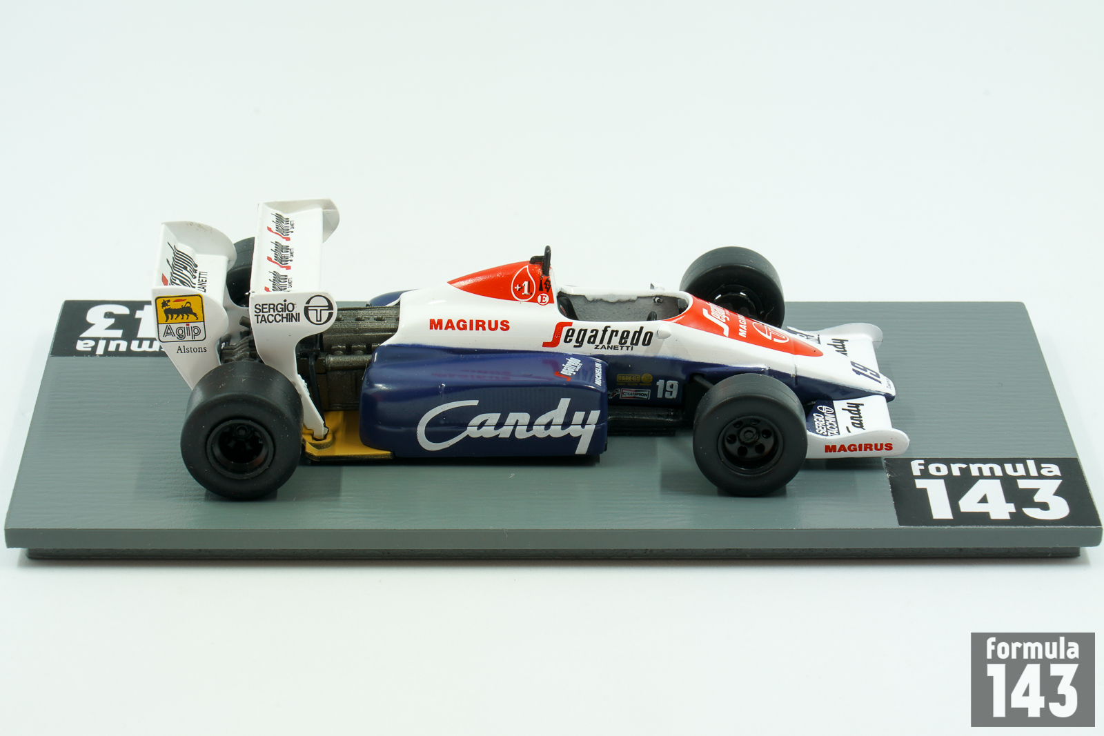 TG184 designed by Rory Byrne, the further evolution of TG183, was used by Toleman team during the majority 1984 season. It was the car which made the Ayrton Senna’s glory as the “Rainman” after his fantastic performance in a wet Monaco Grand Prix where Senna almost won when the race was stopped due to adverse conditions. The scale model is from Formula 1 Auto Collection magazine series. The car represented is based on TG184 raced at Goodwood Festival of Speed in 2010s.
