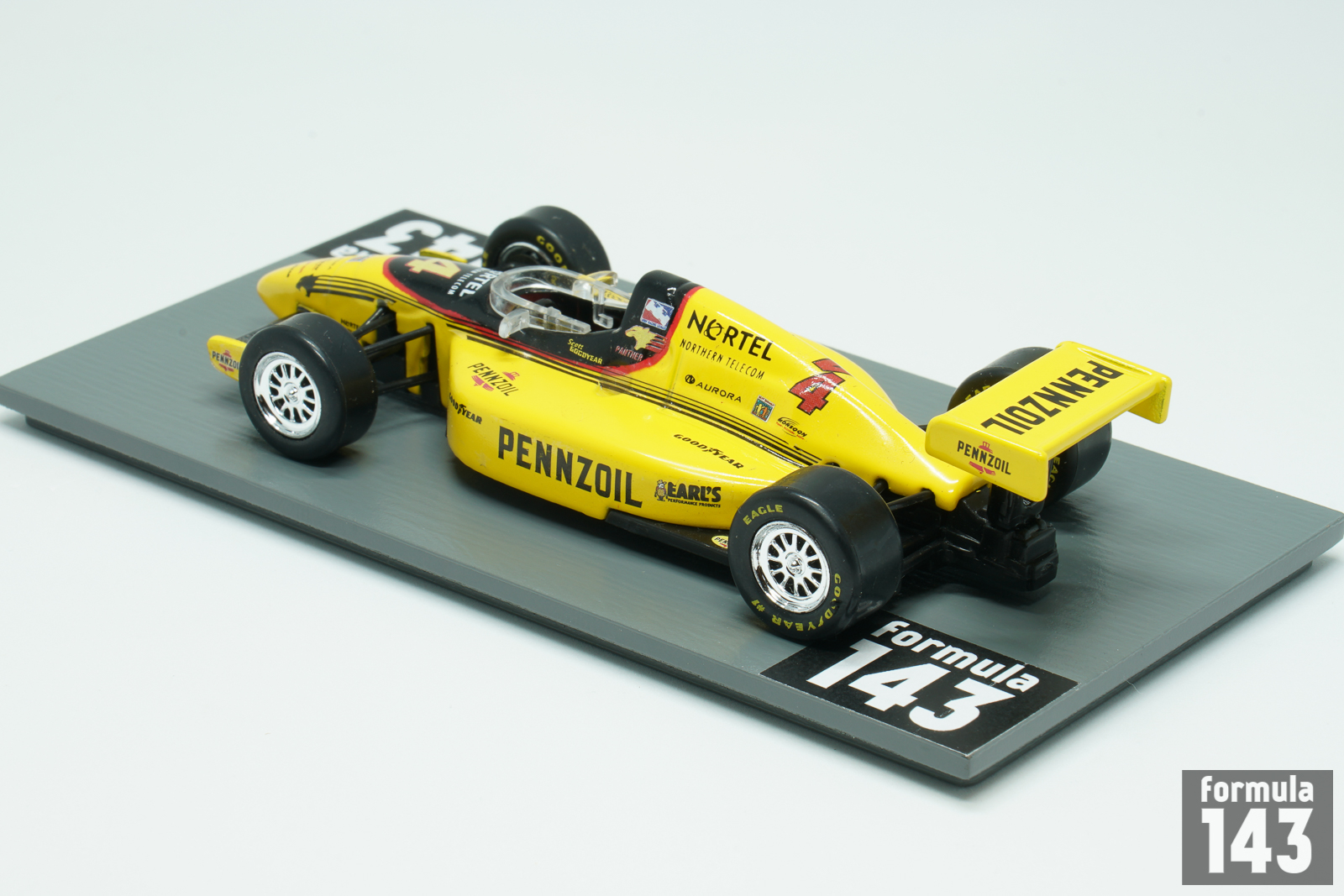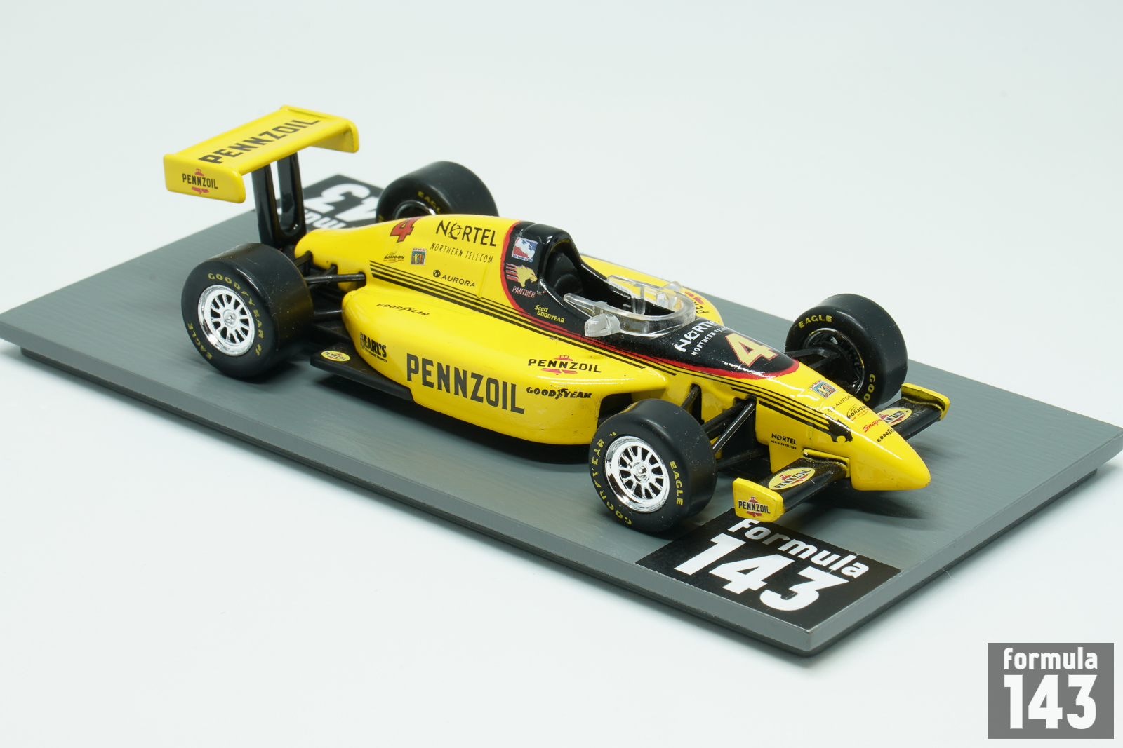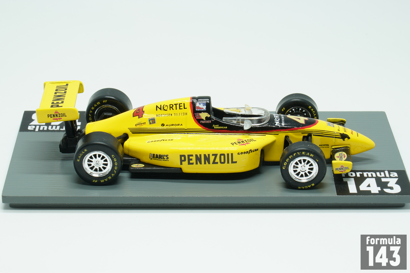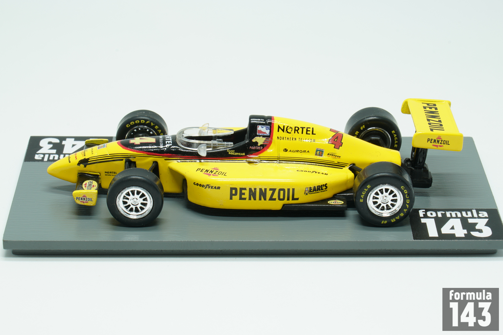 After the first two unstable seasons, in 1998 the Indy Racing League achieved regularity with a familiar annual schedule and a stable lineup of teams and drivers. One of the new teams formed to compete in IRL was Panther Racing. The team was founded in late 1997 by six owners: open-wheel racing team manager John Barnes, Indianapolis car dealer Gary Pedigo, former radio personality Mike Griffin, television production executive Terry Lingner, Indianapolis Colts quarterback Jim Harbaugh and Indianapolis director of corporate government affairs Doug Boles. For their first season in 1998, the team entered the #4 Pennzoil G-Force GF01B powered by Oldsmobile Aurora L47 V8 for Scott Goodyear. G-Force Technologies was an American racing car manufacturer originally formed by Americans Chip Ganassi and Ken Anderson in 1991. G-Force began constructing chassis for the Indy Racing League as one of their original chassis fabricators beginning with the 1997 season. G-Force chassis (GF01) won the Indianapolis 500 in its first attempt in 1997 with Arie Luyendyk. In 1998 G-Force modified its first generation chassis to ‘B’ specification which competed in IRL series in 1998-99. Both GF01 and GF01B were mated to the Oldsmobile Indy Aurora V-8 powerplant. The car featured Emco 6-speed manual transmission, AP Racing brakes and OZ Racing wheels. Canadian Scott Goodyear, who drove in CART since 1978 and switched to IRL since 1996-97 season, was regular point finisher. He took 2nd place in 1998 New England 200 at New Hampshire speedway, and was 3rd in 1998 VisionAire 500K at Charlotte Motor Speedway. In the final IRL standings Goodyear was 7th. Panther Racing got sponsorship from Pennzoil, but instead of traditional Pennzoil all-yellow livery Panther used unusual yellow and black paint scheme designed by Sam Bass, a well-known race car motorsport livery designer. The scale model was manufactured by Ertl in their American Muscle series. See also model of this car in 1/64 by Maisto.