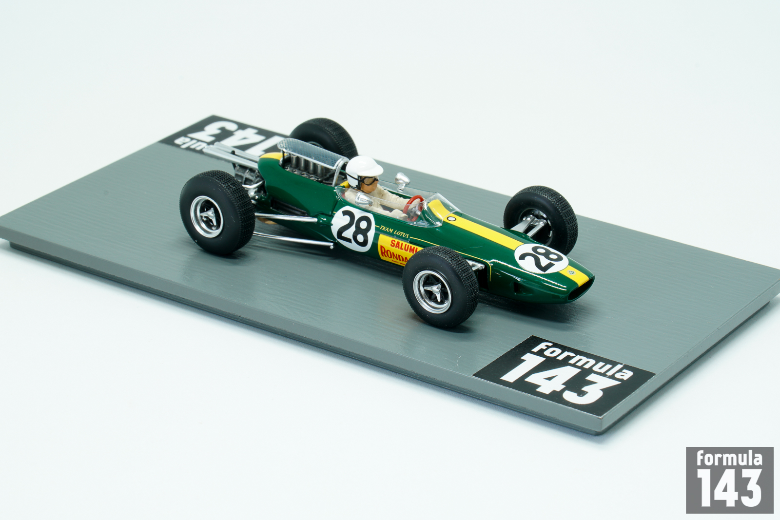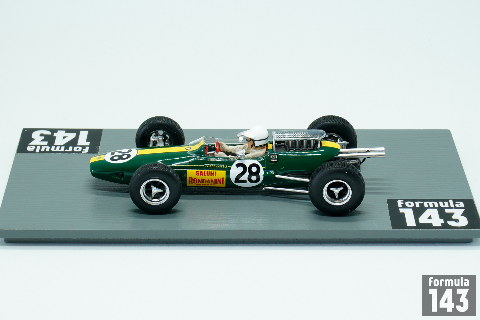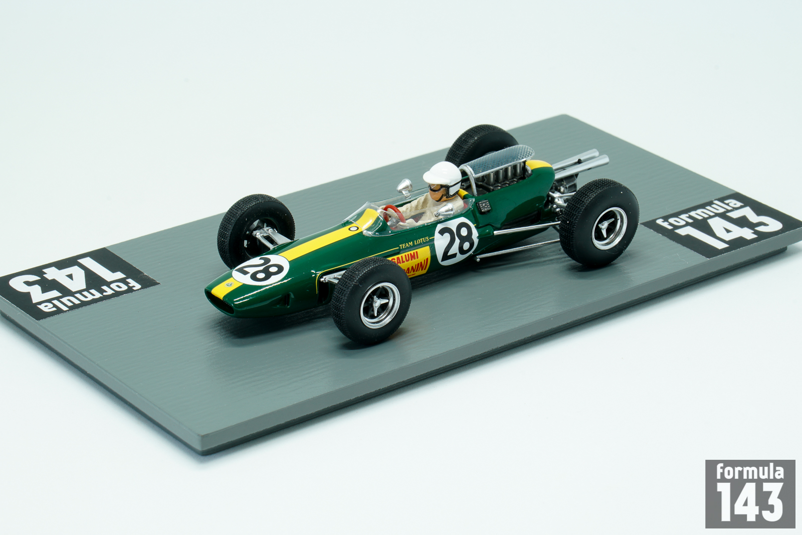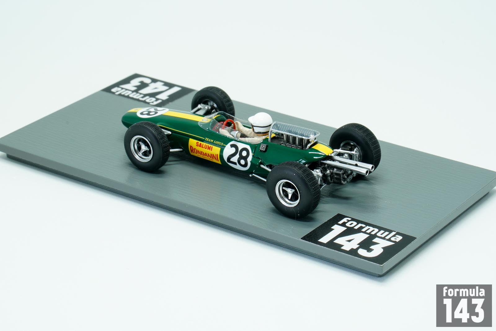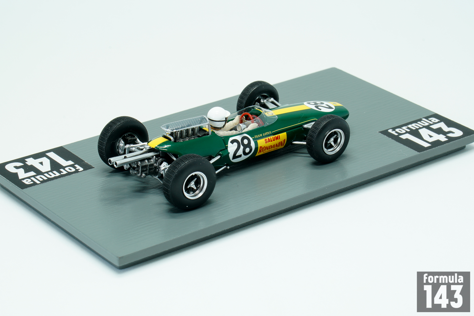 Lotus 25 designed by Colin Chapman, a revolutionary Formula One car with first fully stressed monocoque chassis, made its racing debut in 1962 and had raced until 1967. In the 1965 season works Lotus drivers were Jim Clark and Mike Spence. Clark won six races and took his second World Championship title. The best result of Spence was 3rd place in Mexican grand Prix, and he was just 8th in the final Championship table. In the Italian Grand Prix of 1965 the third works Lotus was entered for local driver Giacomo Russo, who raced under the pseudonym “Geki”. Russo made his name in the Italian lower formulae, and was a four-time Italian Formula Three series champion, winning consecutive championships from 1961 to 1964. In his first start in F1 he retired due to gearbox failure. Geki also raced for Lotus next year, in the 1966 Italian GP. He was killed in a horrific accident in an Italian Formula Three race at Caserta in 1967.