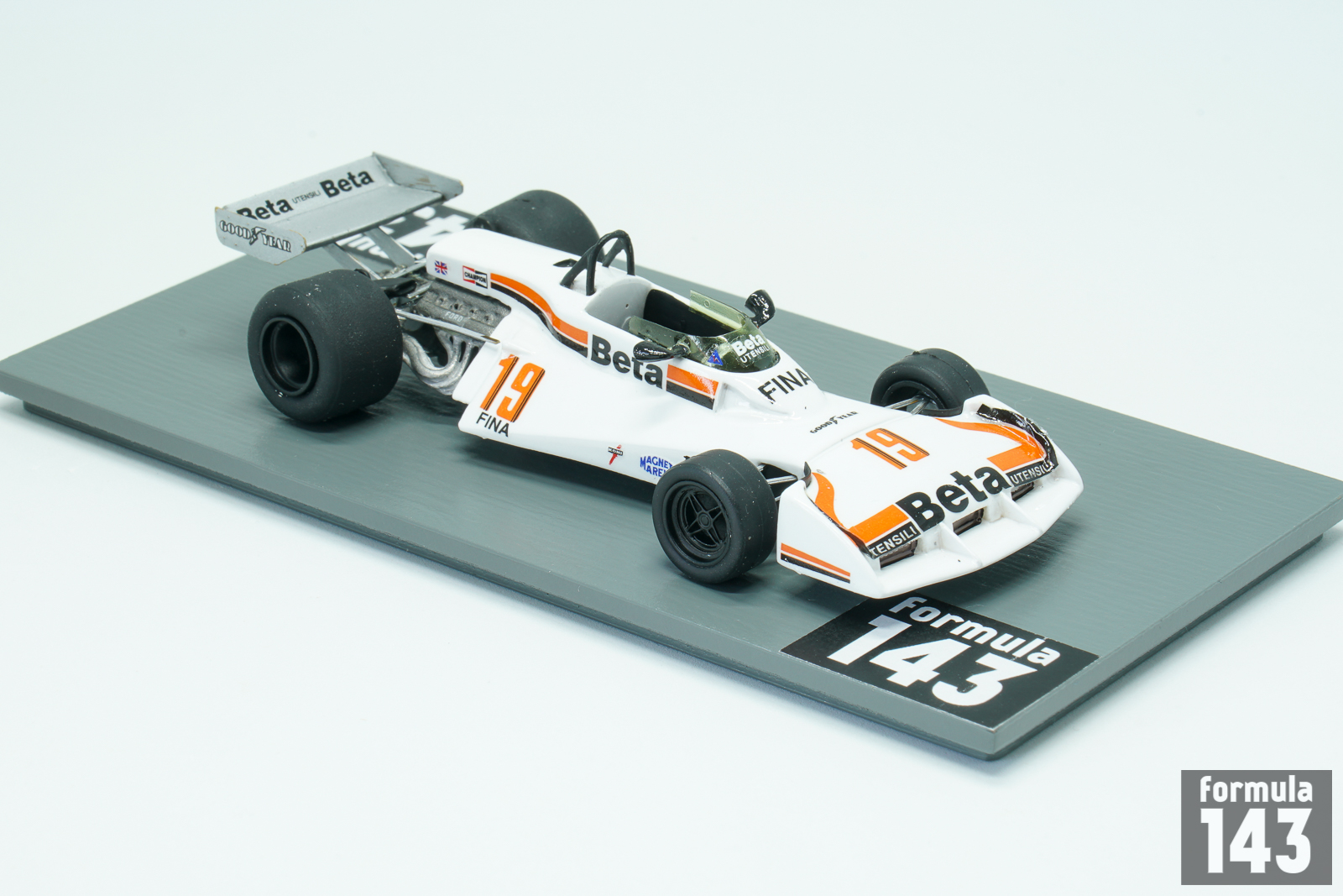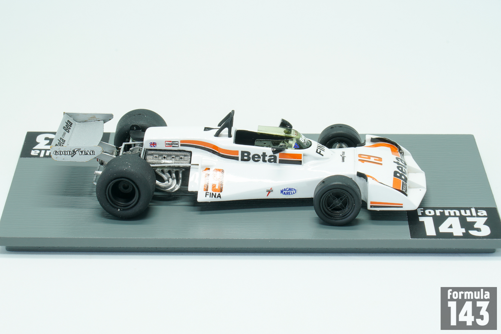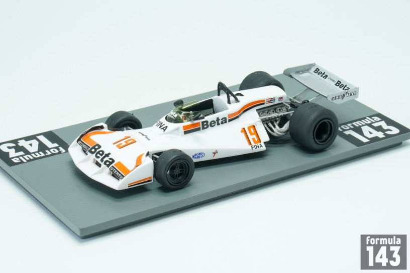 The Surtees TS19 was designed by John Surtees and Ken Sears and was used by Surtees during the 1976, 1977 and 1978 F1 seasons. The car was typical F1 vehicle of the time powered by a Ford Cosworth V8 engine mated to a Hewland FGA400 gearbox. It had an aluminum monocoque and rode on Goodyear tires. А characteristic recognizable feature of the car that distinguished it from its rivals was the big integrated front wing with air intakes. For 1977, Surtees had a new driver lineup. Austrian Hans Binder drove the Durex-sponsored car, and Italian Vittorio Brambilla drove with sponsorship from Beta. Brambilla managed to score six points, with 4th place in Belgium as the highest finish of the year.