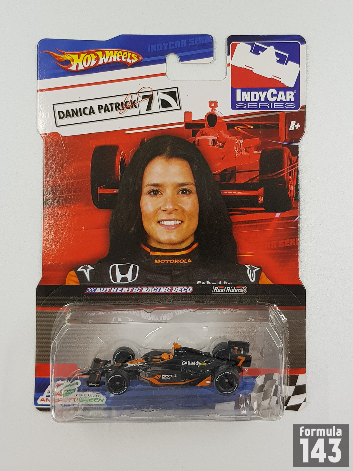 The 2009 season for Danica Patrick was her fifth year in IndyCar racing and third season with Andretti-Green team. Two liveries were used by Patrick’s car that season. This boost / Go Daddy sponsored black and orange car was the main variant raced in the majority of the races, and black and blue Motorola variant was used in Kentucky, Long Beach and St. Petersburg. Patrick took her best career finish in five attempts at the Indianapolis 500 by finishing in third position. This set a new record for the highest-placed finish for a woman in Indianapolis 500 history. For the rest of the season, she scored seven more top-ten finishes with her best being a pair of fifth positions at the Milwaukee and Richmond races. Patrick finished the season fifth overall in the point standings, her highest finish.