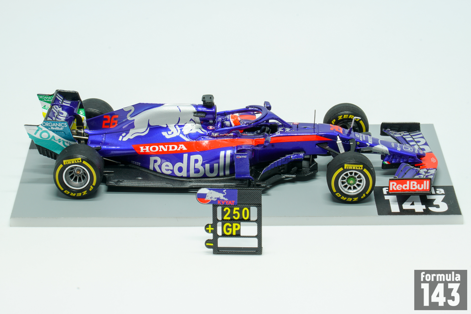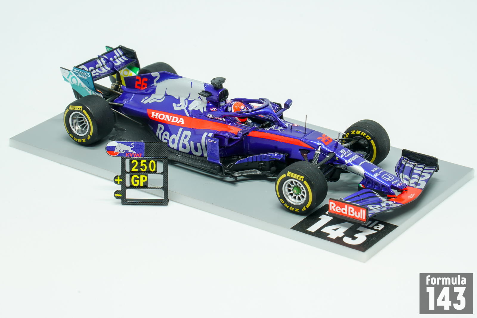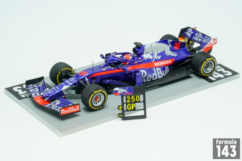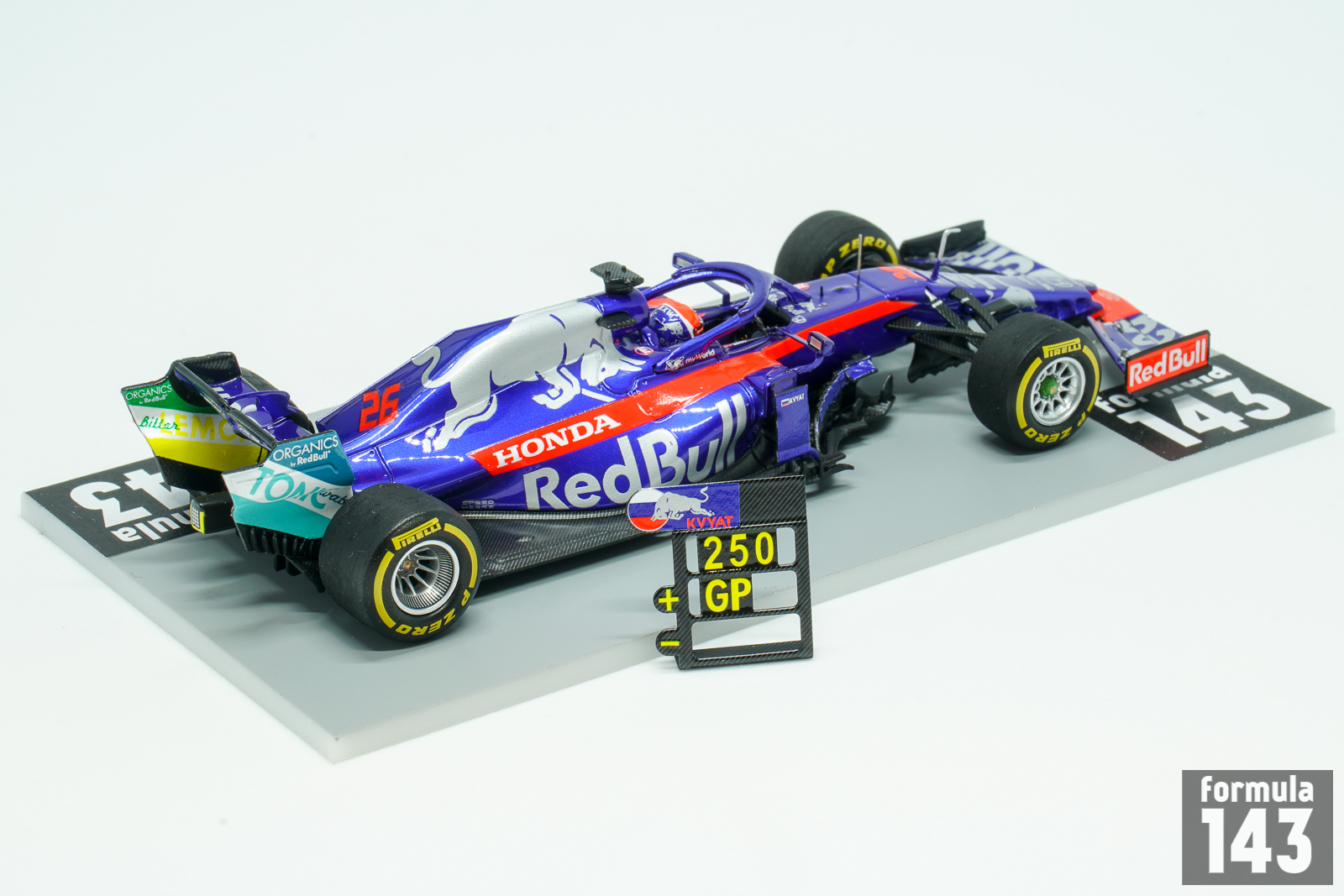 The STR14 car was initially driven by Daniil Kvyat, and F1 debutant Alexander Albon. After the Hungarian Grand Prix Albon was promoted to Red Bull Racing for the remainder of the season, while Pierre Gasly would return to Toro Rosso, due to the poor performance of the Frenchman at the senior team Red Bull Racing. As to Kvyat, he rejoined Toro Rosso as a driver for the 2019 season, after spending the 2018 season as Ferrari third driver. Kvyat produced several excellent drive in the season, including a 3rd-place podium finish at the rain-affected German Grand Prix, finish in 7th place in Belgium after starting in 19th due to power unit penalties. Third place in Germany was the team’s first podium finish since 2008, when Sebastian Vettel won the 2008 Italian Grand Prix. Later in 2019, Pierre Gasly finished second at the Brazilian Grand Prix by 0.062 seconds ahead of Mercedes driver Lewis Hamilton taking the team’s third podium. Kvyat finished the season in 13th place in the championship with 37 points, and Scuderia Toro Rosso was 6th in the constructor’s championship. The scale model represents the car driven by Daniil Kvyat in the 2019 Chinese Grand Prix which was 250th F1 race for the Scuderia.