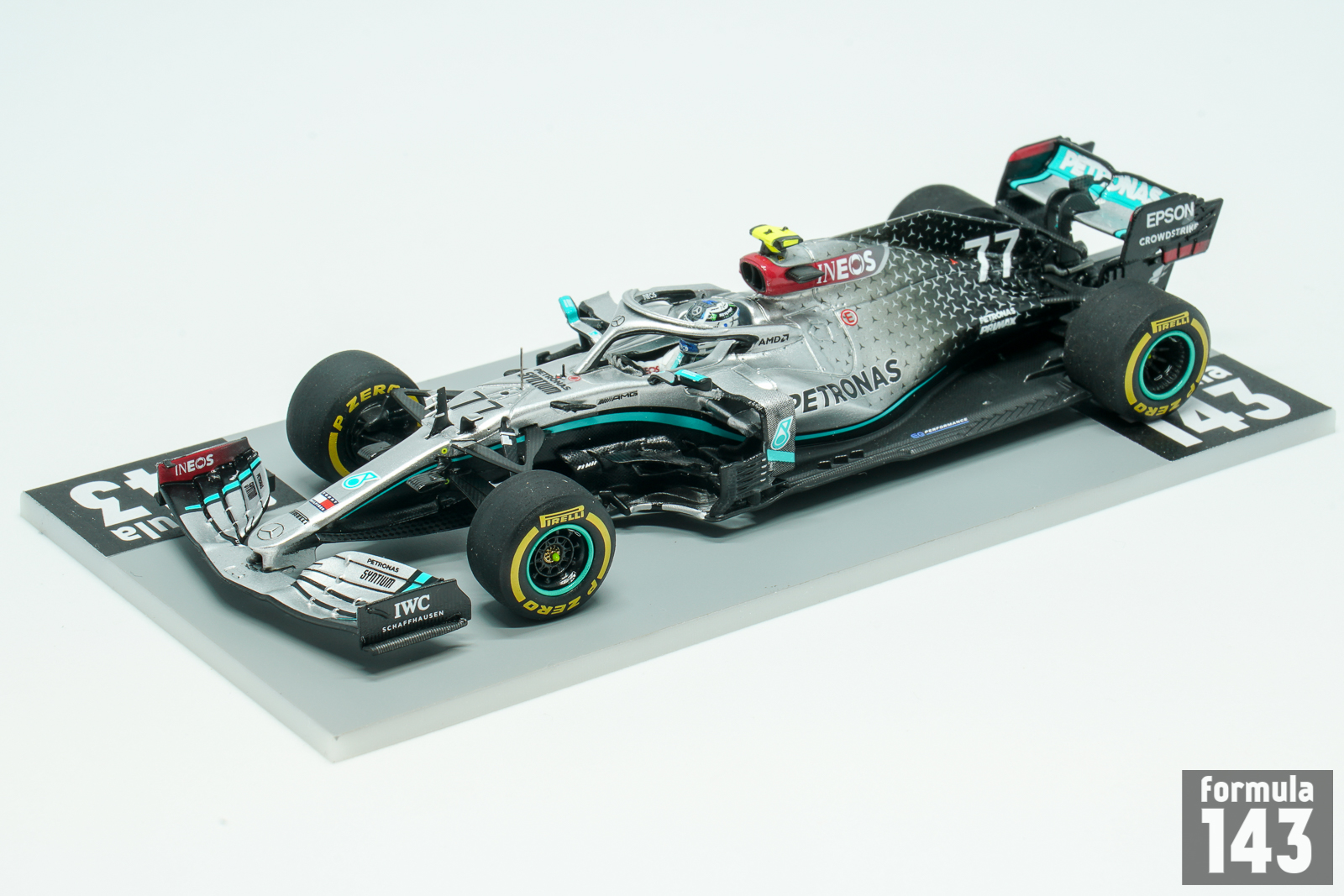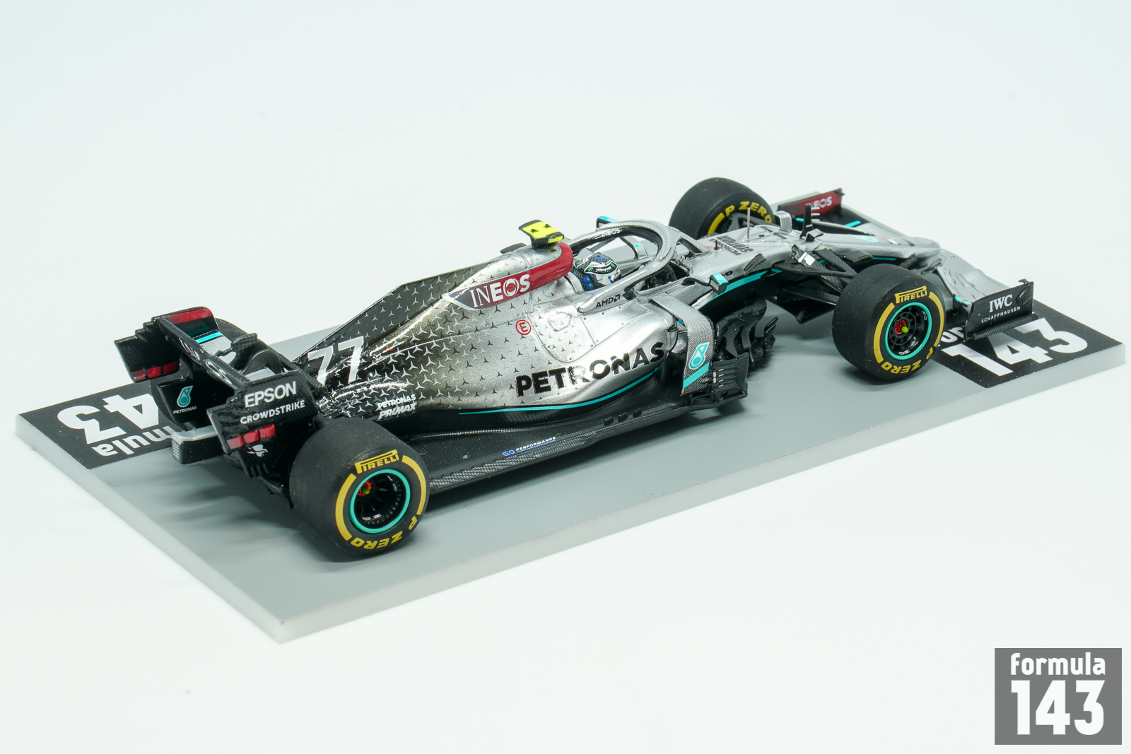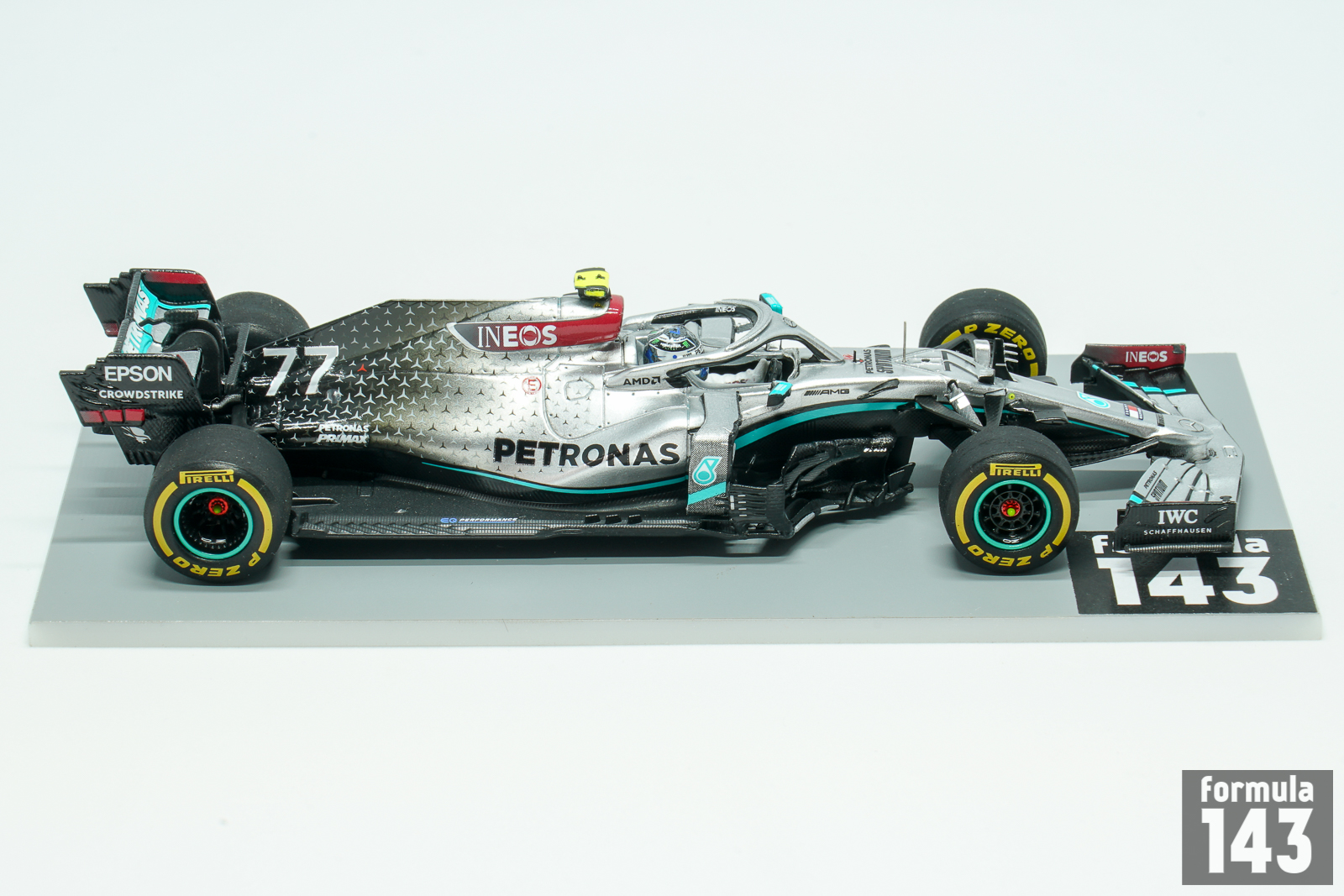 The scale model demonstrates the car driven by Valtteri Bottas during pre-season testing at the Circuit de Barcelona-Catalunya in February 2020. The tests consisted of two sets of three testing days (19–21 February and 26–28 February), and Bottas, who completed 437 laps, set the fastest overall time. In Barcelona Mercedes cars were painted in the same livery as in the 2020 season, which the team planned to use in the 2021. But after pre-season testing the traditional silver livery of the car was changed to black following worldwide support for the Black Lives Matter movement, especially supported, sometimes overly exalted, by Hamilton.