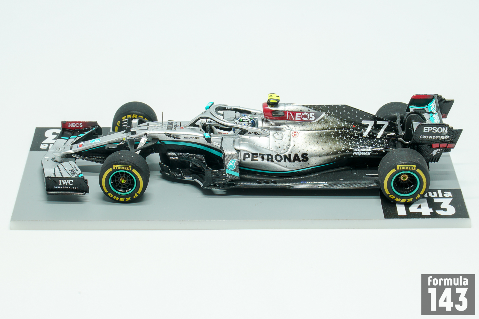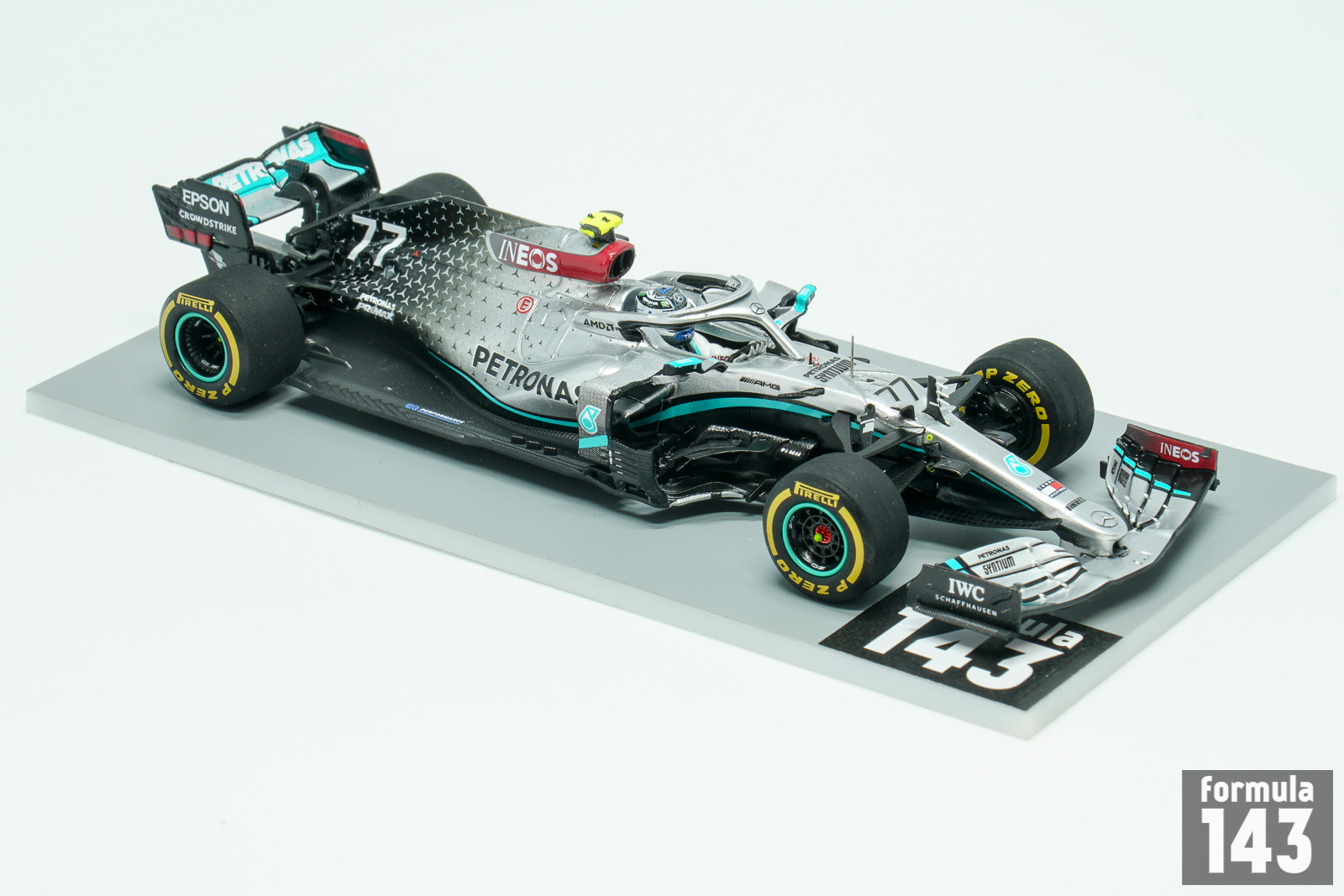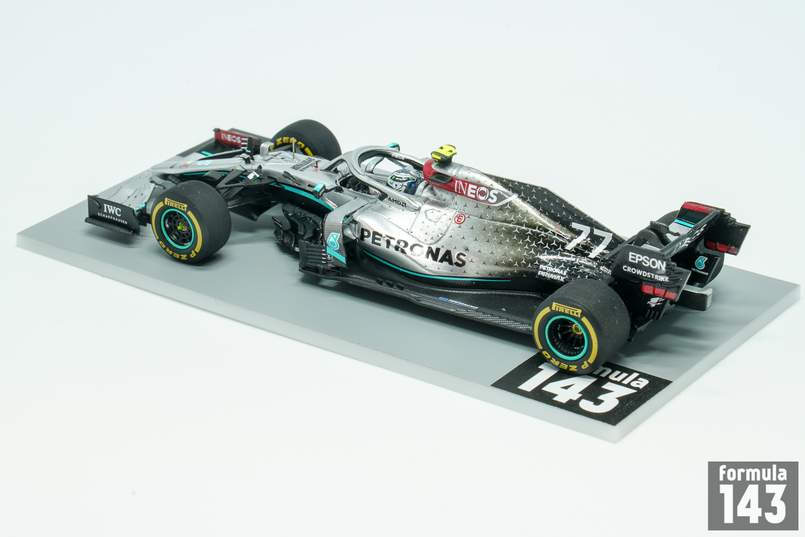 The scale model demonstrates the car driven by Valtteri Bottas during pre-season testing at the Circuit de Barcelona-Catalunya in February 2020. The tests consisted of two sets of three testing days (19–21 February and 26–28 February), and Bottas, who completed 437 laps, set the fastest overall time. In Barcelona Mercedes cars were painted in the same livery as in the 2020 season, which the team planned to use in the 2021. But after pre-season testing the traditional silver livery of the car was changed to black following worldwide support for the Black Lives Matter movement, especially supported, sometimes overly exalted, by Hamilton.
