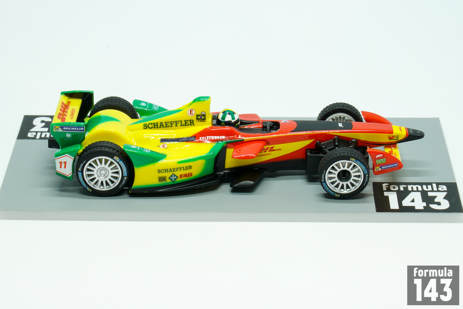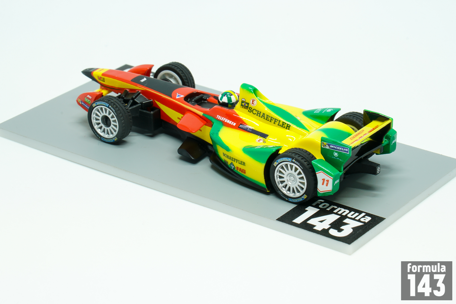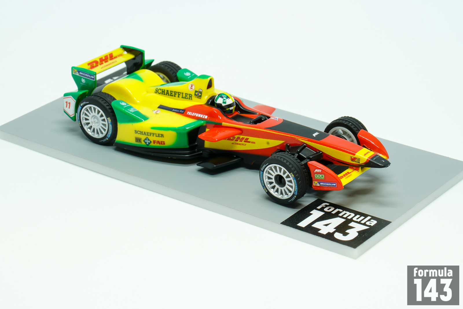 The 2014–15 FIA Formula E Championship was the inaugural season of a new FIA championship for electrically powered cars. The calendar consisted of 11 races held between September 2014 and June 2015 in 10 different host cities: Beijing, Putrajaya, Punta del Este, Buenos Aires, Long Beach, Miami, Monte Carlo, Berlin, Moscow and finally London, where last two rounds of the championship took place. All teams were supplied an electric racing car built by Spark Racing Technology, called the Spark-Renault SRT 01E. The chassis was designed by Dallara, with an electric motor developed by McLaren (the same as that used in its P1 supercar), a battery system created by Williams Grand Prix Engineering and a Hewland five-speed gearbox. Michelin were the official tyre supplier. 28kWh Li-ion battery provided map power of 200 kW (268 hp). Power-saving race mode restricted it to 150 kW (201 hp). During the race each driver should been change the car – two cars per driver balanced restricted battery capacity and speed, for the best possible racing on-track. Ten teams each consisted of two cars, were competed. Audi Sport ABT Formula E Team with Lucas di Grassi and Daniel Abt was one of the leading team of the season. Di Grassi won the inaugural Formula E race, 2014 Beijing E-Prix, took five more podiums and finished 4th in the Championship. The scale model is 1/43 slot car, made by Carrera, German manufacturer of slot cars.