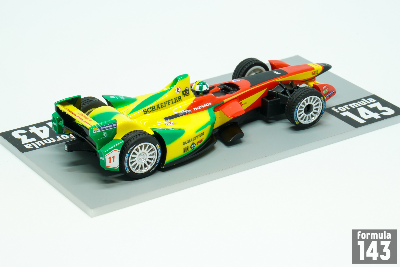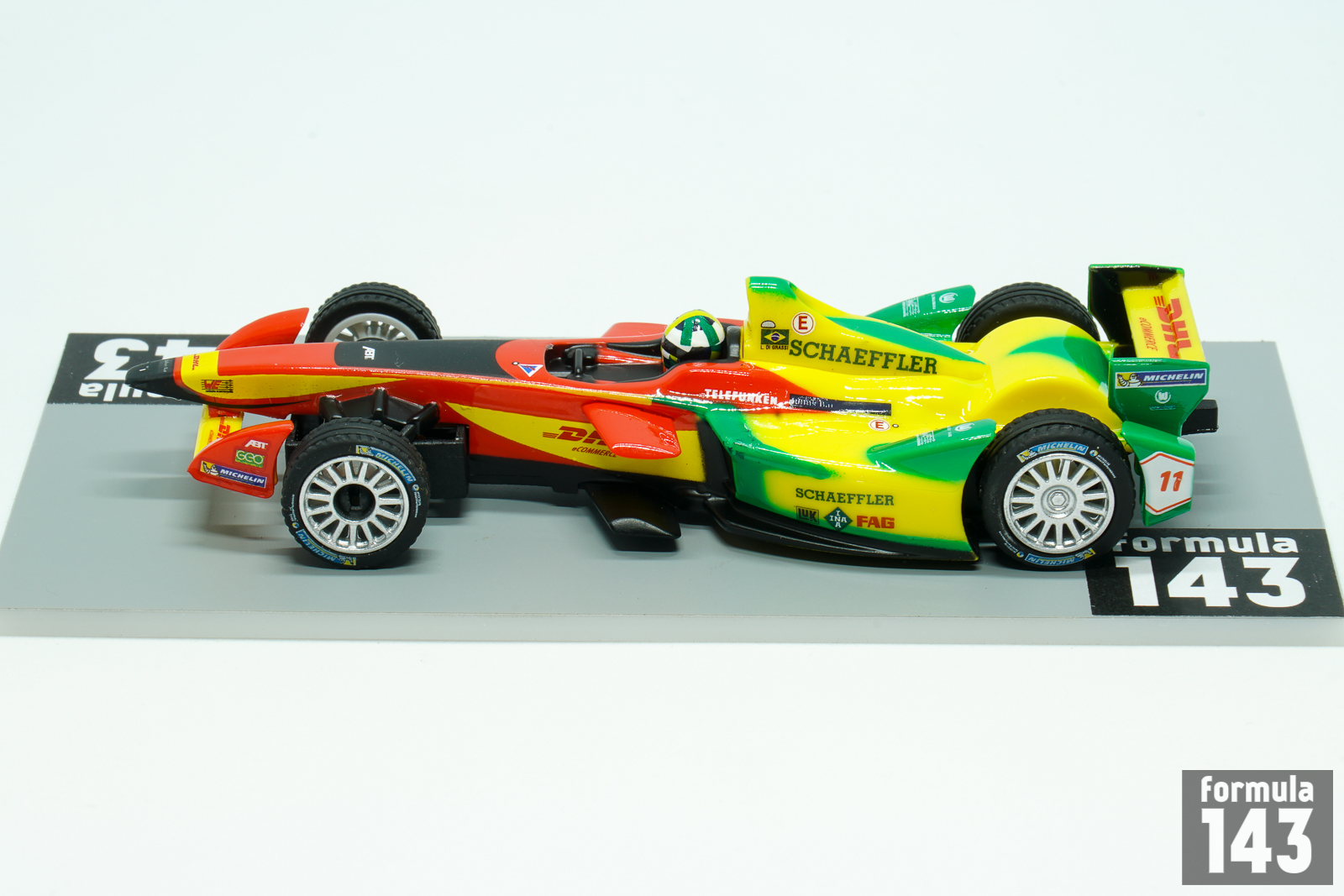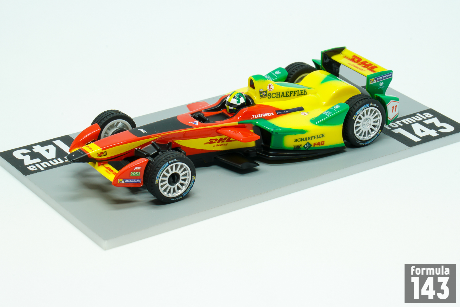 The 2014–15 FIA Formula E Championship was the inaugural season of a new FIA championship for electrically powered cars. The calendar consisted of 11 races held between September 2014 and June 2015 in 10 different host cities: Beijing, Putrajaya, Punta del Este, Buenos Aires, Long Beach, Miami, Monte Carlo, Berlin, Moscow and finally London, where last two rounds of the championship took place. All teams were supplied an electric racing car built by Spark Racing Technology, called the Spark-Renault SRT 01E. The chassis was designed by Dallara, with an electric motor developed by McLaren (the same as that used in its P1 supercar), a battery system created by Williams Grand Prix Engineering and a Hewland five-speed gearbox. Michelin were the official tyre supplier. 28kWh Li-ion battery provided map power of 200 kW (268 hp). Power-saving race mode restricted it to 150 kW (201 hp). During the race each driver should been change the car – two cars per driver balanced restricted battery capacity and speed, for the best possible racing on-track. Ten teams each consisted of two cars, were competed. Audi Sport ABT Formula E Team with Lucas di Grassi and Daniel Abt was one of the leading team of the season. Di Grassi won the inaugural Formula E race, 2014 Beijing E-Prix, took five more podiums and finished 4th in the Championship. The scale model is 1/43 slot car, made by Carrera, German manufacturer of slot cars.
