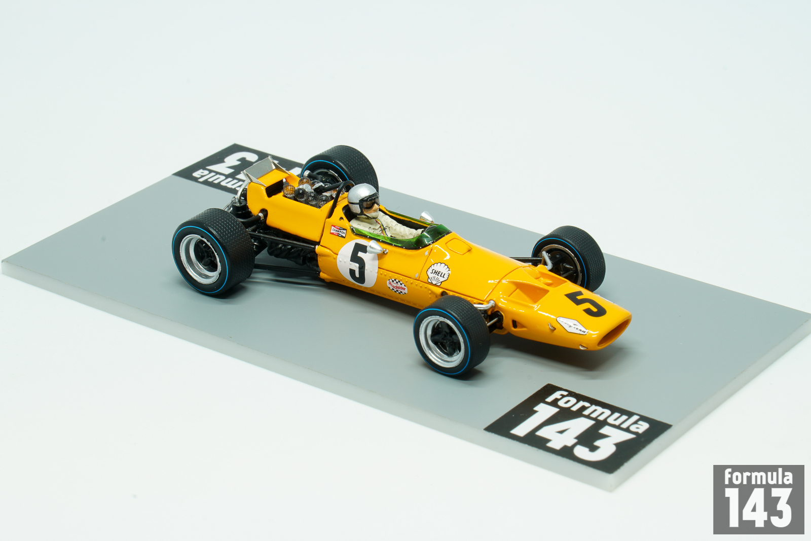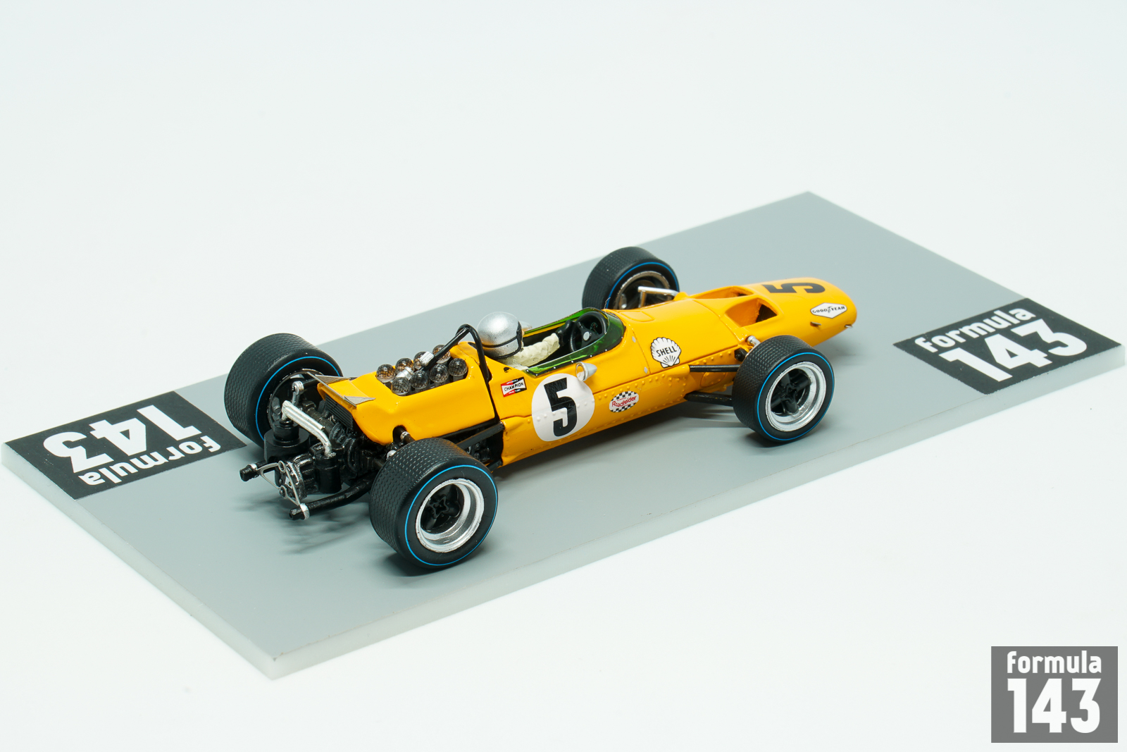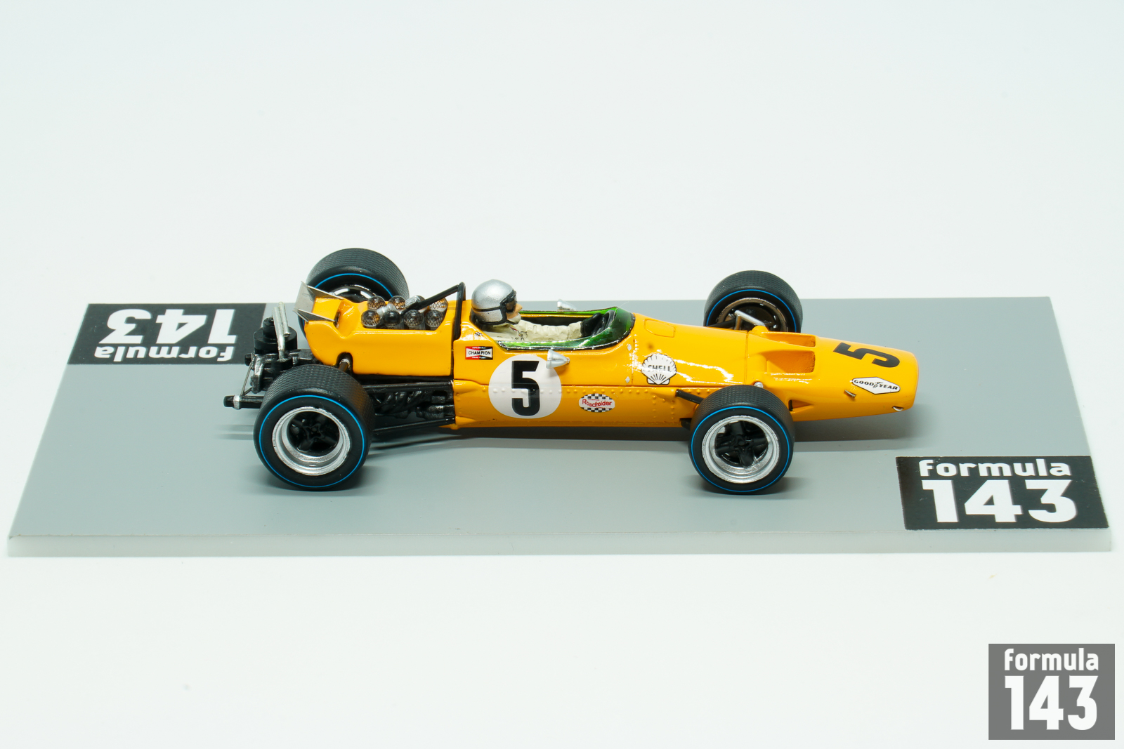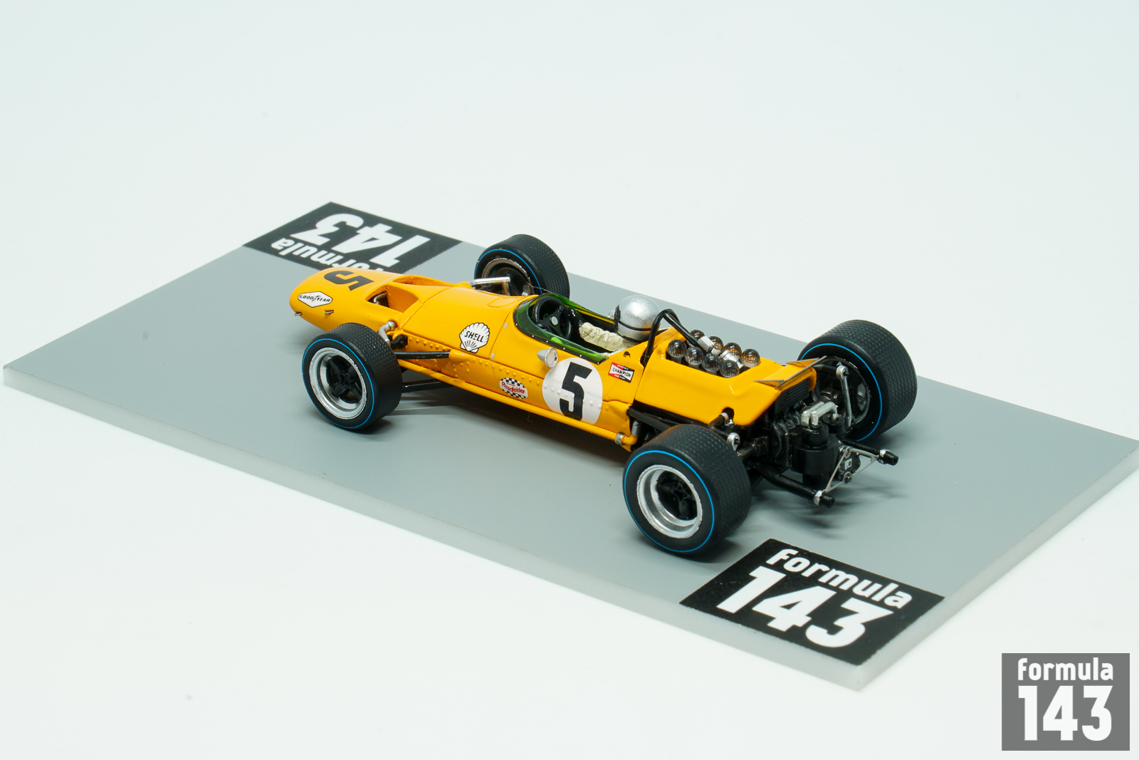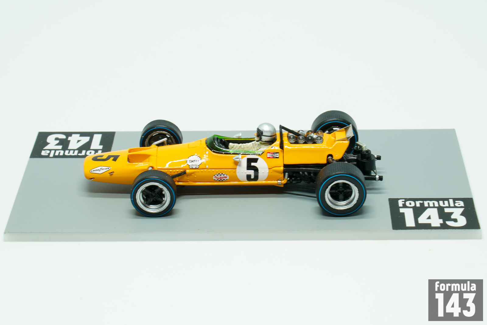 The M7A was designed in 1968 by Robin Heard and Gordon Coppuck. The chassis was a bathtub-type monocoque made from 22-gauge aluminium alloy and 20-gauge magnesium alloy panels glued and riveted together and to three steel bulkheads. The Ford Cosworth DFV engine was used as a stressed part of the chassis, bolted directly to the rearmost bulkhead. The M7A was used by McLaren works team in 1968-69, and a few cars were sold to a couple of private team. In the 1968 season McLaren M7A cars was driven by New Zealanders Bruce McLaren and Denny Hulme. McLaren won in Belgium, was second in Canada and Mexico and finished season 5th with 22 points. Hulme took two wins (in Italy and Canada) and was 3rd in the Drivers’ Championship with 33 points. McLaren team finished the season 2nd in the constructors standings behind Team Lotus.