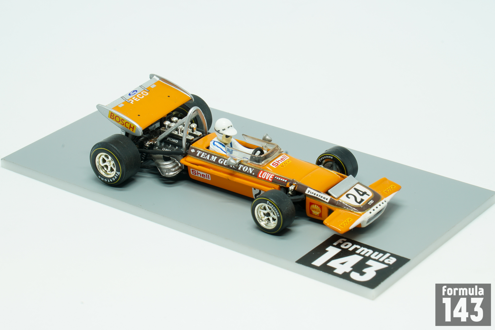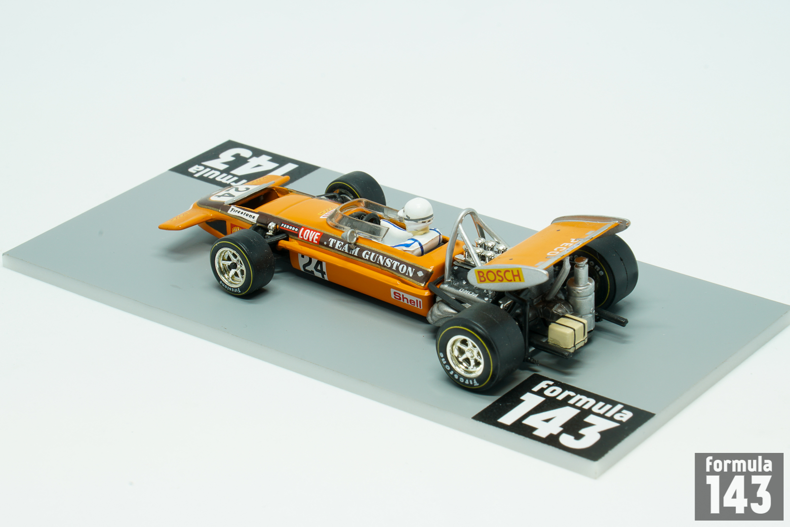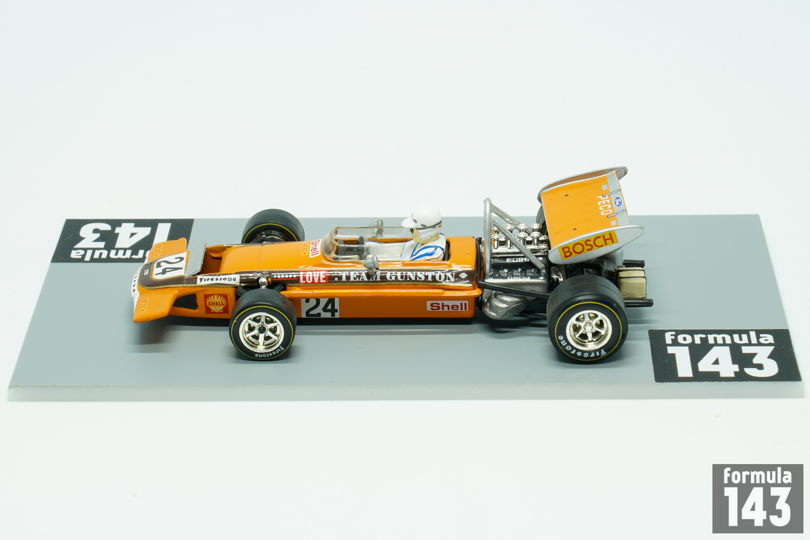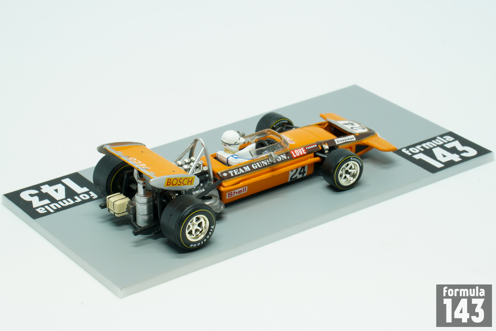 March 701 was the first F1 design by March Engineering. Despite Jackie Stewart has described the car as “the most difficult F1 car I drove”, he was able to achieve the maiden victory for the constructor in its second Championship’ race at 1970 Spanish GP in Jarama. March 701 throughout 1970 season was used by many entrants, including the March works team, Ken Tyrrell Racing Organization and STP Corporation. New model 711 was introduced by March in 1971, but older 701 continued to be used by several private teams. Rhodesian John Love, dominating driver in southern Africa in the 1960s, who won the South African Formula One Championship six times in succession from 1964 to 1969, was regular entrant in South African Grand Prix in 1962-72. He raced with his own team sponsored by Gunston cigarettes make. Team Gunston became the first Formula One team to implement sponsorship brands as a livery at the 1968 South African Grand Prix. In 1970 edition of the race Love driving Team Gunston March 701 finished 8th.