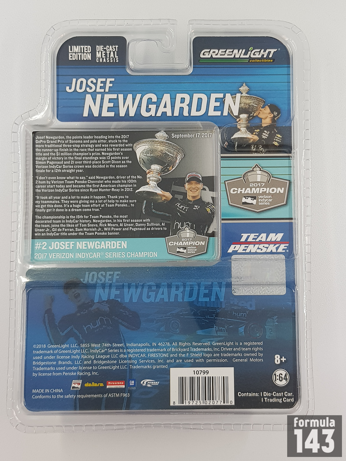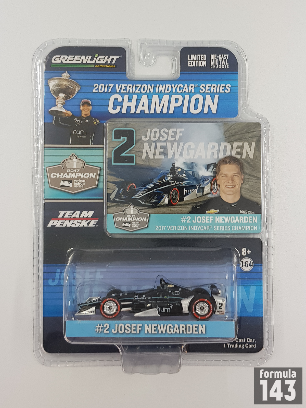 Josef Newgarden won 2011 Indy Lights series and raced in InsyCars since 2012 in three various teams, winning three races in 2015 and 2016 seasons. For 2017 he signed a multi-season deal with Team Penske, undoubted series leading team alongside Chip Ganassi Racing. Newgarden won his first race with Team Penske during round 3 of the 2017 season at Barber Motorsports Park; clinching the victory after a duel with Scott Dixon in the final laps. Josef continued his winning series in Toronto, Mid-Ohio and Gateway, and secured his first championship in close battle with his teammate Simon Pagenaud, 2016 series champion, and Chip Ganassi driver Scott Dixon. Newgarden used five different liveries throughout the season. This black and blue Hum by Verizon colors was the main variant used in eight out of 17 races of the season (at Phoenix, Texas, Long Beach, IndyCar Grand Prix, Indy 500, two races at Detroit and at Sonoma). Others were silver Verizon livery (St. Petersburg), black and green Fitzgerald Glider (Barber, Iowa and Pocono), blue and white PPG Pants (Mid-Ohio and Gateway), and orange and white deVillbiss (Road America, Toronto and Watkins Glen).