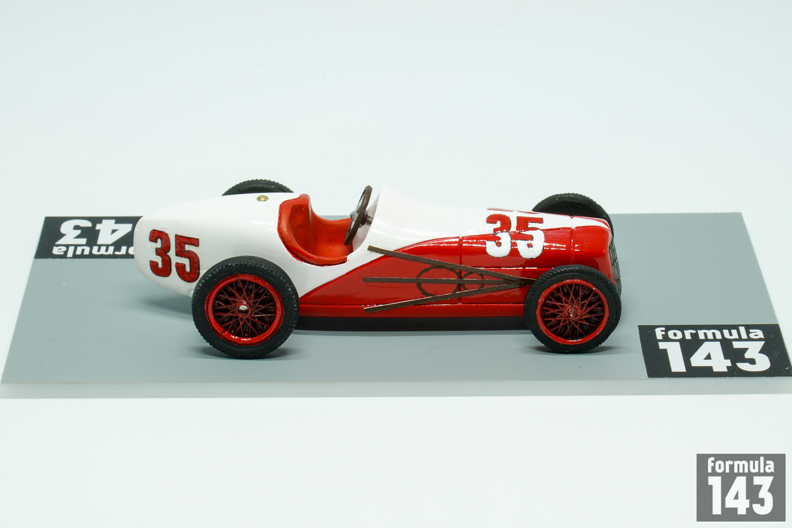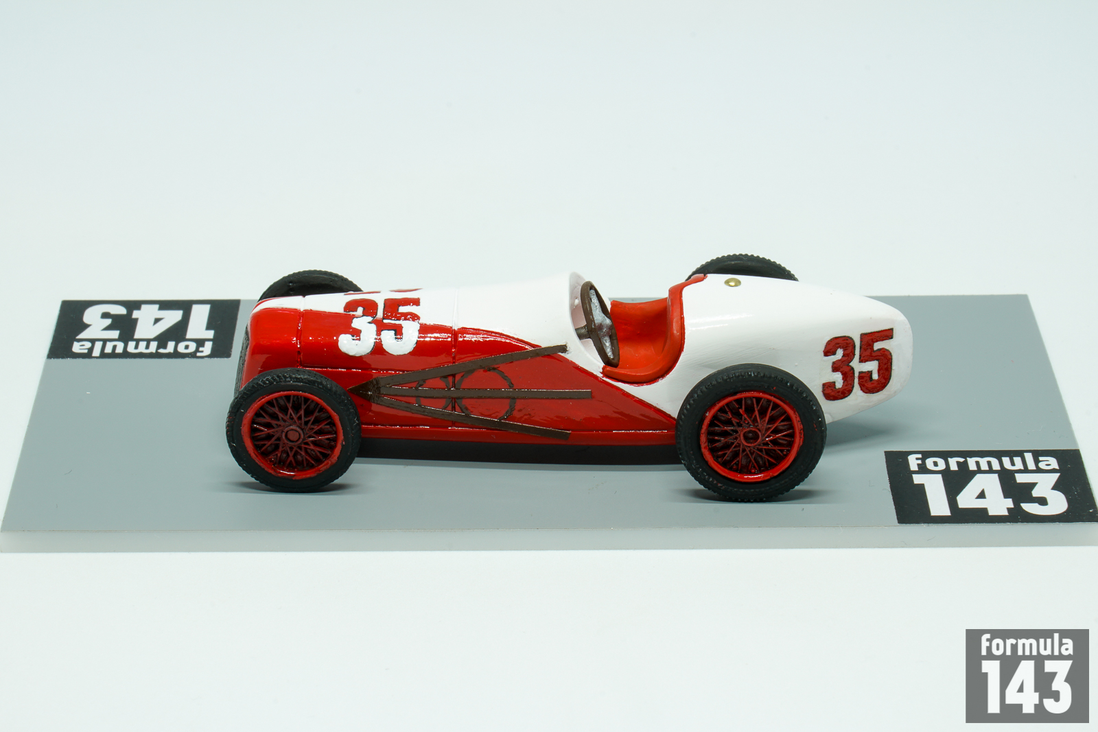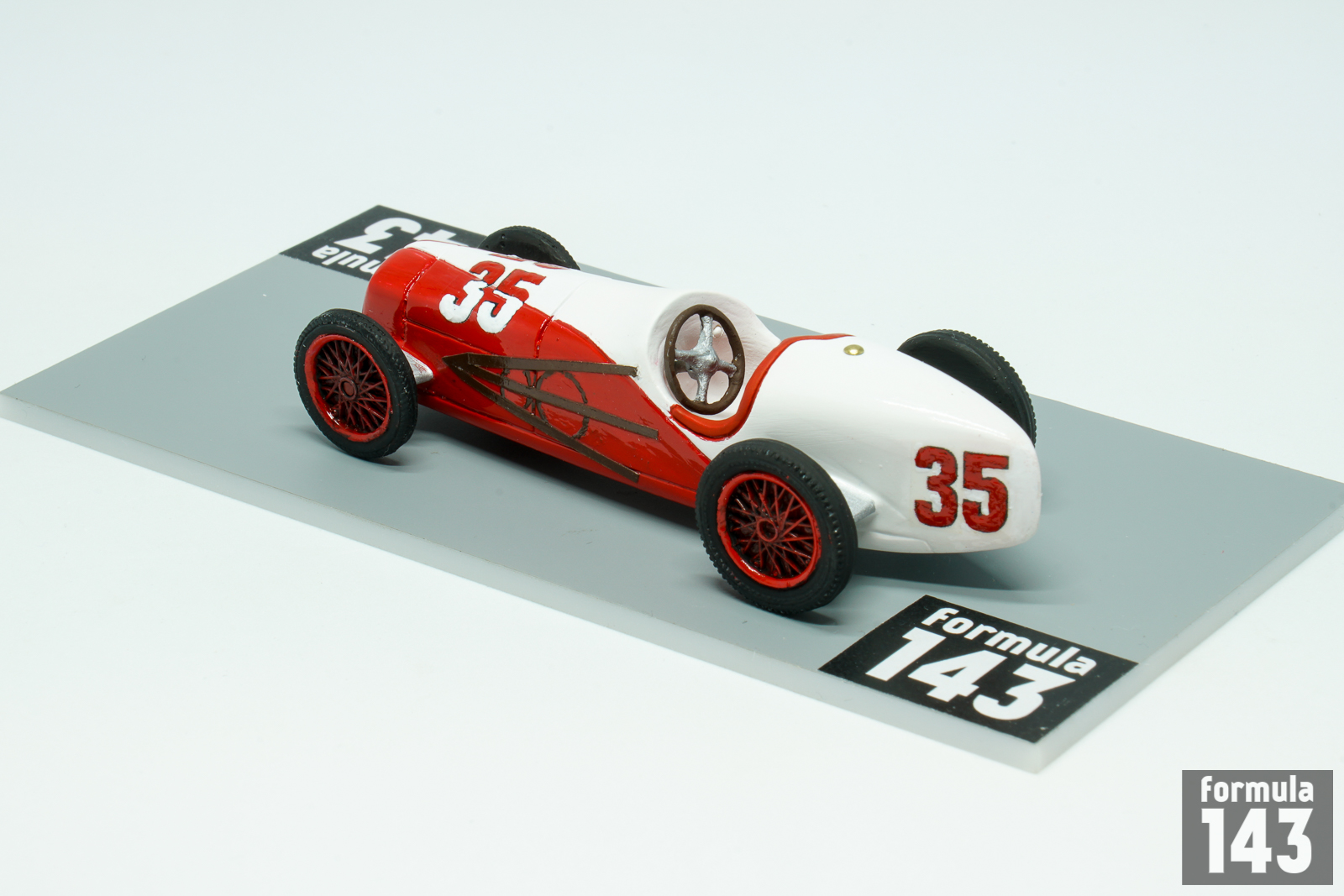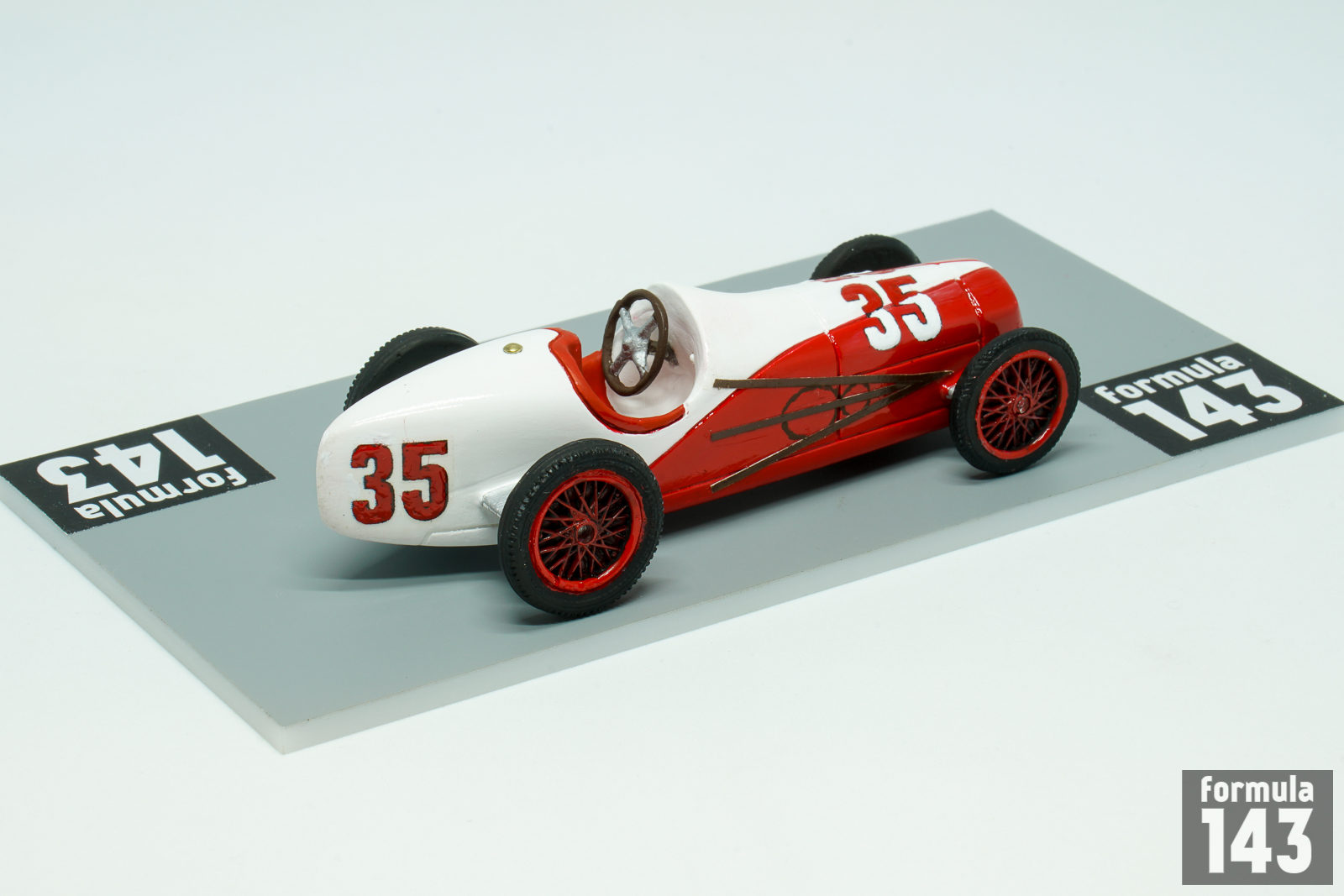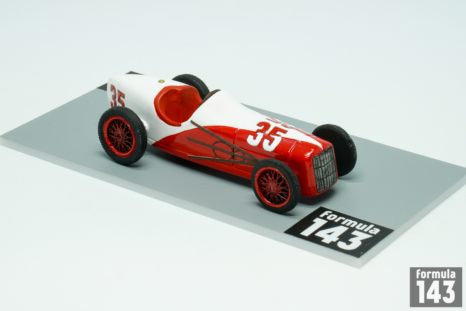 Harry Miller, one of America’s most important racing designers, has been involved in the cars and engines design for speedway motor racing since 1920s. Jimmy Murphy was who first won with it. Miller-powered Jimmy Murphy’s Duesenberg raced to victory in the 1922 Indianapolis 500. Miller then progressed to making Miller single-seater race cars that used supercharged versions of his 2.0 and 1.5 liter (122 and 91 in³) engines. The engines took four more wins in the 500 up to 1929, twice (1926 and 1928) in Miller chassis, and won the race another seven times between 1929 and 1938 (twice again, in 1930 and 1932, in Miller chassis). After Miller declared bankruptcy in 1933, his shop foreman and chief machinist Fred Offenhauser purchased the business and continued development of the engine as the Offenhauser which raced successfully until the 1980s. In 1935 Miller with Indianapolis 500 enthusiast Preston Tucker formed Miller and Tucker, Inc. New company built ten modified Ford V-8 racers for 1935 Indy 500. The cars were powered by Ford V-8, L-head valves, 221 cubic inches engine developing 150 horsepower. Ten cars were entered by Miller for Indianapolis 500. Six of them, driven by Billy Winn (#10), George Barringer (#23), Dave Evans (#32), Johnny Rae (#47), Wesley Crawford (#48), and Lora Corum (#49) failed to qualify. Other four started the race driven by George Bailey (#35), Johnny Seymour (#42), Ted Horn (#43), and Bob Sall (#46). But a hurried production schedule and insufficient time available for their development and testing led to mechanical problems and none finished the race. The weakest point was steering boxes, installed too close to the exhaust, overheated and locked up –all four retired with same problem. All cars were painted in double livery with stylized V8 sign. Bailey’s car was silver-red, Seymour’s – silver-blue, Horn’s- black-white, and Sall’s – gold-white. The cars then were sold to privateers, and examples ran at Indianapolis through 1948. The car represented in this scale model is Miller piloted by George Bailey in 1935 Indianapolis 500. Bailey raced in AAA championship since 1931 and never won the race. He was killed in a crash during practice for the 1940 Indianapolis 500, when his gasoline tank exploded after he lost control of his car and skidded sideways into a concrete wall.