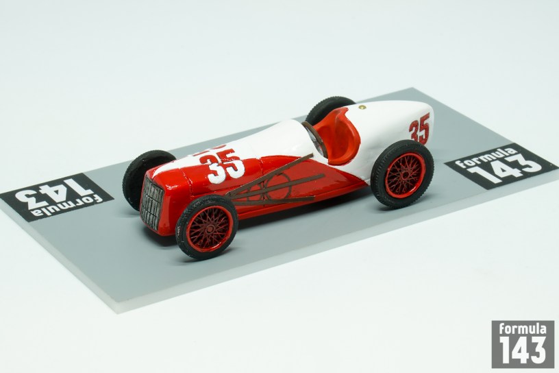 Harry Miller, one of America’s most important racing designers, has been involved in the cars and engines design for speedway motor racing since 1920s. Jimmy Murphy was who first won with it. Miller-powered Jimmy Murphy’s Duesenberg raced to victory in the 1922 Indianapolis 500. Miller then progressed to making Miller single-seater race cars that used supercharged versions of his 2.0 and 1.5 liter (122 and 91 in³) engines. The engines took four more wins in the 500 up to 1929, twice (1926 and 1928) in Miller chassis, and won the race another seven times between 1929 and 1938 (twice again, in 1930 and 1932, in Miller chassis). After Miller declared bankruptcy in 1933, his shop foreman and chief machinist Fred Offenhauser purchased the business and continued development of the engine as the Offenhauser which raced successfully until the 1980s. In 1935 Miller with Indianapolis 500 enthusiast Preston Tucker formed Miller and Tucker, Inc. New company built ten modified Ford V-8 racers for 1935 Indy 500. The cars were powered by Ford V-8, L-head valves, 221 cubic inches engine developing 150 horsepower. Ten cars were entered by Miller for Indianapolis 500. Six of them, driven by Billy Winn (#10), George Barringer (#23), Dave Evans (#32), Johnny Rae (#47), Wesley Crawford (#48), and Lora Corum (#49) failed to qualify. Other four started the race driven by George Bailey (#35), Johnny Seymour (#42), Ted Horn (#43), and Bob Sall (#46). But a hurried production schedule and insufficient time available for their development and testing led to mechanical problems and none finished the race. The weakest point was steering boxes, installed too close to the exhaust, overheated and locked up –all four retired with same problem. All cars were painted in double livery with stylized V8 sign. Bailey’s car was silver-red, Seymour’s – silver-blue, Horn’s- black-white, and Sall’s – gold-white. The cars then were sold to privateers, and examples ran at Indianapolis through 1948. The car represented in this scale model is Miller piloted by George Bailey in 1935 Indianapolis 500. Bailey raced in AAA championship since 1931 and never won the race. He was killed in a crash during practice for the 1940 Indianapolis 500, when his gasoline tank exploded after he lost control of his car and skidded sideways into a concrete wall.