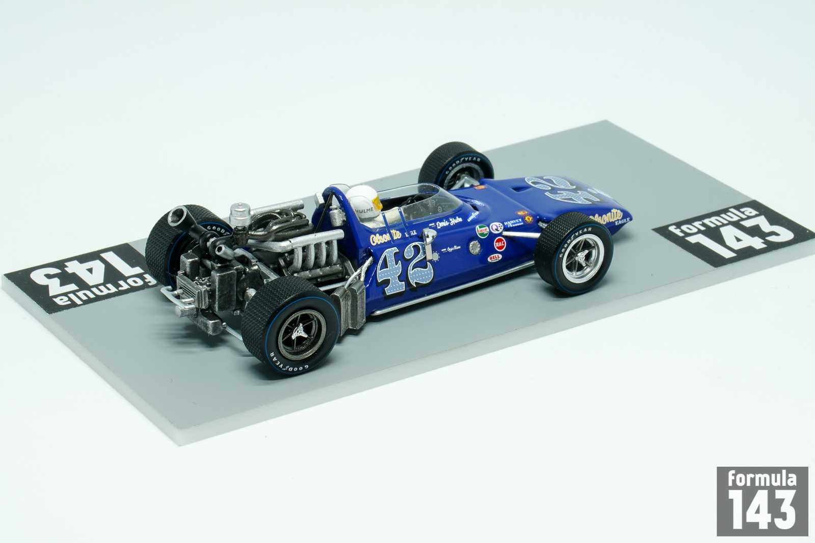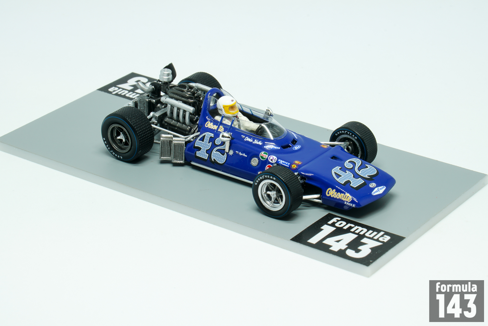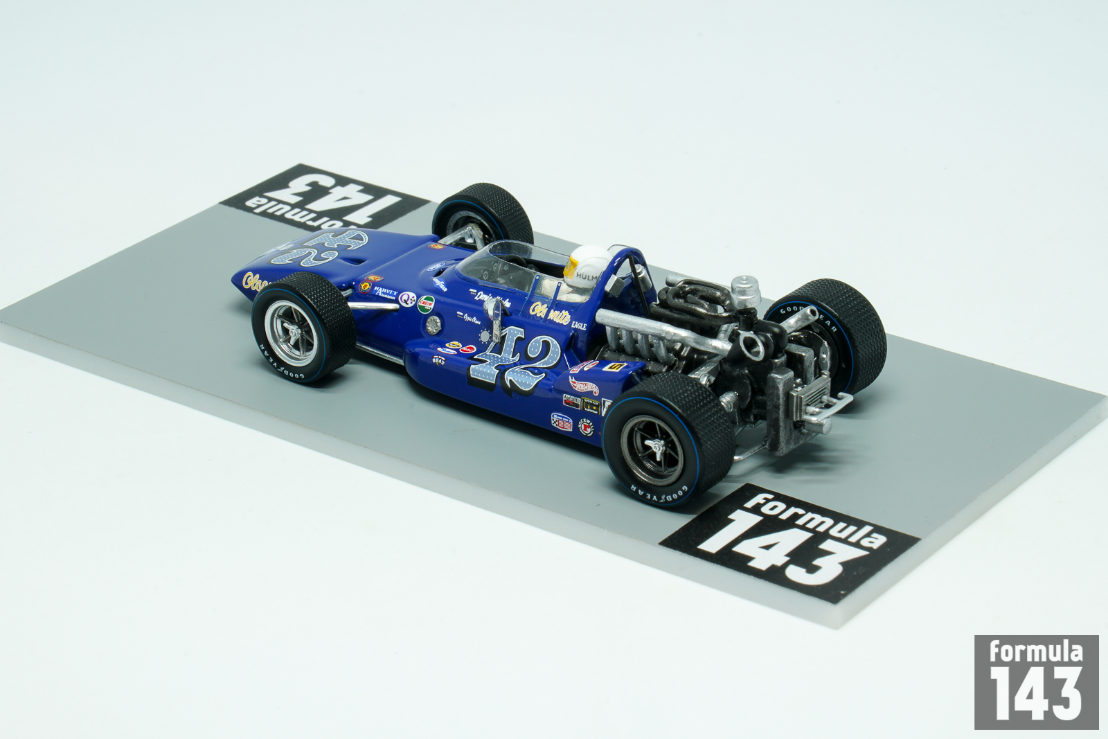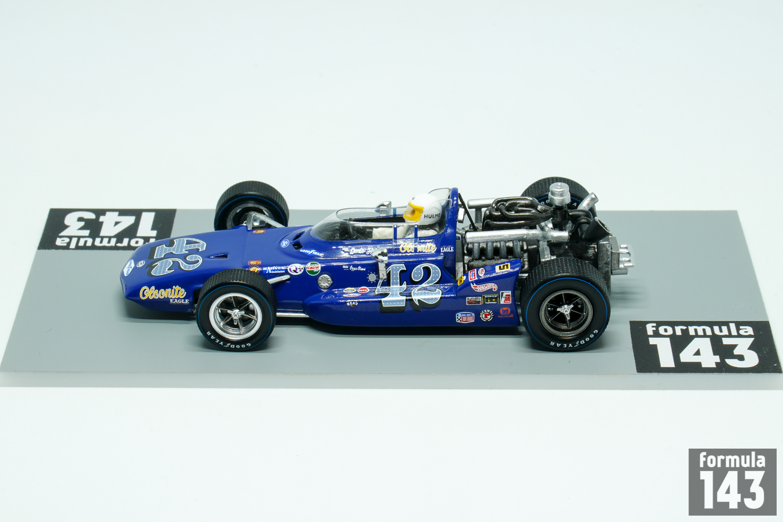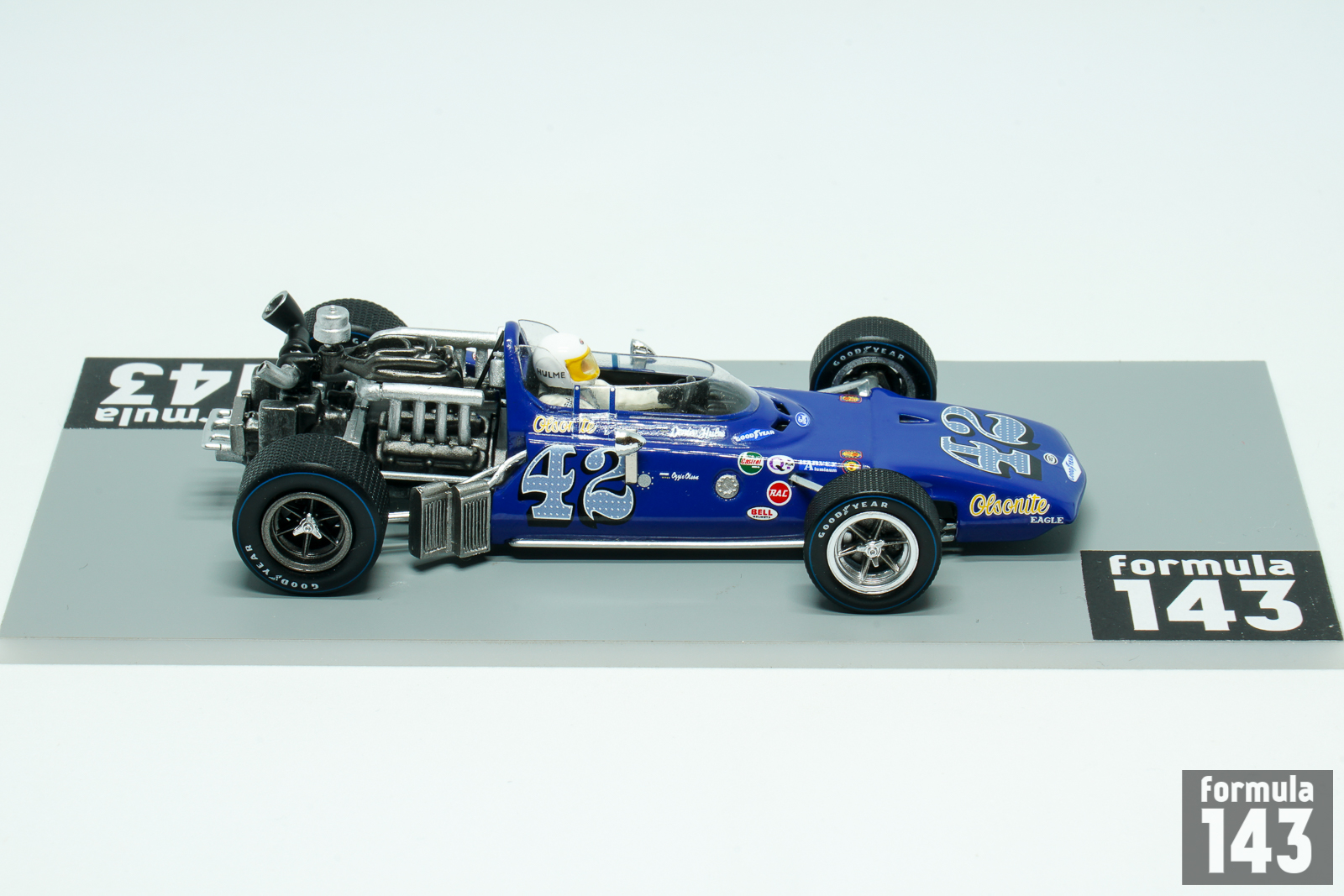 The 1969 Eagle, Mk7 was designed by young engineer Tony Southgate, who worked previously for Lola and Brabham, and joined Dan Gurney’s Anglo American Racers (AAR) in 1967. The model was also called the Eagle Santa Ana, named after AAR’s home town. The basic layout of the car was based on existing successful designs, the wedge shape being based on the Lotus 56 and the Brabham-style outboard front suspension was the same as that used on the successful Hawk and Mongoose cars. The first car was not ready until late April, leaving very little time to develop such a radically new design, and the team struggled for straight line speed during the month of practice at Indianapolis. Four ’69 cars were built for the 1969 Indianapolis 500. Dan Gurney’s entry #48 was fitted with a 318 ci Gurney Weslake Ford stock block V8 engine. Three other cars used 159 ci Ford quad cam turbo V8 engines. Car #44, painted in gold livery and officially called the City of Daytona Beach, was entered by Henry “Smokey” Yunick from Daytona Beach, FL for Joe Leonard. Car #42 was driven by Denny Hulme as Olsonite factory entry. The fourth car, #7, was AAR backup car and only run briefly in practice at the Indy 500 and then not used again. All three ran very well in the race, with Eagles running 2-3-4-5 at one point. Dan Gurney’s car finished the race in second place. Joe Leonard was black-flagged on lap 150 for leaking fluid. He made a long pit stop to replace a punctured radiator, returned to the race, and managed a 6th-place finish. Denny Hulme retired after 145 laps due to broken clutch.