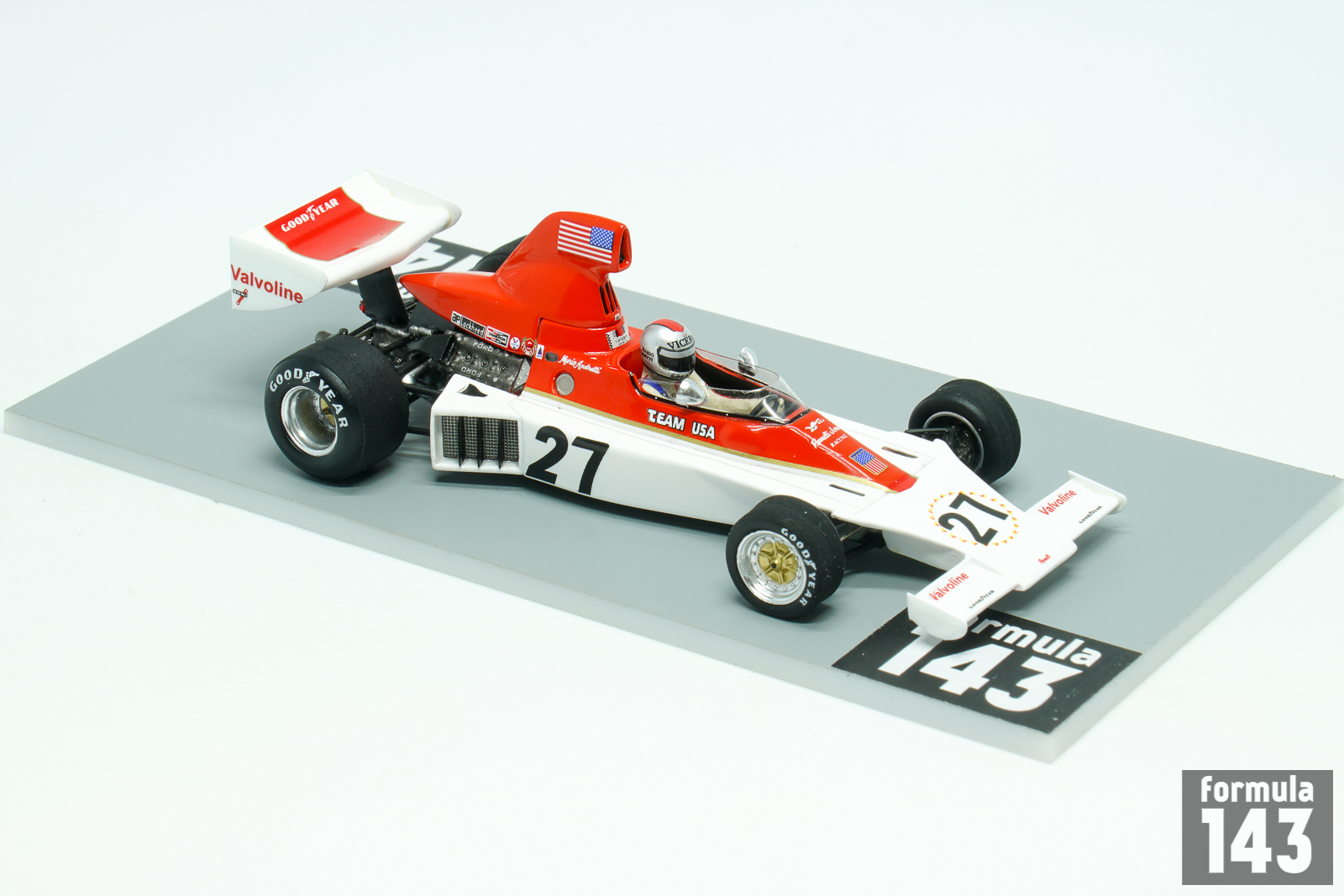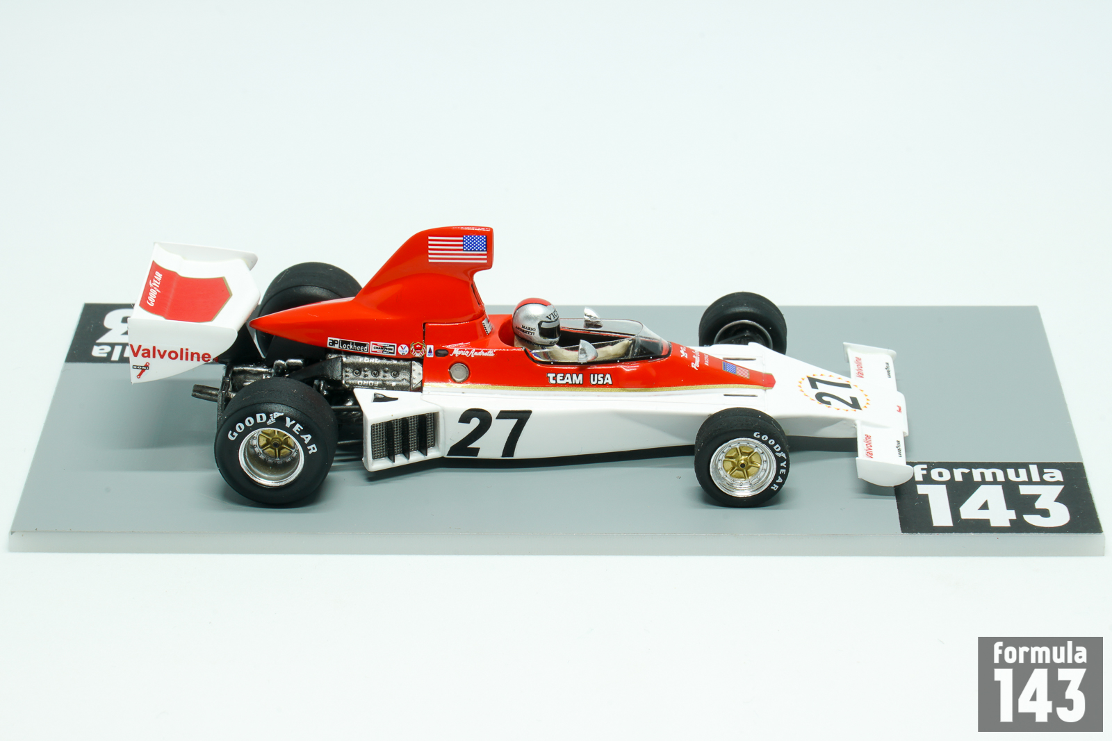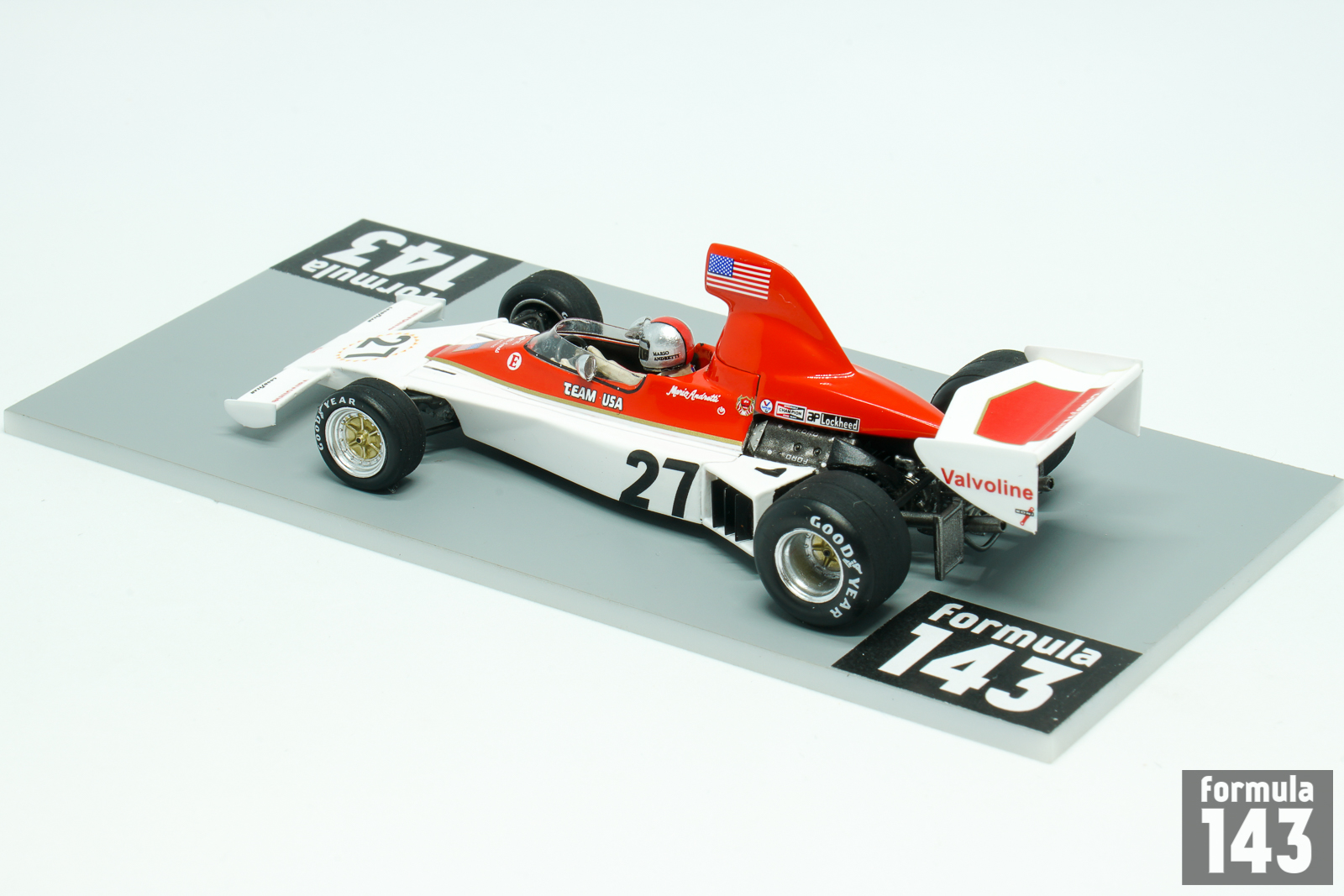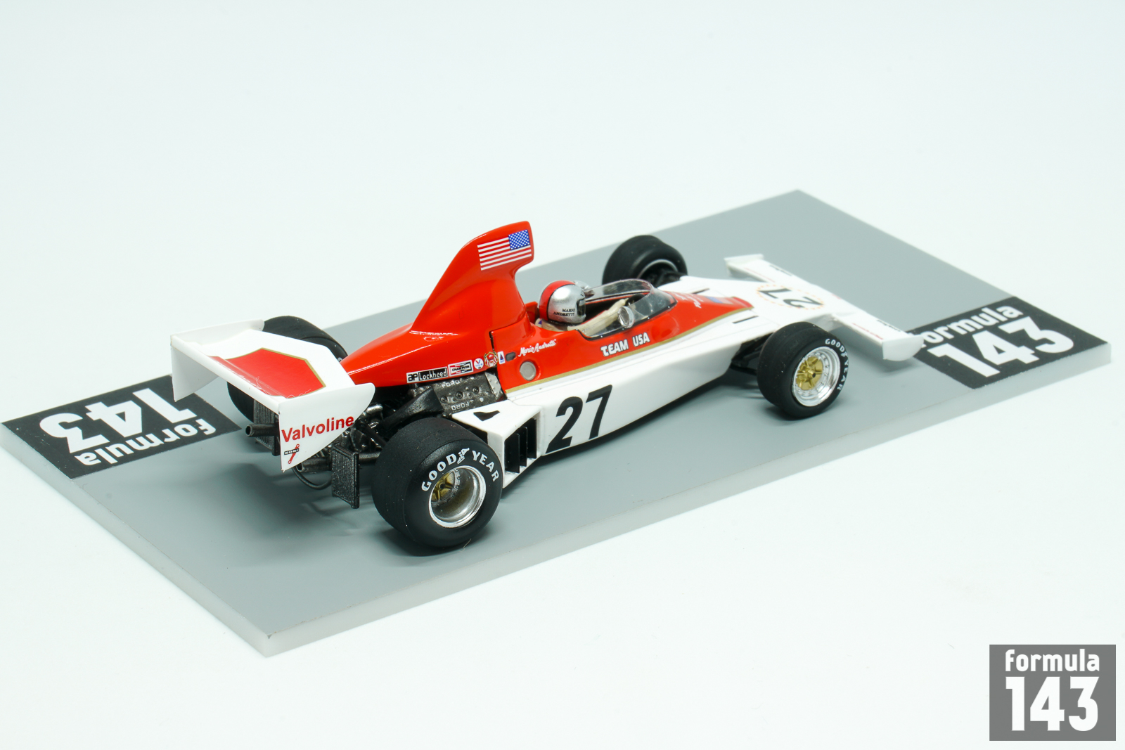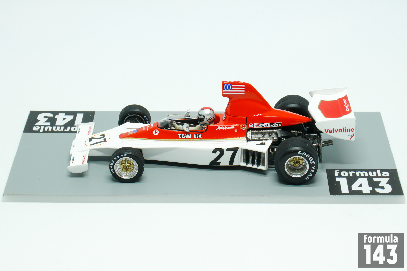 Former USAC racer Parnelli Jones and his business partner Velko “Vel” Miletich set up Vel’s Parnelli Jones Racing in 1969. Parnelli team was initially solely concerned with USAC racing, then Formula A (F5000). Parnelli secured the services of ex Team Lotus designer Maurice Philippe and driver Mario Andretti for USAC racing in the early 1970s and in 1974 decided to move into Formula One racing, with financial support from tire manufacturer Firestone. The VPJ4 car was designed by Philipp based on Lotus 72 concept, with overall wedge shape, hip radiators, inboard brakes, and typical Cosworth / Hewland engine / gearbox combination. Team debuted in last two rounds of the 1974, and continued in 1975 full season. Mario Andretti started in 12 championship races, led at the Spanish Grand Prix before retiring and finished fourth in Sweden and fifth in France.