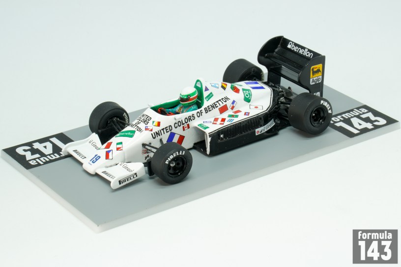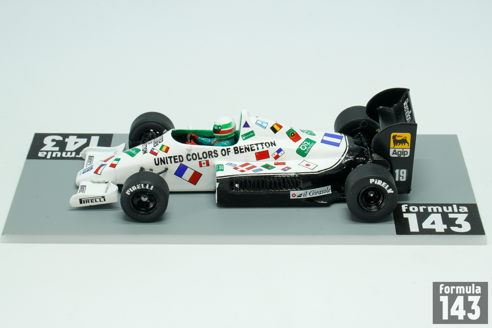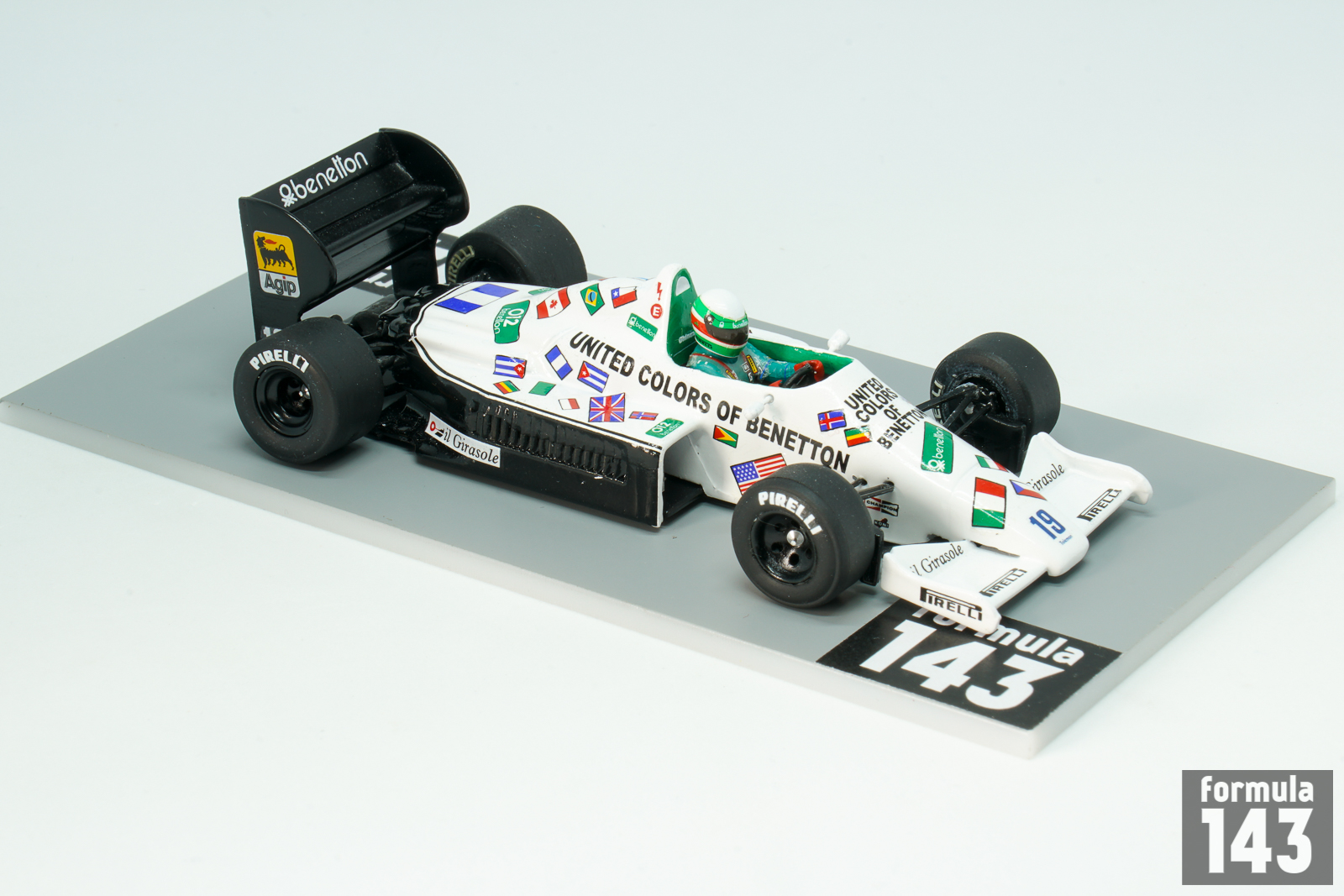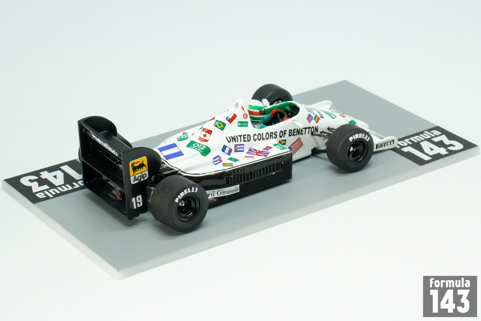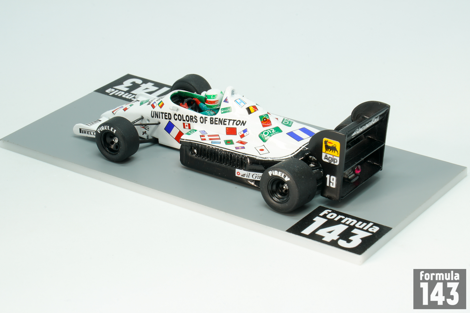 The Toleman TG185, designed by Rory Byrne, was a further modification of TG184. The car had new monocoque (the first produced in-house), and was powered by Hart turbo engine. Due to problems with Pirelli tyres supply, the team missed first three races of the 1985 season. At first, a single car was entered for Italian Teo Fabi, who had previously driven for the team in 1982. From the Austrian Grand Prix onwards, a second car was entered for another Italian driver, Piercarlo Ghinzani, who joined the team from Osella. Fabi won Toleman its first and only pole position at the German Grand Prix, but this was to be the team’s only highlight of 1985. TG185 was extremely unreliable and saw the finish line just twice all year, when Fabi finished 14th in France and 12th in Italy. The car is most notable by its bright Benetton livery with national flags of many countries.
