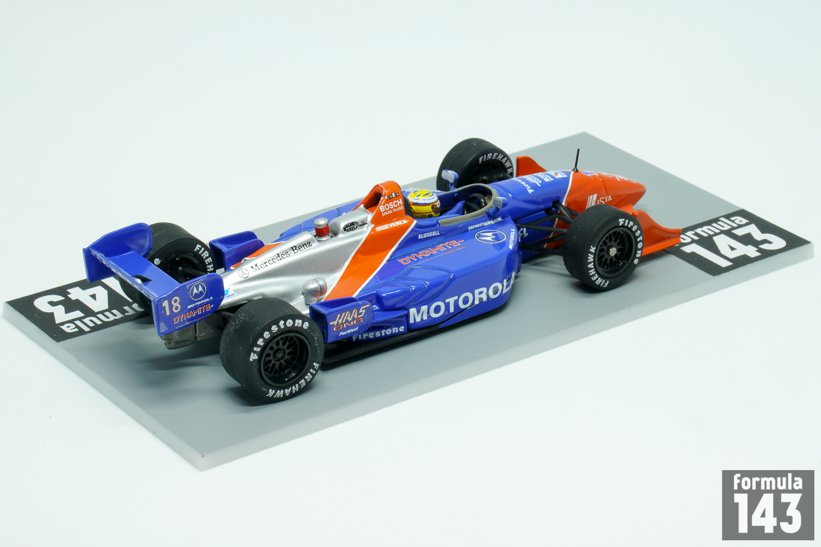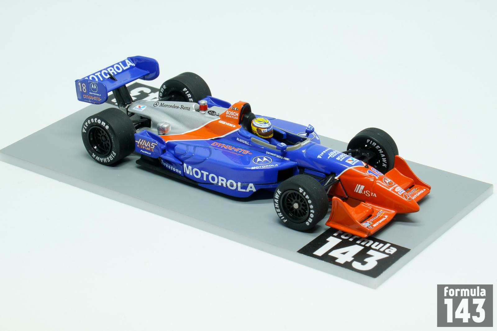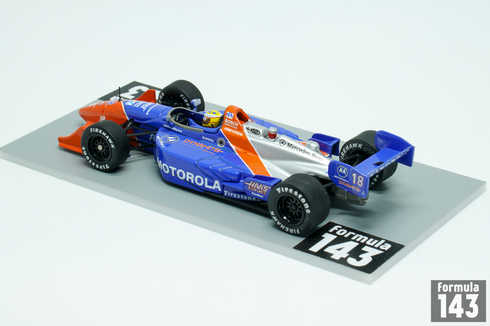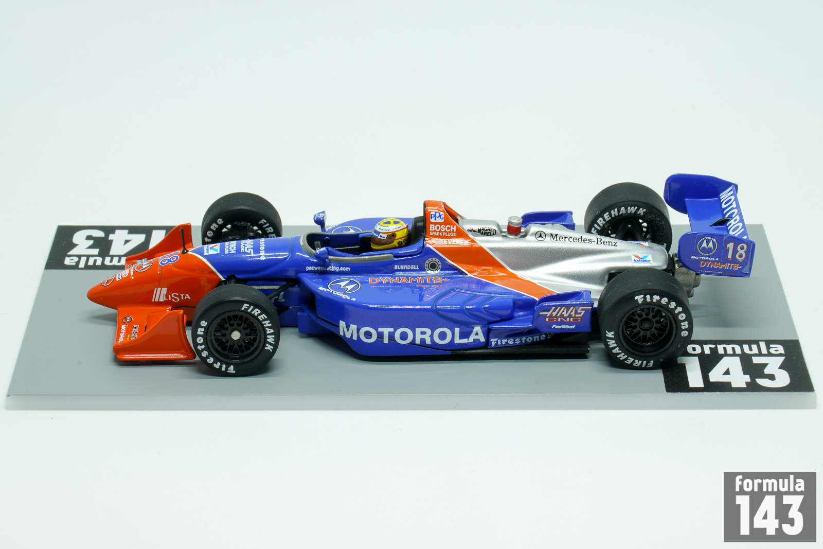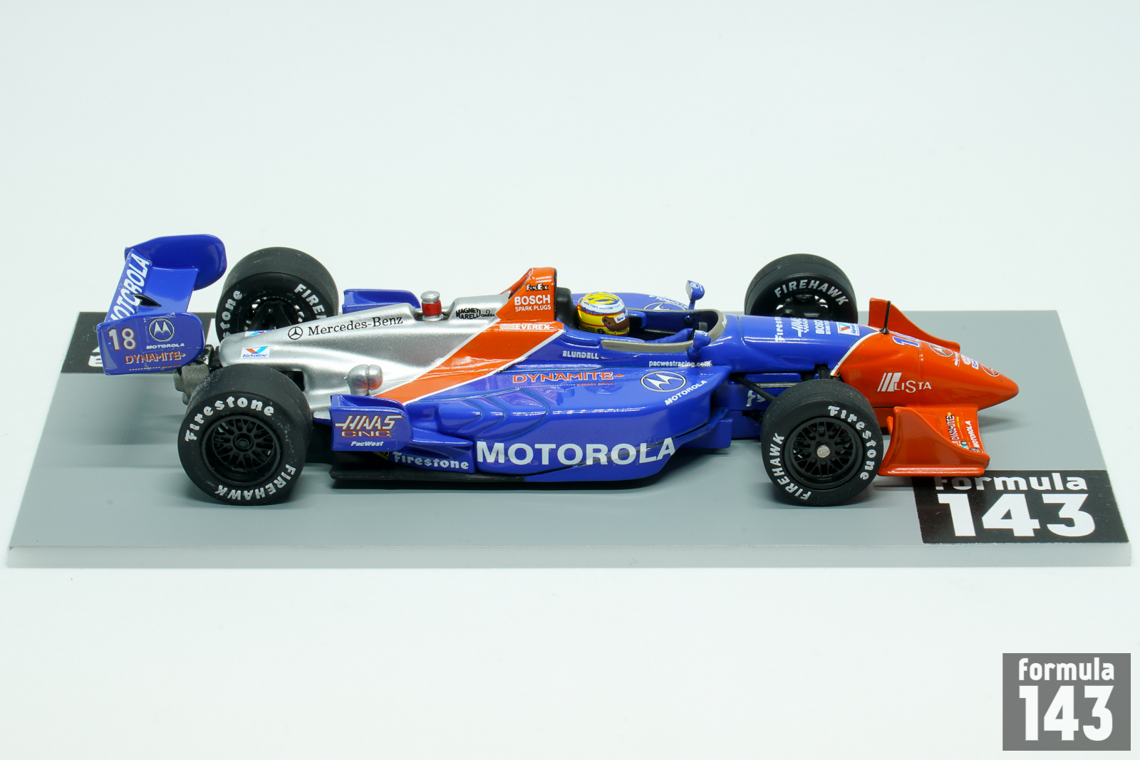 PacWest Racing was a CART racing team owned by Bruce McCaw founded in 1993. The team’s first full-time season was the next year, 1994. In 1996 British Mark Blundell quit Formula One and moved to the United States and joined PacWest, alongside fellow former Formula One driver Maurício Gugelmin. The 1997 season was most successful for PacWest – Blundell won three races, and Gugelmin added one more victory. For 1998 CART season PacWest has retained the driver’s line-up, as well as chassis and engine combination –new Reynard 98 Indy powered by a Mercedes Benz V-8 turbocharged racing engine that produced approximately 900 horsepower. Blundell’s car #18 was sponsored by Motorola, and Guglemin’s #17 by Hollywood Cigarettes. The 1998 championship proved not to be as successful. Setbacks plagued the team and they struggled to get to grips with the new chassis. Gugelmin scored nine points-scoring finishes and was 15th in the championship, and Blundell with 6 point-scoring results and best finish as 6th at Fontana was 18th in the championship.