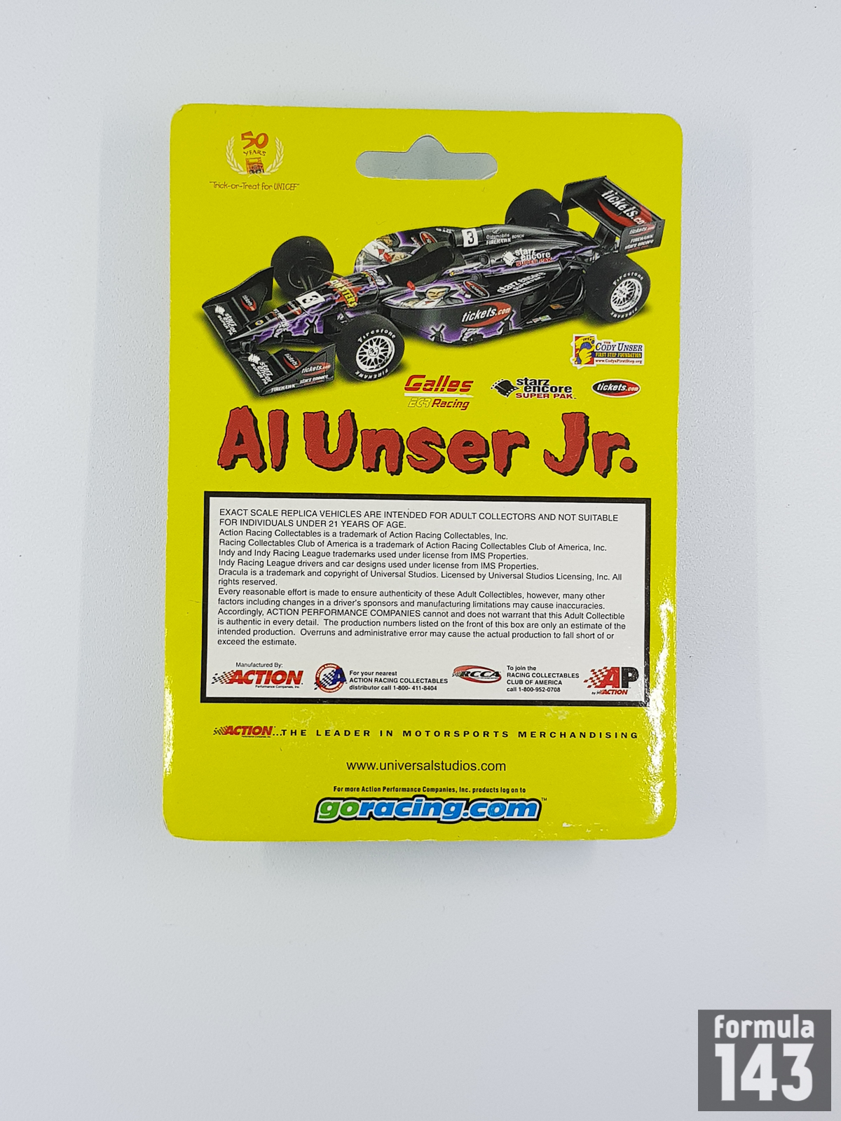 In celebration of the Dracula, world’s most famous horror film characters and the upcoming Halloween season, Action Performance and Universal Studios Consumer Products Group have enlisted drivers from the Indy Racing Series, NASCAR’s Winston Cup and Busch circuits, and NHRA, to sport specially designed Monsters’ paint schemes at select races in October 2000.The livery of Unser’s car, has been altered to carry a Dracula motif for the Indy Racing Series season finale, the Excite 500, on October 15 at Texas Motor Speedway. Action Performance offered die-cast replicas and related promotional merchandise showcasing the teams and their respective Universal Studios Monsters. “In the spirit of Dracula, we are looking forward to getting our teeth into the opposition,” said Unser before the Texas race, when he finished only 17th.