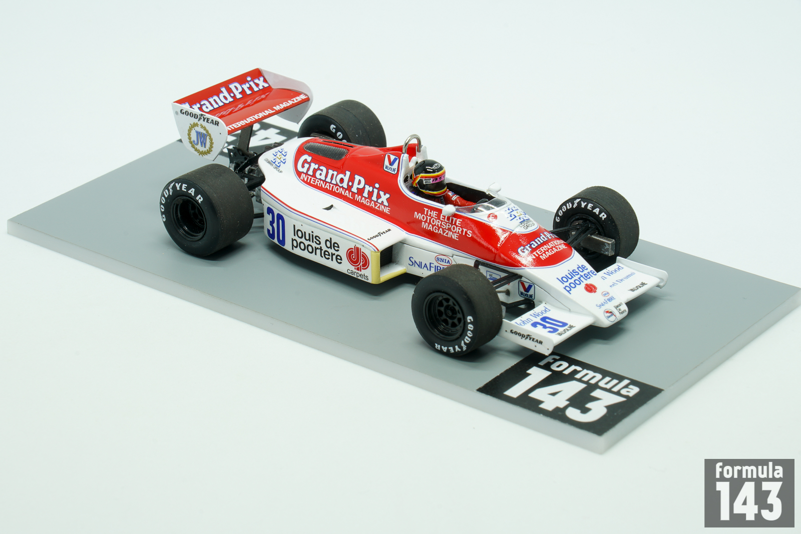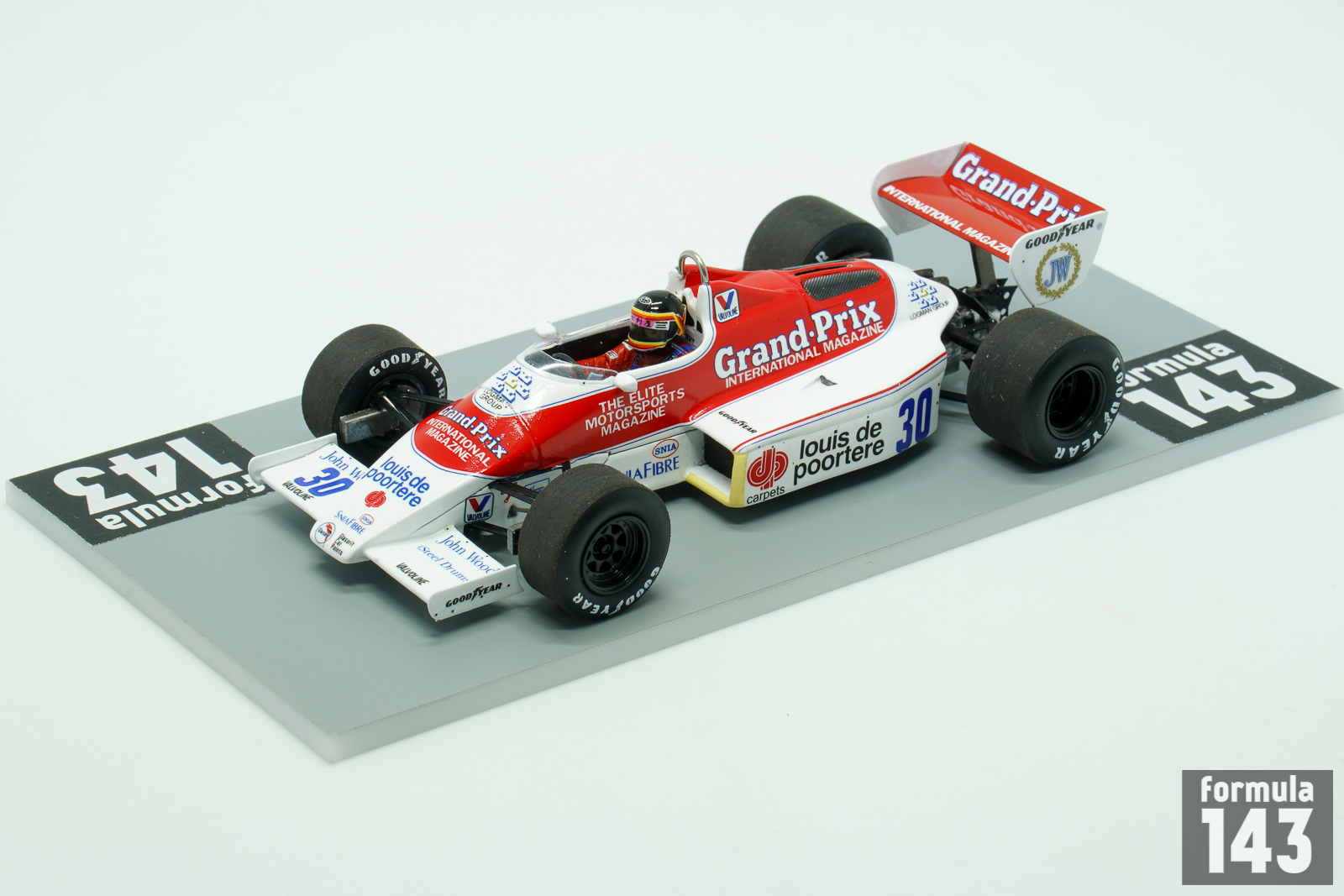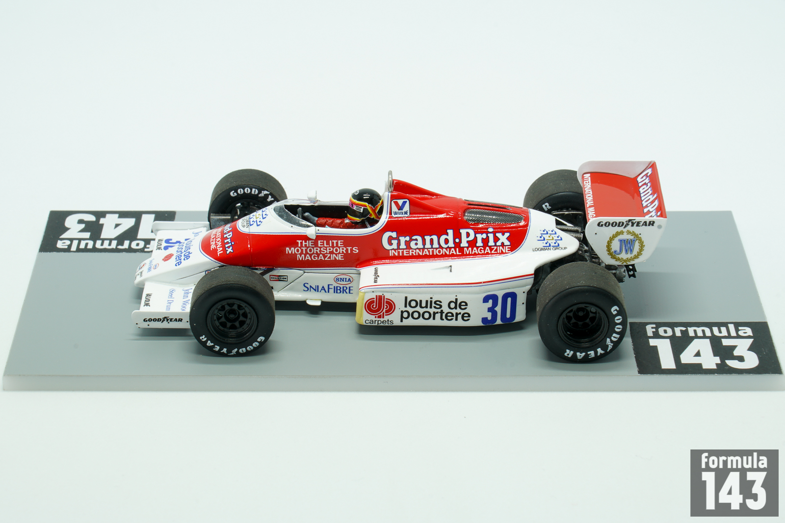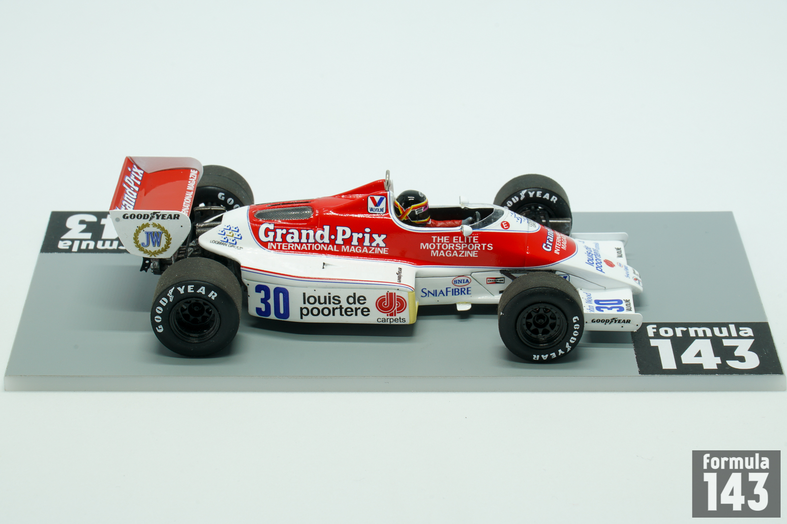 Arrows A6 was designed by David Wass and was raced in the 1983 and 1984 seasons. The A6 became a modest development of the reasonable A5, mostly focused on making it comply with the new regulations that banned refuelling and ground effects, in favour of a flat bottom with a diffuser as the back. An important decision in this respect was the centrally mounted fuel tank, in between the cockpit and the front of the engine, forced the engine to be mounted a little further back than would usually be wanted, giving the car an unusually heavy rear end. The A6 used a honeycomb monocoque frame, as a carbon fibre chassis was too expensive for Arrows. Arrows were one of the last teams to secure a contract for turbocharged engines, so the 1983 Arrows A6 had to use Cosworth DFV engines. The car #29 was piloted by Marc Surer through the whole season, while car #30 initially handed to Chico Serra was given to Thierry Boutsen since the 1983 Belgian Grand Prix. The team experienced financial difficulties and changed sponsors and liveries from race to race.