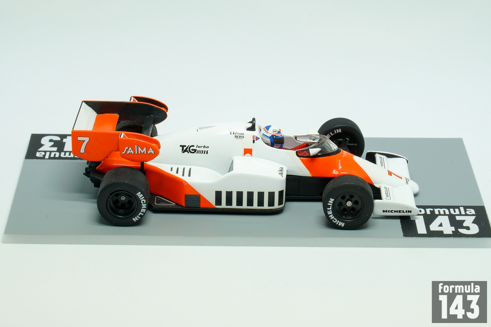 The MP4/2 in A, B, and C specifications saw McLaren trough three seasons (1984 – 1986) to three Drivers’ and two Constructors’ Championships. The MP 4/2 was designed by John Barnard, Steve Nichols, Gordon Kimball, Alan Jenkins, Tim Wright and Bob Bell and was powered by a TAG-Porsche engine, designed by Hans Mezger at Porsche that produced 650 bhp. The car used an all carbon fibre chassis pioneered by the car’s designer John Barnard with its predecessor, the MP4/1, featured broad sidepods, low wishbones in the suspension, and was very aerodynamically efficient. There were 16 championship races in the 1984, and McLaren won 12 (Prost won seven and Lauda five). The Championship was decided in the last round at Estoril. Prost won the race. Lauda moved 2nd, after Mansell retired, ensuring his third World Championship a mere half point in front of Prost in the championship, a record margin that has not been matched since. As of 1984, Prost (future winner of four World Championships) had lost his 3rd consecutive F1 title: he had been beaten by 2 points in 1983, and 7 points in 1982.