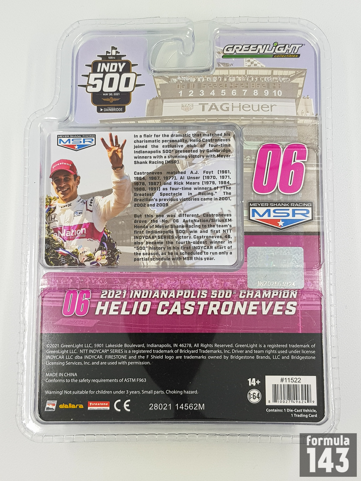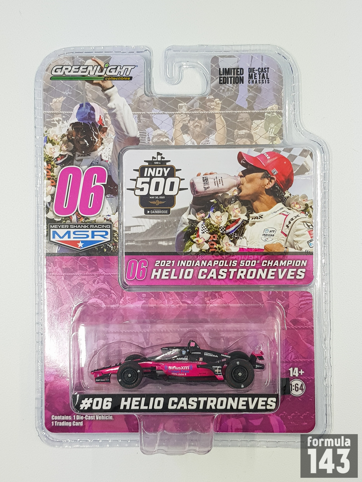 Brazilian Indycar veteran Helio Castroneves signed for the small Meyer Shank Racing team to compete at six races in the 2021 season. At the Indianapolis 500, Castroneves achieved his record-tying fourth career victory in the event after a late-race pass on Alex Palou. He went on to score one more top ten finish at Nashville in his final five races of 2021 to finish 22nd overall with 158 points. This scale model is Indy 500 winner Greenlight model. It is identical to the model is from 2021 Indy 500 top-3 set.