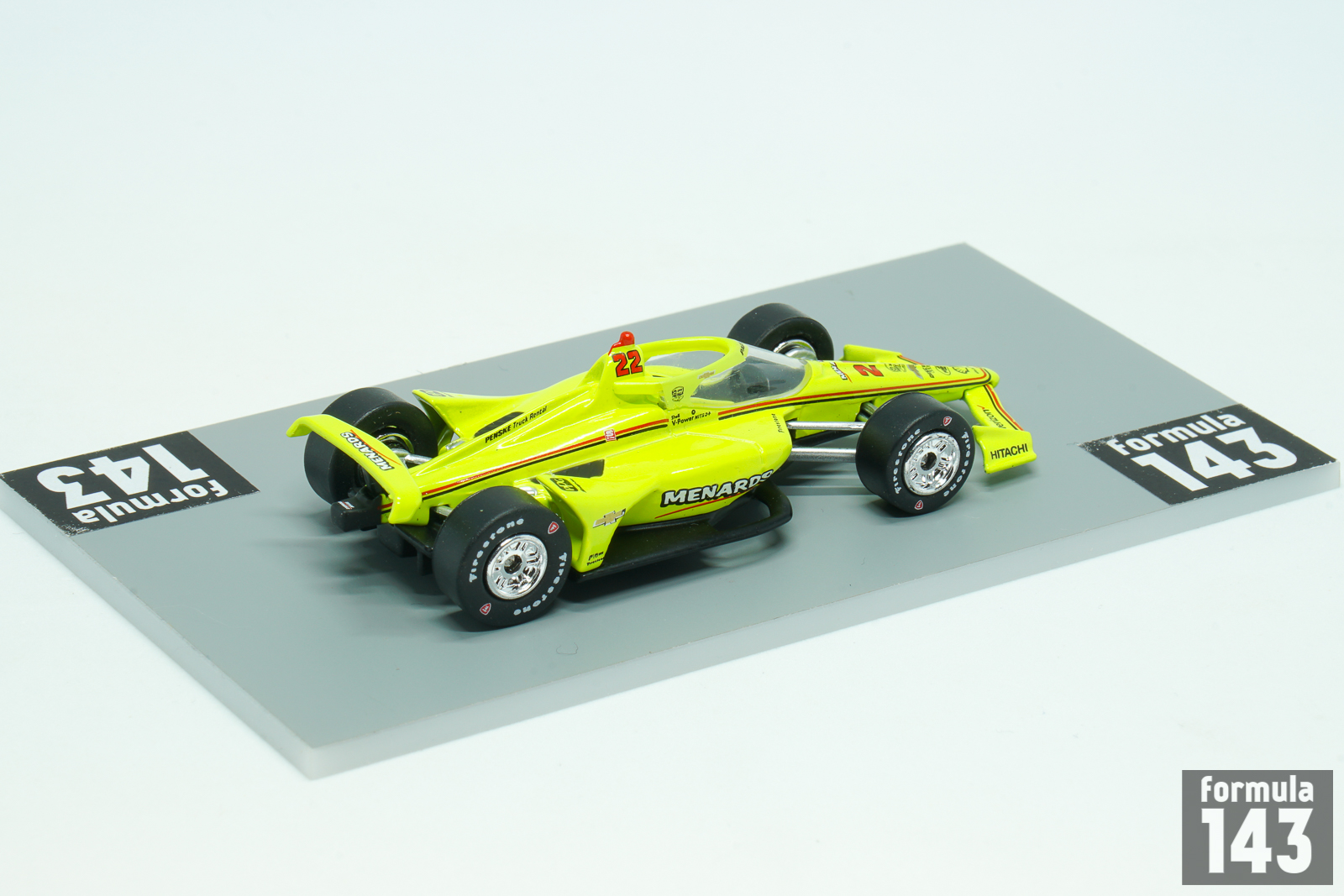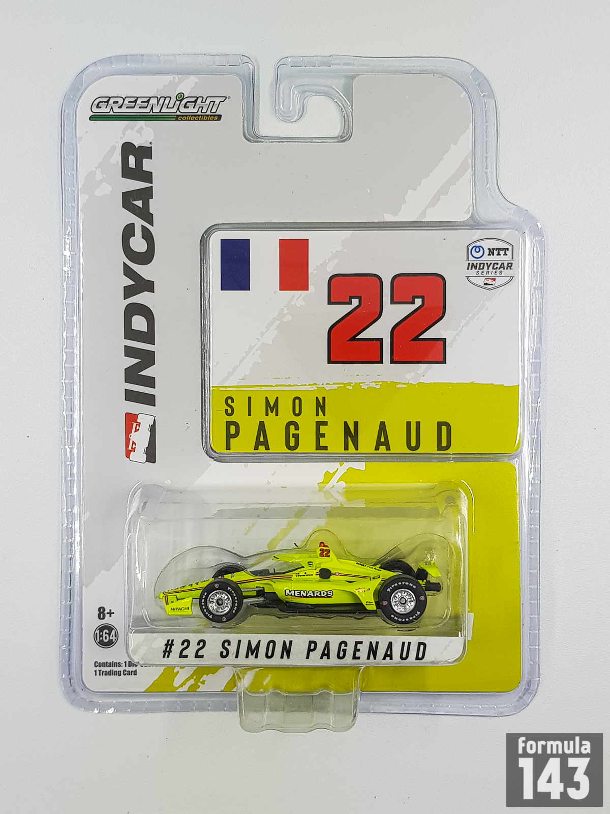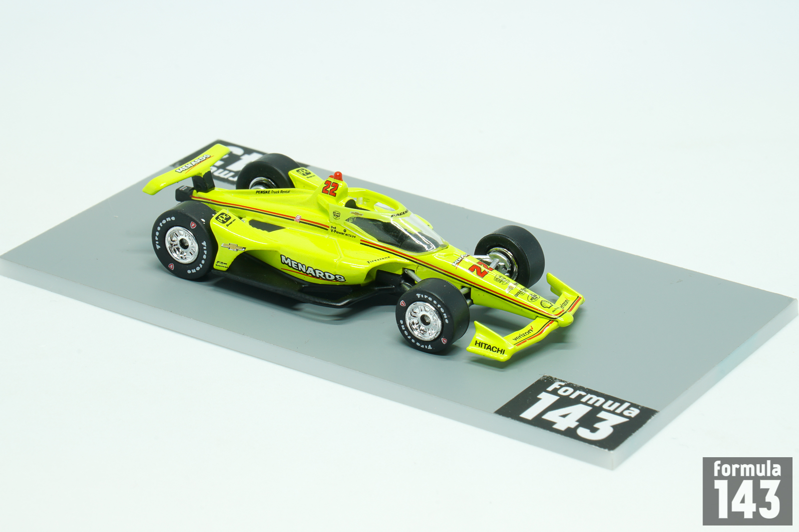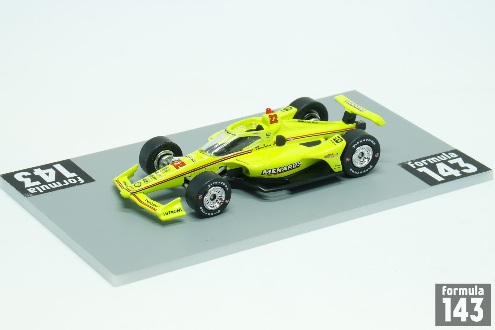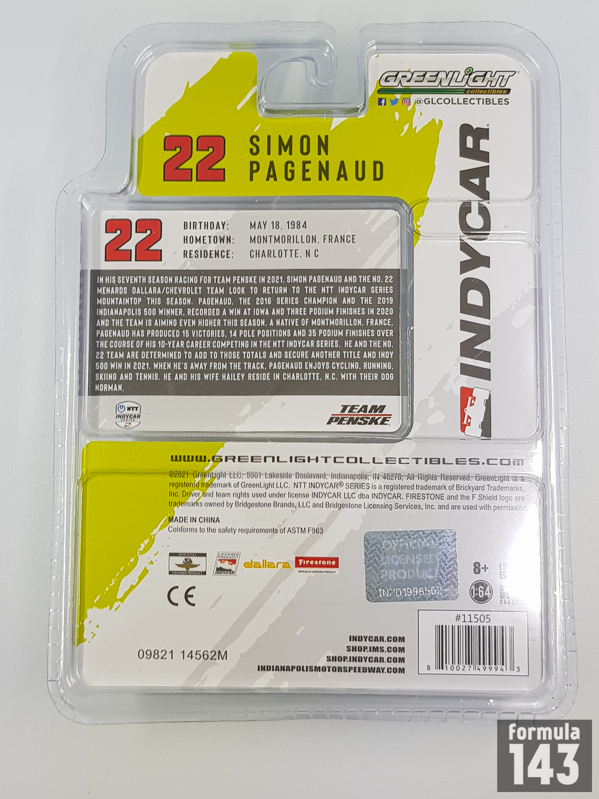 Team Penske entered four Chevrolet-powered cars for the full schedule in the 2021 NTT IndyCar Series – for Josef Newgarden, Will Power, Simon Pagenaud, and rookie Scott McLaughlin. Simon Pagenaud, 2016 series champion, drove the car #22 sponsored by Menards. Pagenaud scored two 3-place finishes – at the Firestone Grand Prix of St. Petersburg and in Indy 500, and was 8th in the championship. This model on hard tires (white Firestone labels) represents the regular Greenlight model.