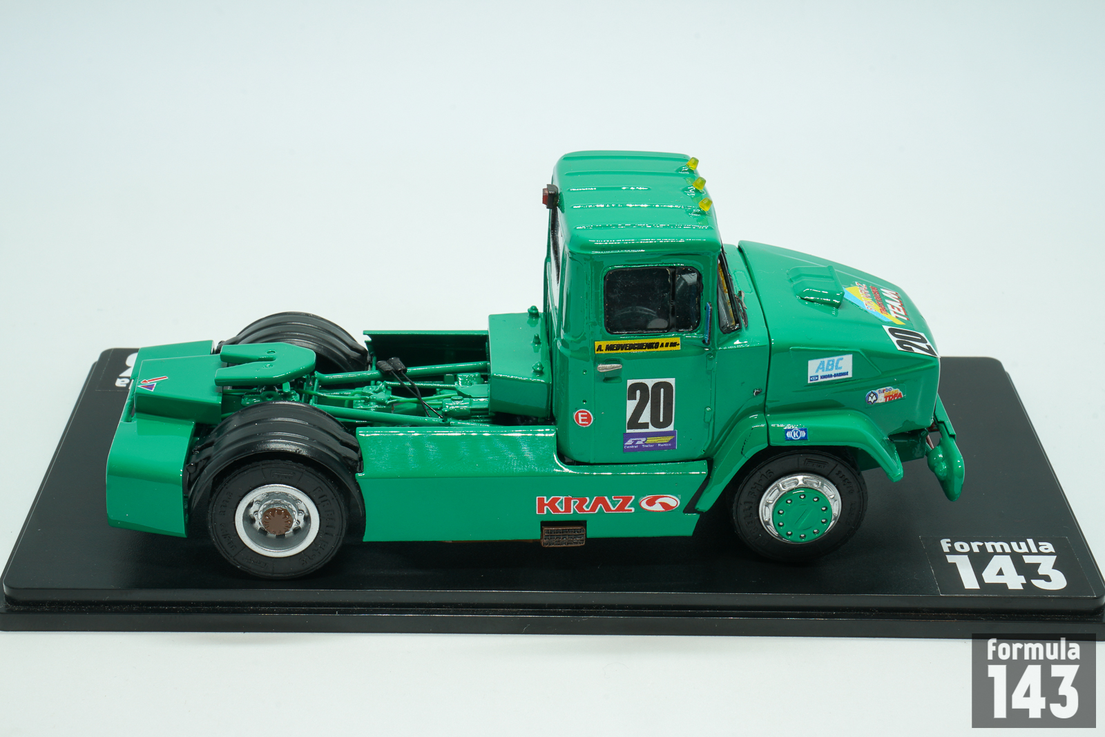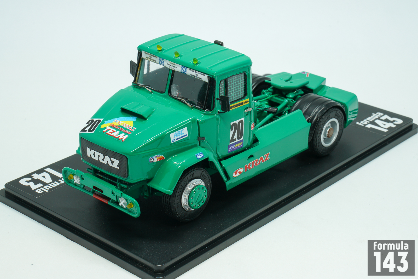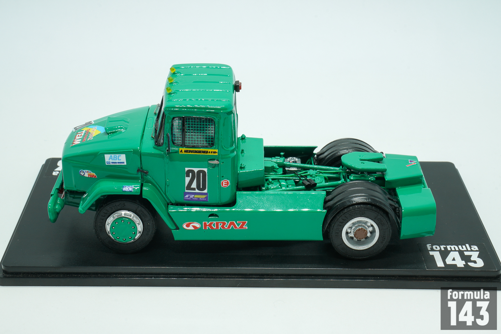 KrAZ (Kremenchukskyi Avtomobilnyi Zavod, Kremenchuk Automobile Plan) is a truck factory in Kremenchuk, Ukraine, founded in 1945. In early post-Soviet times, in the beginning of 1990s, KRAZ as some other ex-USSR truck manufacturers decided to try their luck in the increasingly popular European truck racing. Development of the racing truck begun in 1991 under the leadership of Vladimir Gavrilenko, ex racing driver and test engineer of the experimental workshop. According to the regulations, only trucks based on production models were allowed to participate in the races. However, KrAZ racing truck had little in common with the production model – at that time there was not even a 2-axle model in the KRAZ production line. It was empty under its hood, because the engine was installed behind the cab – this lowered the center of gravity of the car. And the engine itself was special. The idea to use regular YaMZ engines was immediately abandoned: the outdated design had a very weak potential for forcing. KRAZ turned for help to the Kharkov Malyshev plant, which then produced T-64 tanks and 5TDF multi-fuel engines for them. In the “tank” version its power was 750 hp, but for the racing KrAZ the engine was boosted to almost 1000 hp and tuned to use diesel fuel. The cabin panels were made of lightweight fiberglass, and the suspension was made completely independent.