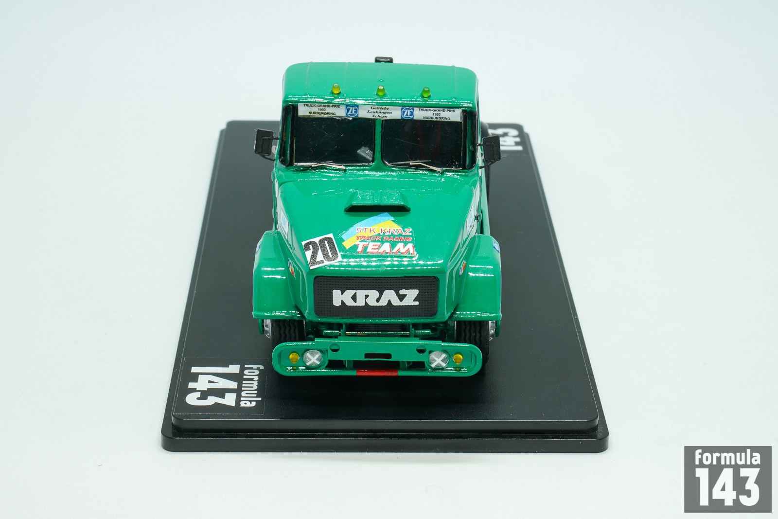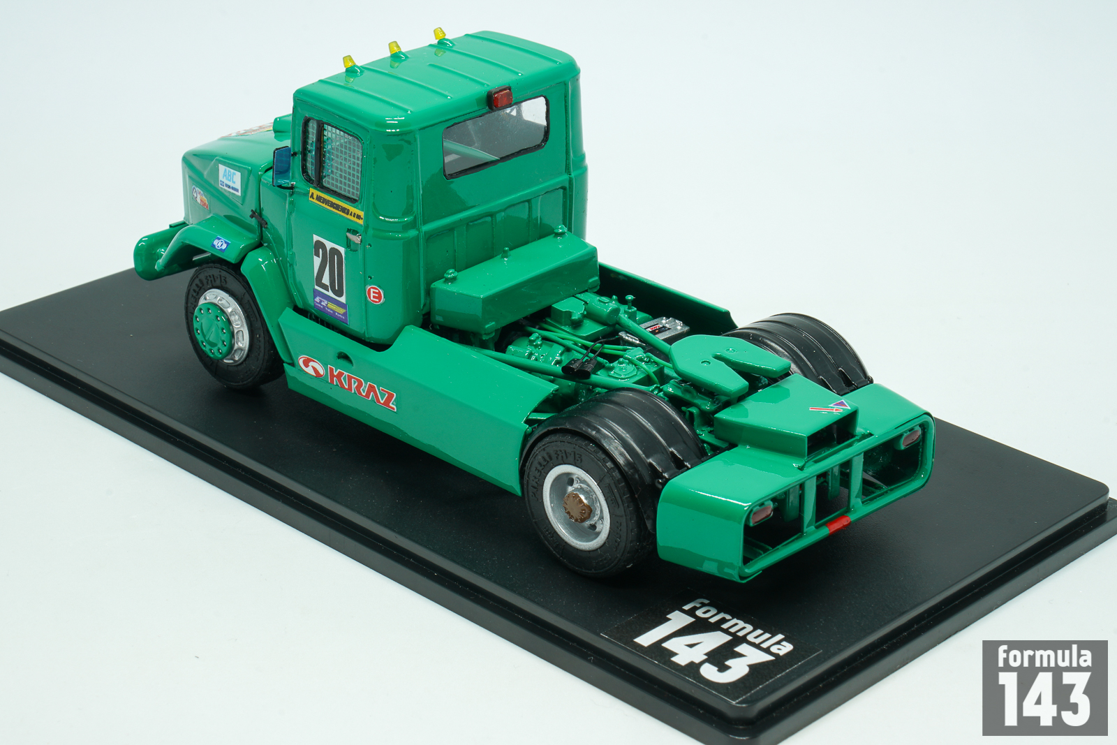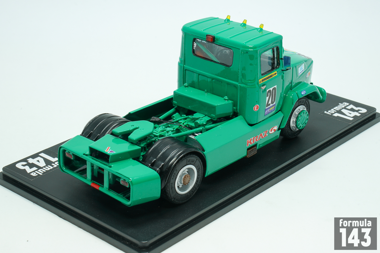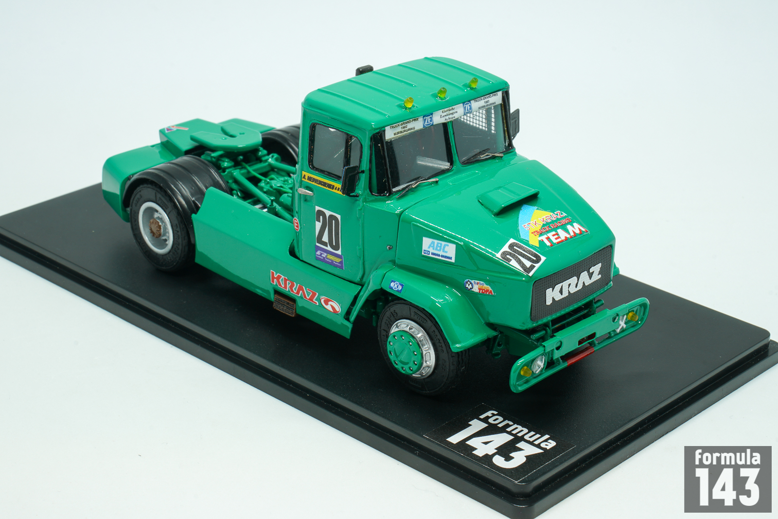 KrAZ (Kremenchukskyi Avtomobilnyi Zavod, Kremenchuk Automobile Plan) is a truck factory in Kremenchuk, Ukraine, founded in 1945. In early post-Soviet times, in the beginning of 1990s, KRAZ as some other ex-USSR truck manufacturers decided to try their luck in the increasingly popular European truck racing. Development of the racing truck begun in 1991 under the leadership of Vladimir Gavrilenko, ex racing driver and test engineer of the experimental workshop. According to the regulations, only trucks based on production models were allowed to participate in the races. However, KrAZ racing truck had little in common with the production model – at that time there was not even a 2-axle model in the KRAZ production line. It was empty under its hood, because the engine was installed behind the cab – this lowered the center of gravity of the car. And the engine itself was special. The idea to use regular YaMZ engines was immediately abandoned: the outdated design had a very weak potential for forcing. KRAZ turned for help to the Kharkov Malyshev plant, which then produced T-64 tanks and 5TDF multi-fuel engines for them. In the “tank” version its power was 750 hp, but for the racing KrAZ the engine was boosted to almost 1000 hp and tuned to use diesel fuel. The cabin panels were made of lightweight fiberglass, and the suspension was made completely independent.