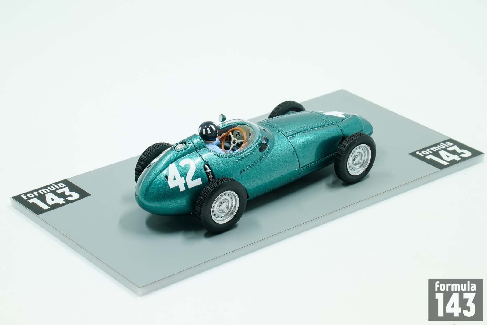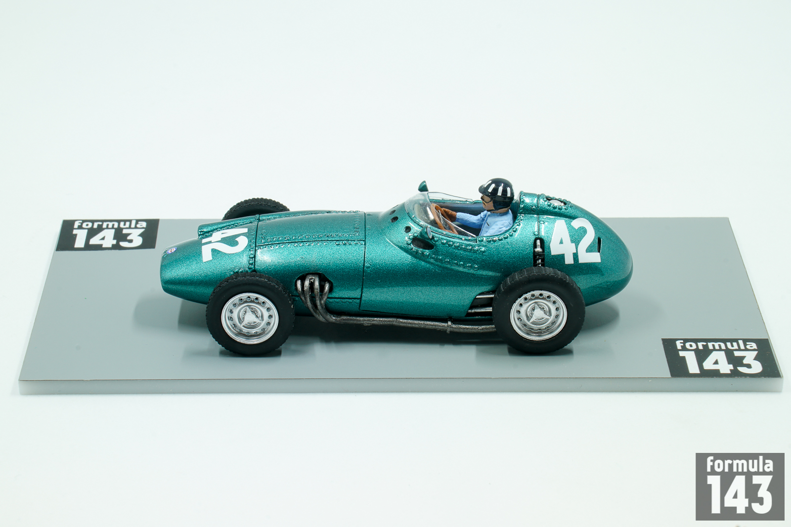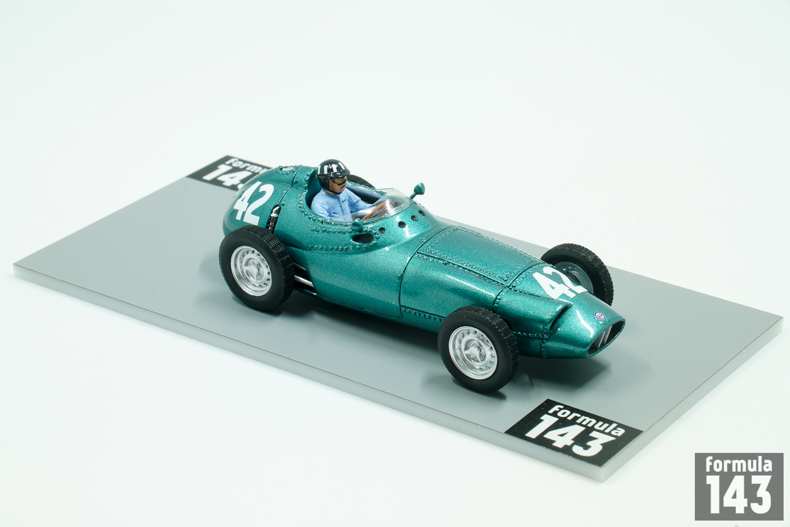 The Type 25 was BRM’s second car after Type 15 V16 designed in 1950. The P25 began racing in non-championship events in September 1955, and was used by works team until beginning of the 1960 season. The car designed by Tony Rudd used an extremely oversquare (4.05 x 2.95 in, 102.87 x 74.93 mm) 2.5 L atmospheric four-cylinder engine designed by Stewart Tresilian. The P25 was initially unsuccessful, not winning a race until a Jo Bonnier’s victory at the Dutch Grand Prix in 1959.