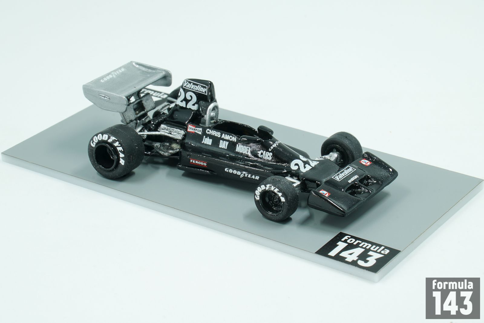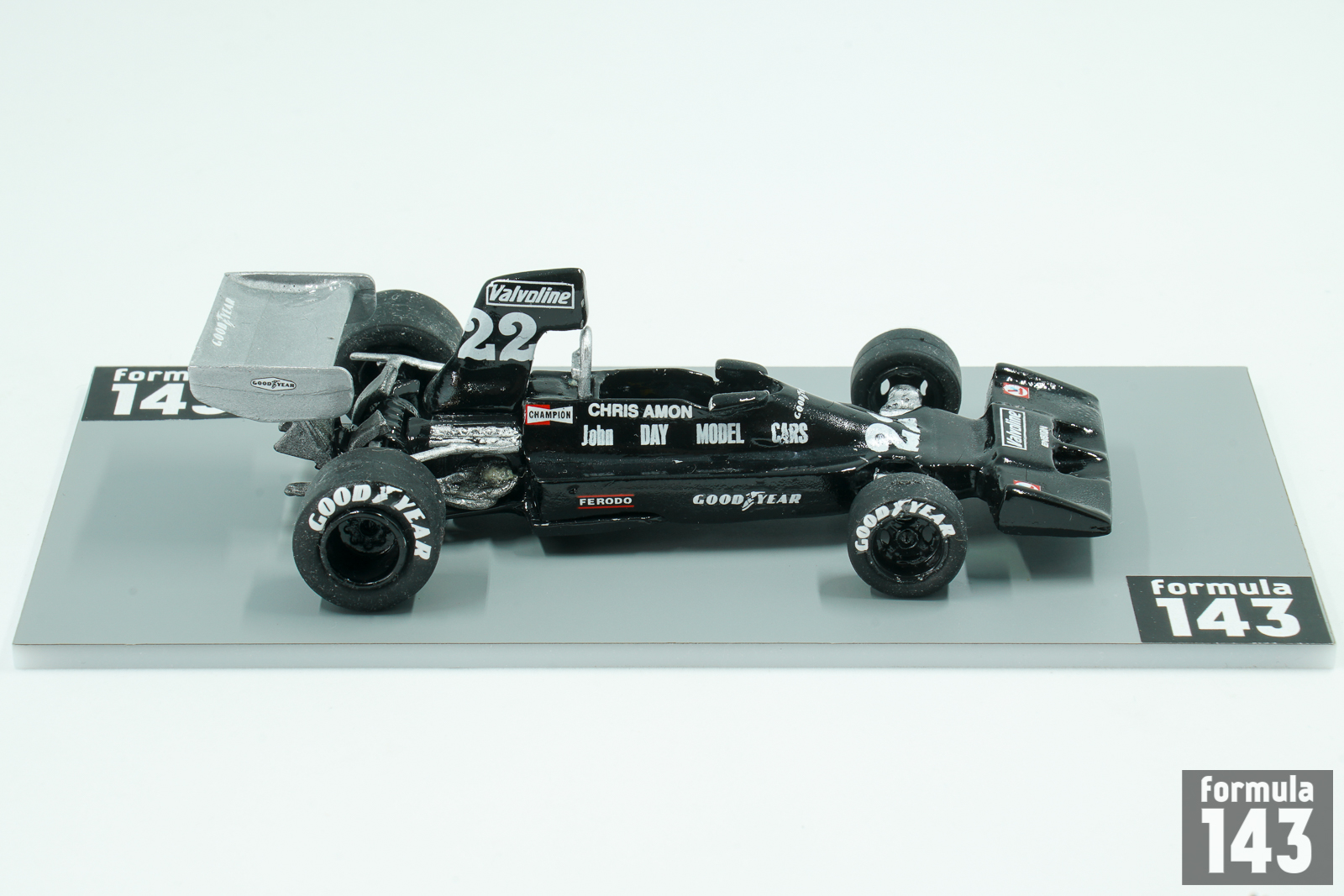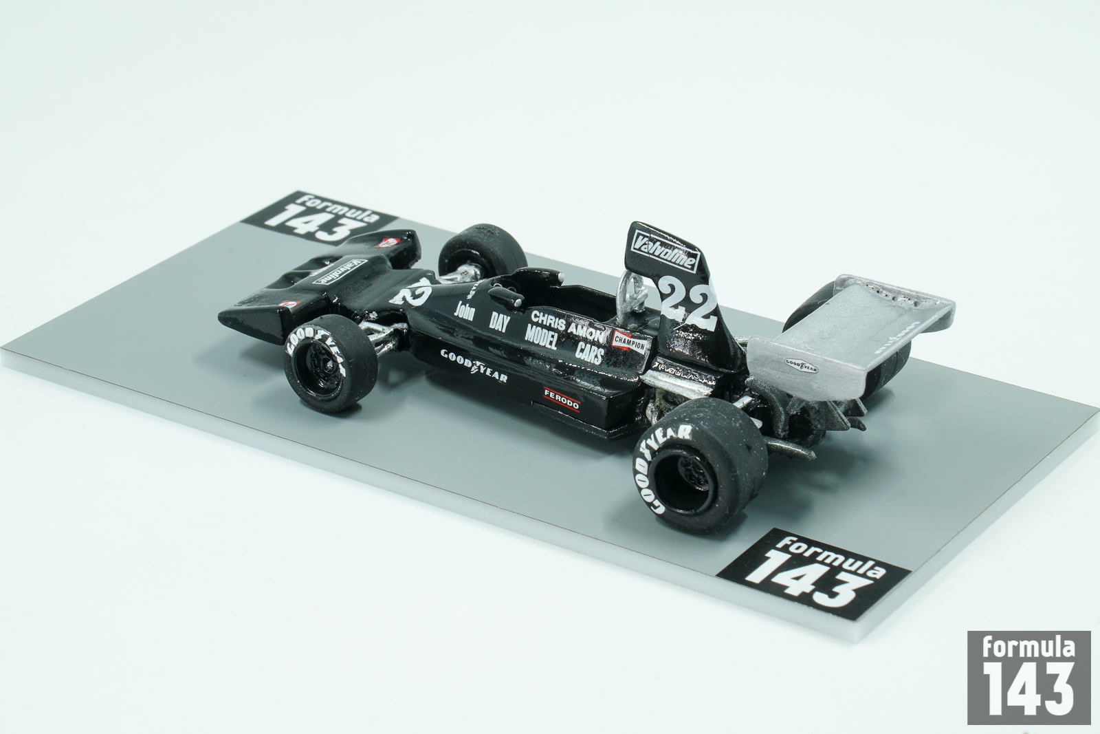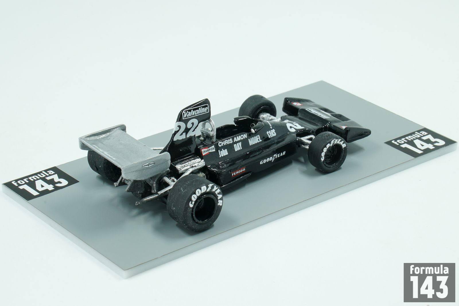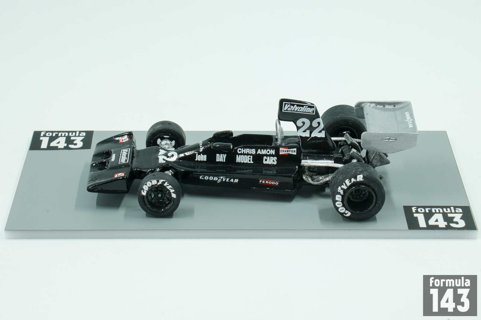 The N174 appeared in 1974 season was the second F1 car built by Ensign. Like N173 it comprised an aluminium monocoque, conventional outboard suspension, DFV engine and Hewland FGA400 gearbox. The car were used in 1974-75 and served on into 1976 when Amon placed drove it in tree races finishing 14th in South Africa, eighth at Long Beach and fifth in Spain. In the South African Grand Prix the team was sponsored by John Day Model Cars.