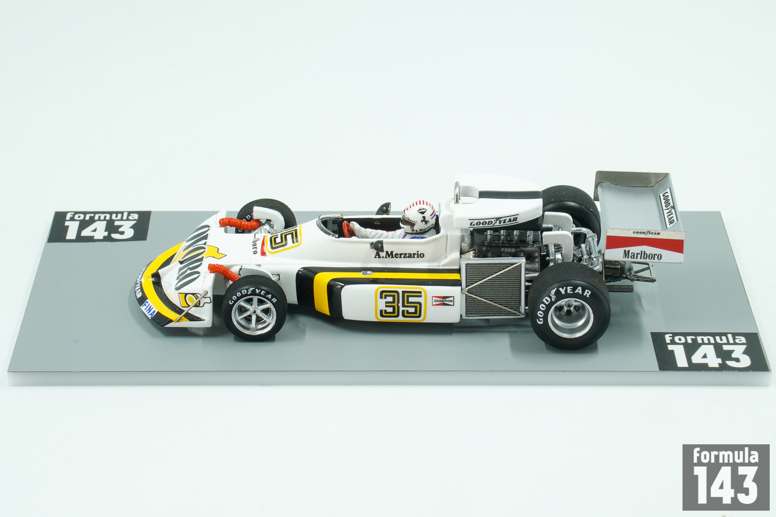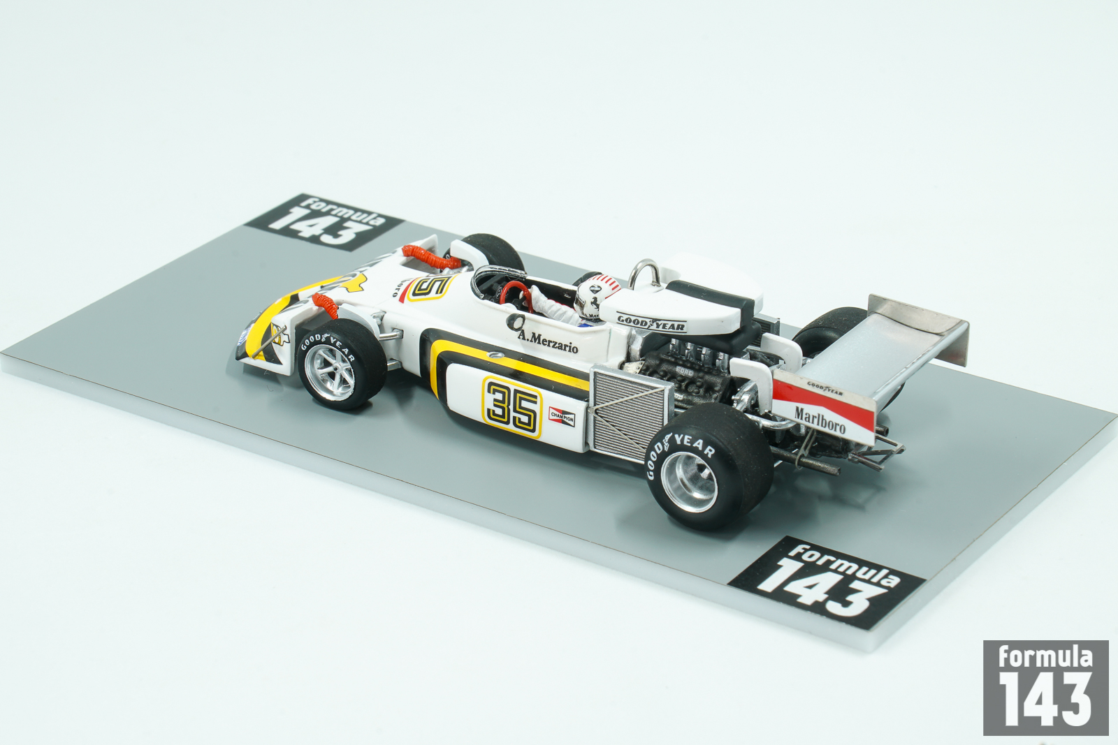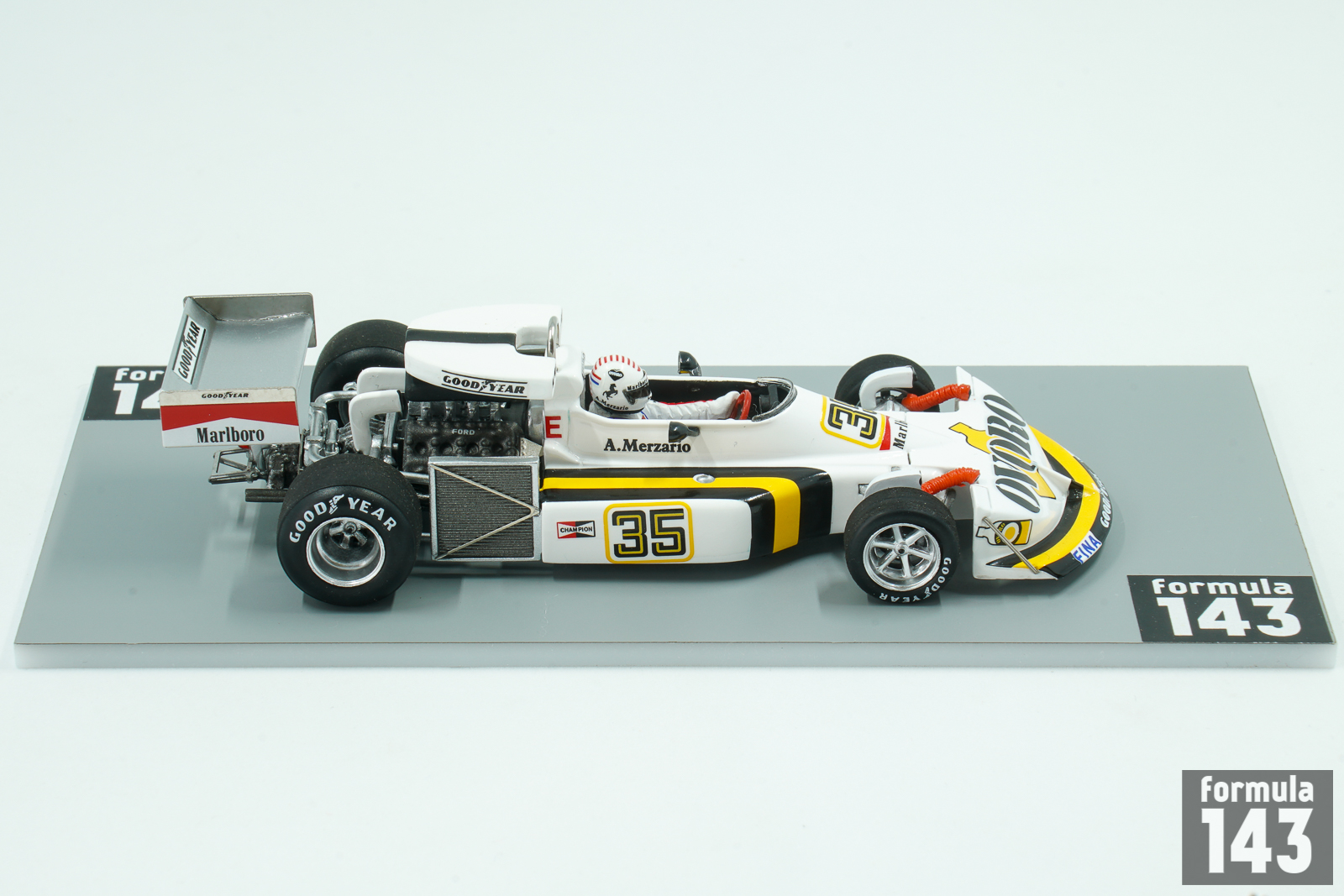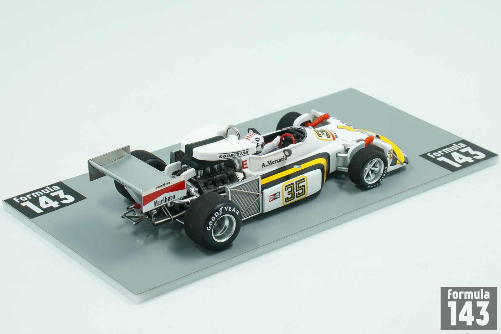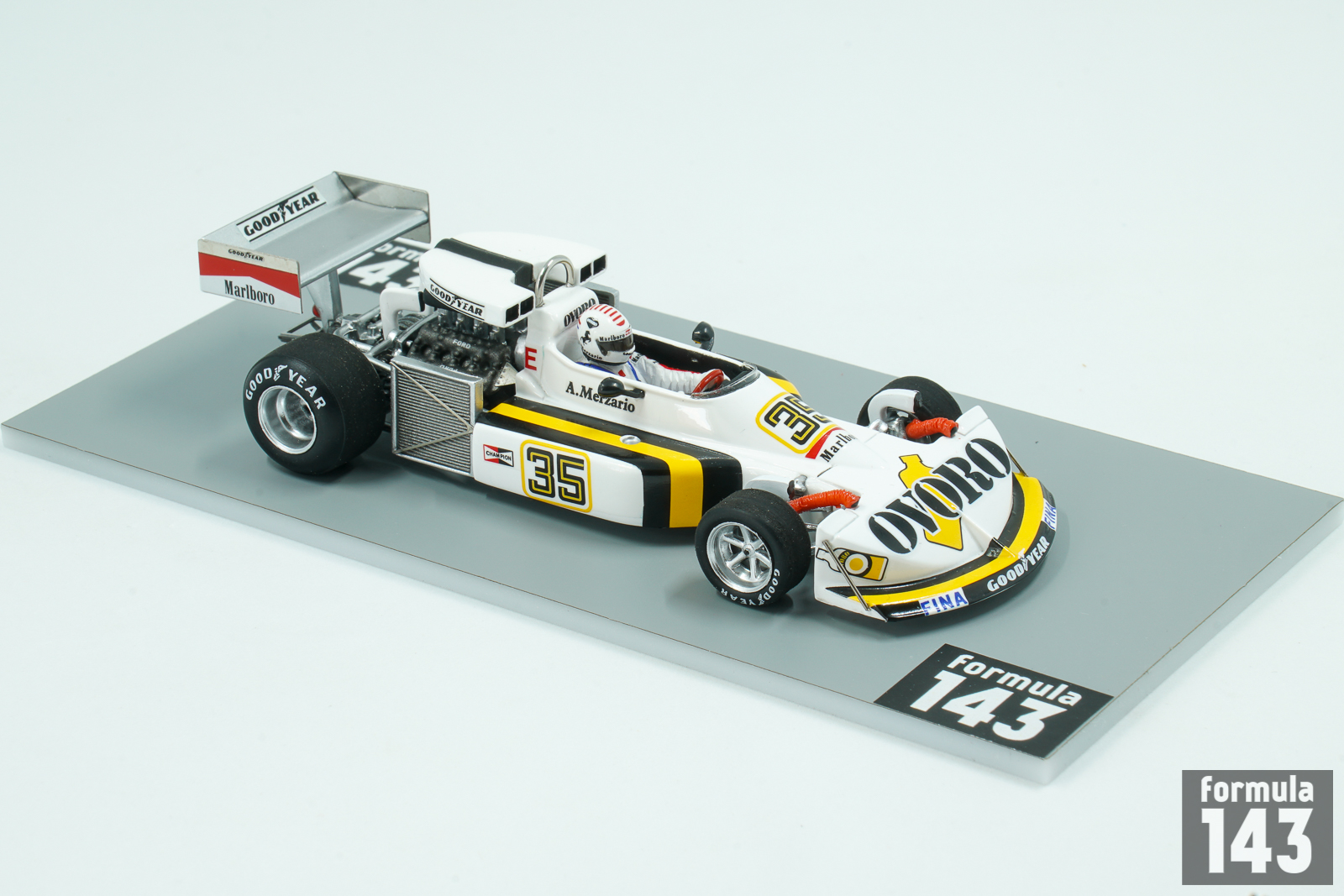 March F1 car for 1976 season was at the disposal of works March Engineering team with Ronnie Peterson, Hans-Joachim Stuck, Vittorio Brambilla, Arturo Merzario and Lella Lombardi. Due to a small budget, the cars tending to turn up in different liveries as race-by-race sponsorship deals were signed. Brambilla was entered under Beta sponsorship, Merzaio raced for Ovoro and Lombardi was sponsored by Lavazza. The models by Spark illustrates the car driven by Merzario in the 1976 Spanish Grand Prix. Merzario retired from this race and scored no points in his seven races with March in the 1976, as well as in the following six races with Williams entered by Walter Wolf Racing.