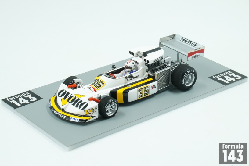 March F1 car for 1976 season was at the disposal of works March Engineering team with Ronnie Peterson, Hans-Joachim Stuck, Vittorio Brambilla, Arturo Merzario and Lella Lombardi. Due to a small budget, the cars tending to turn up in different liveries as race-by-race sponsorship deals were signed. Brambilla was entered under Beta sponsorship, Merzaio raced for Ovoro and Lombardi was sponsored by Lavazza. The models by Spark illustrates the car driven by Merzario in the 1976 Spanish Grand Prix. Merzario retired from this race and scored no points in his seven races with March in the 1976, as well as in the following six races with Williams entered by Walter Wolf Racing.