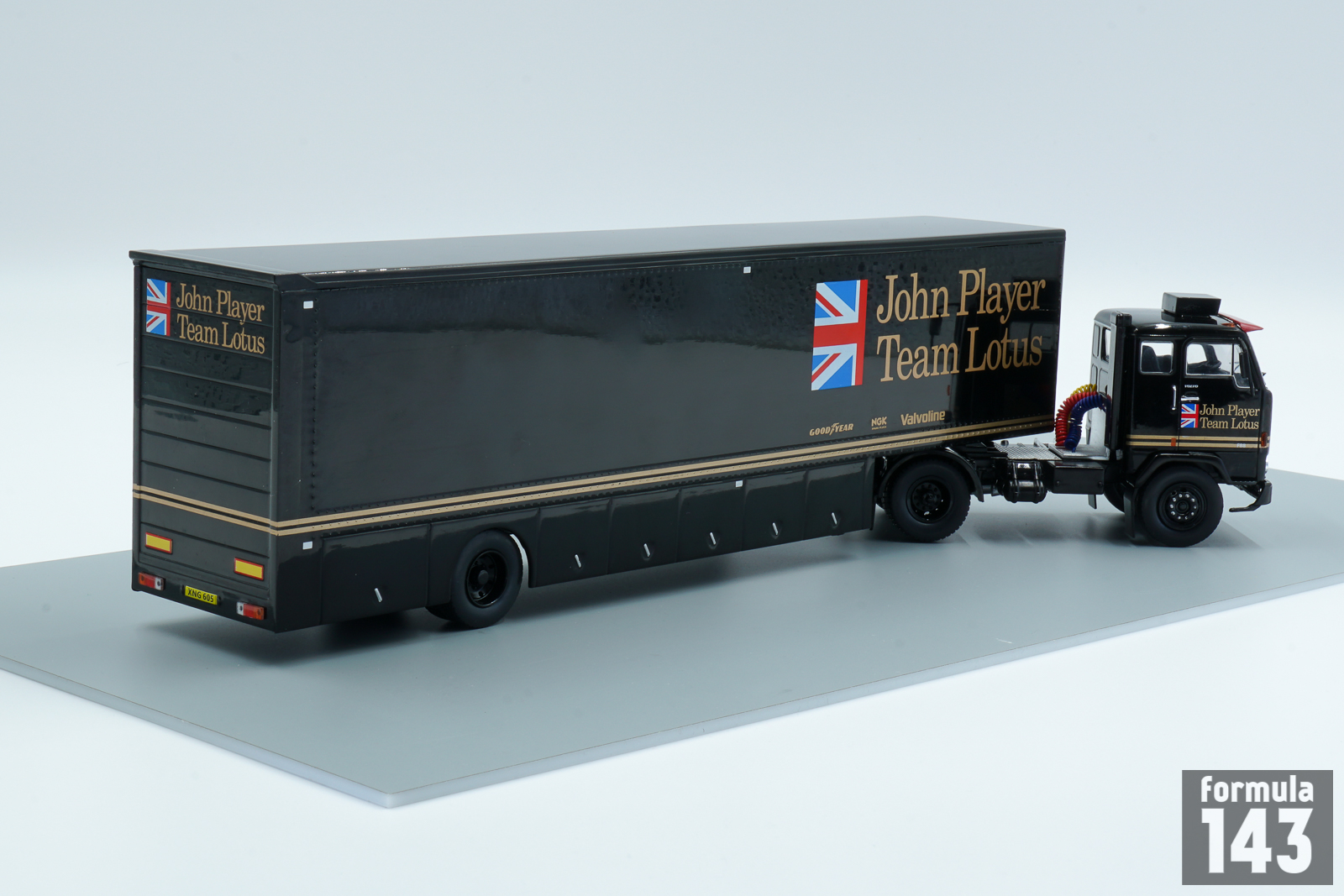 The Volvo F88/F89 was a series of heavy-duty trucks produced by Swedish automaker Volvo between 1965 and 1977. The F88 was a little bit smaller than F89 and was powered by 9602 cc turbodiesel engine developing around 300 hp. This model represents racing car transporter in the colors of John Player Team Lotus used in the 1978 season.
