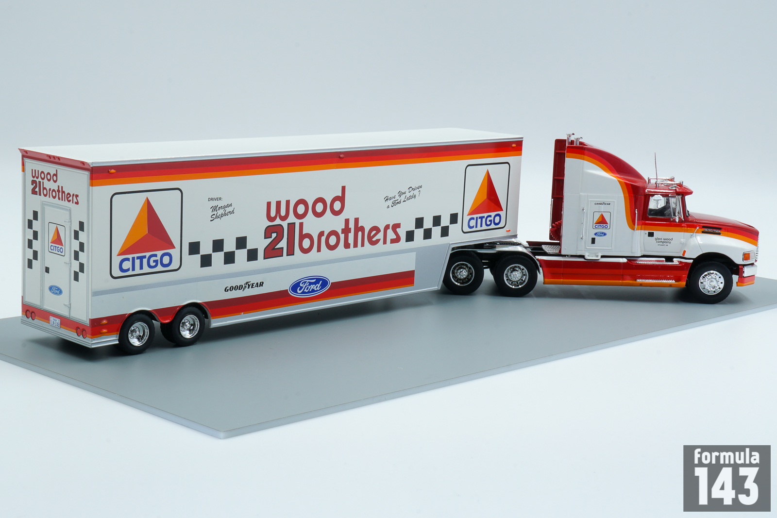 Ford Aeromax was first Ford aerodynamic semitrailer truck, introduced in 1988. Named Aeromax L9000, the new design was an extensive upgrade of the L-9000 truck from Ford L-series. The Aeromax was a popular racing car transporter for many NASCAR teams in 1990s. This model represents truck used by Wood Brothers Racing team in the seasons 1992-1995 for car No. 21 driven by Morgan Shepherd and sponsored by Citgo, an Americal petroleum company.