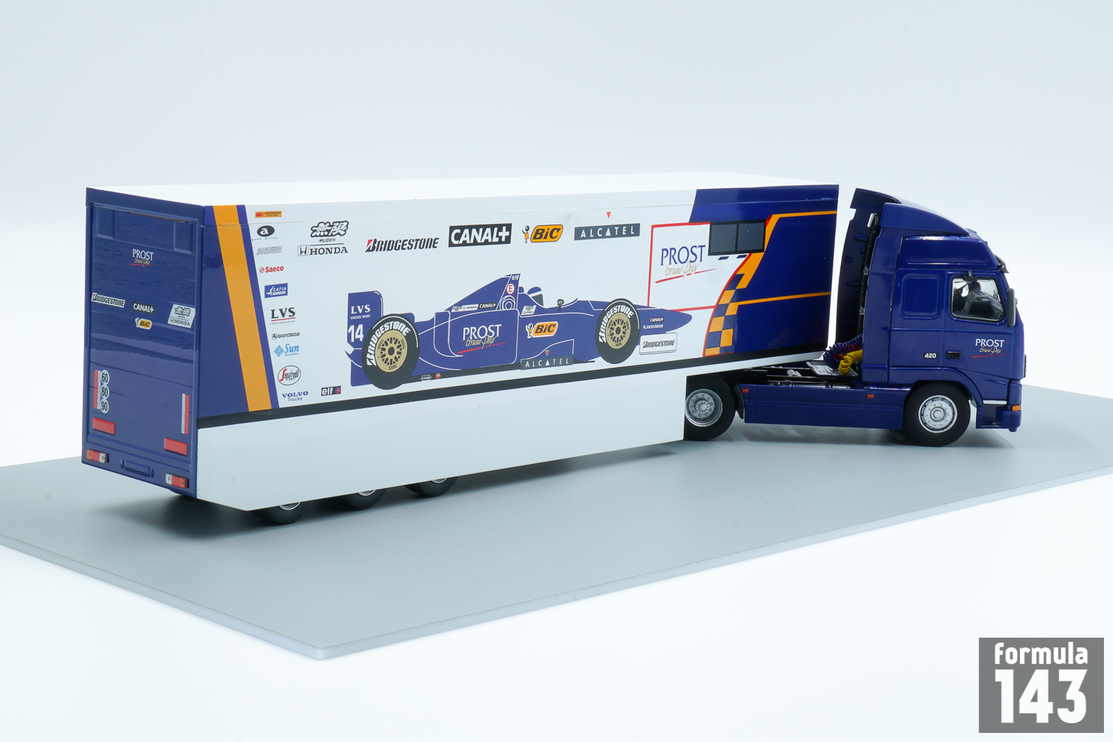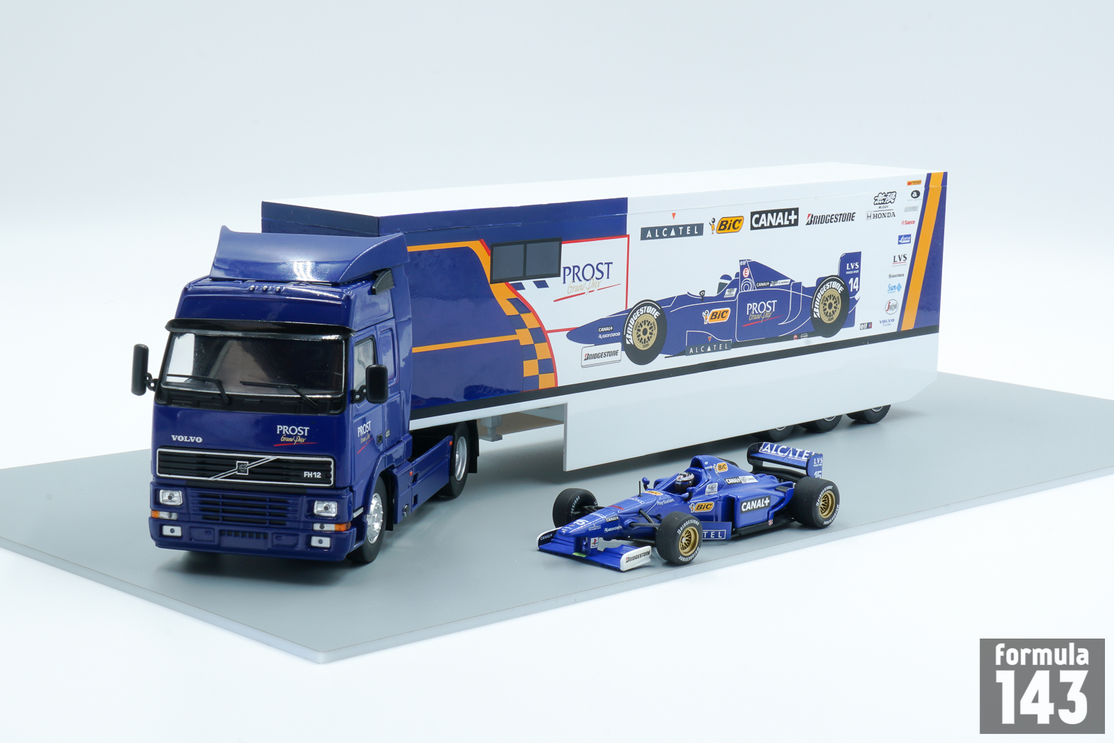The Volvo FH heavy truck range was originally introduced in late 1993 as the FH12 and FH16 as a replacement for the F cabover series in production for almost 15 years. There were two models, FH12 and FH16 which shared common cabs and chassis. First generation of these trucks produced in 1993-1998 was powered by D12A 12.1 litre engine developing 309 kW. Many Formula 1 teams used FH12 as racing car transporters in 1990s-2000s. This scale model represents transporter truck of Prost Grand Prix team in 1997.