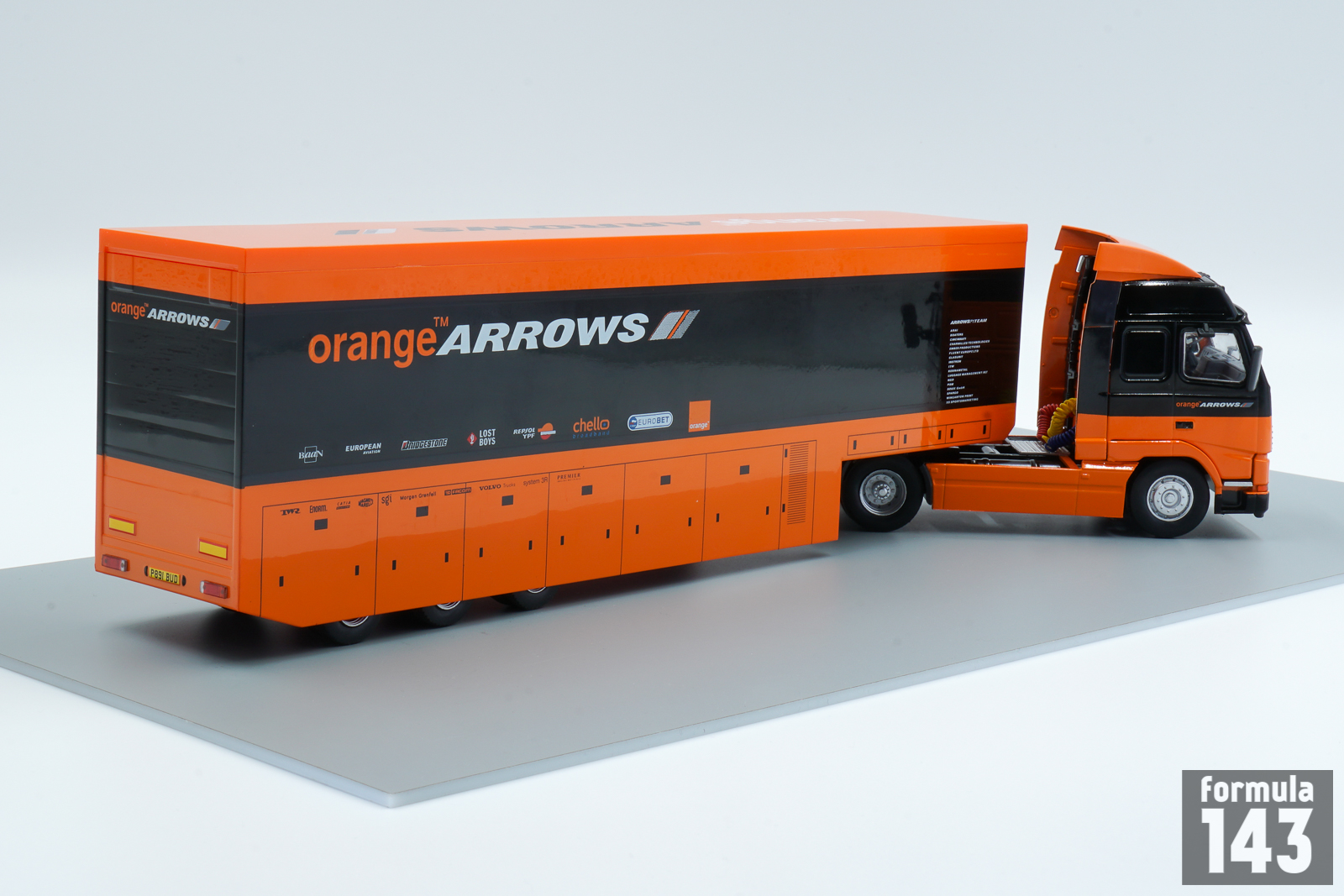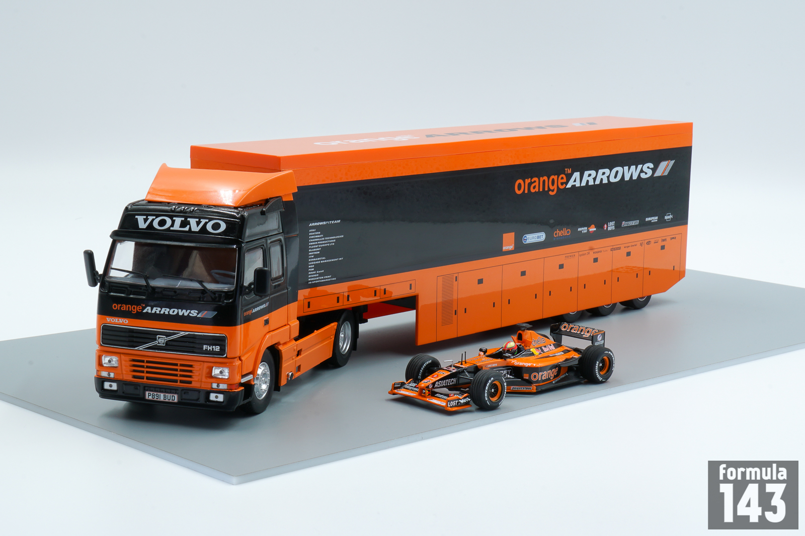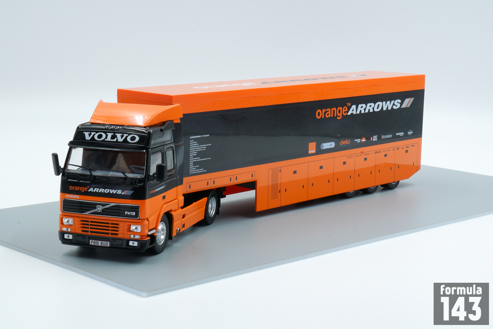 The Volvo FH heavy truck range was originally introduced in late 1993 as the FH12 and FH16 as a replacement for the F cabover series in production for almost 15 years. There were two models, FH12 and FH16 which shared common cabs and chassis. First generation of these trucks produced in 1993-1998 was powered by D12A 12.1 litre engine developing 309kW. Many Formula 1 teams used FH12 as racing car transporters in 1990s-2000s. This scale model represents transporter truck of Orange Arrows team in 2001.