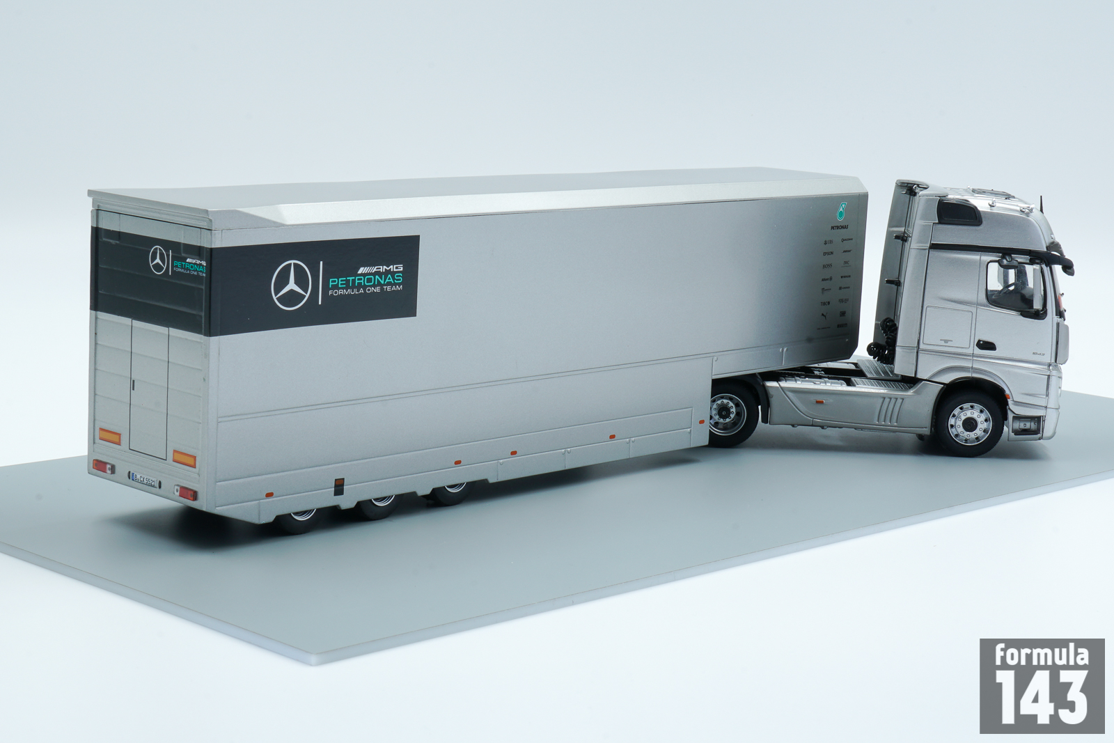 The Mercedes-Benz Actros was introduced in 1996. In 2002, Daimler Trucks/Lorries launched version II of the Actros and in 2007, launched the version III. The fourth generation of the Actros, officially named “the New Actros”, was launched in July 2011.The New Actros trucks were powered by inline six-cylinder diesel Mercedes-Benz engine developing from 238 to 625 hp depending on the model. The Actros was and is a popular choice for race cars transporters since end of 1990s until 2020s. This model represent Actros race car transporter by Mercedes AMG Petronas F1 Team from 2016 season.