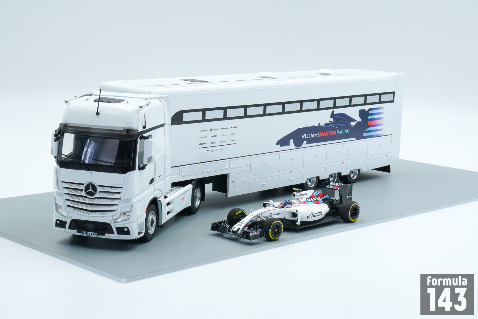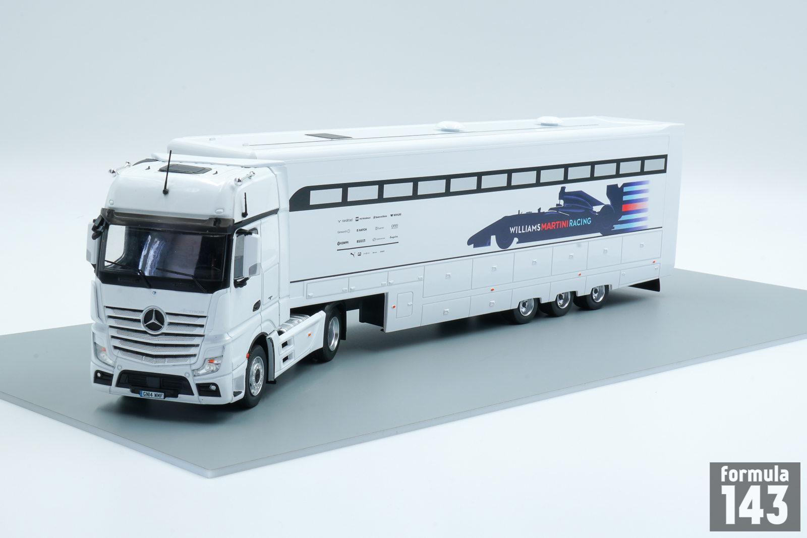 The Mercedes-Benz Actros was introduced in 1996. In 2002, Daimler Trucks/Lorries launched version II of the Actros and in 2007, launched the version III. The fourth generation of the Actros, officially named “the New Actros”, was launched in July 2011.The New Actros trucks were powered by inline six-cylinder diesel Mercedes-Benz engine developing from 238 to 625 hp depending on the model. The Actros was and is a popular choice for race cars transporters since end of 1990s until 2020s. This model represent Actros race car transporter by Williams Martini Racing F1 Team from 2016 season.